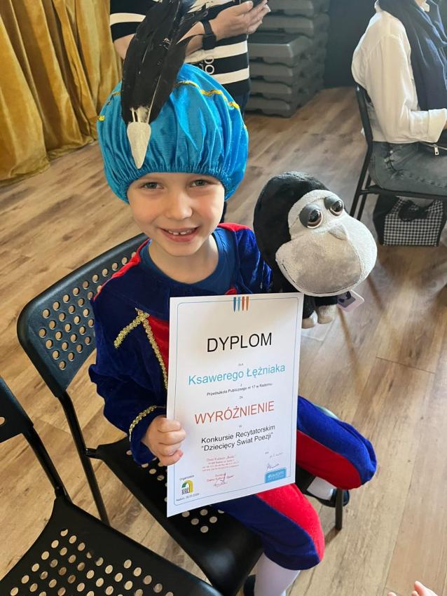 Gratulacje dla Ksawerego, który dostał wyróżnienie w konkursie recytatorskim "Dziecięcy Świat Poezji" organizowanym przez Dom Kultury "Borki" w Radomiu.