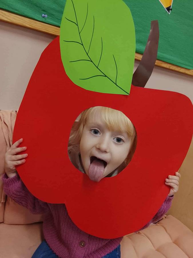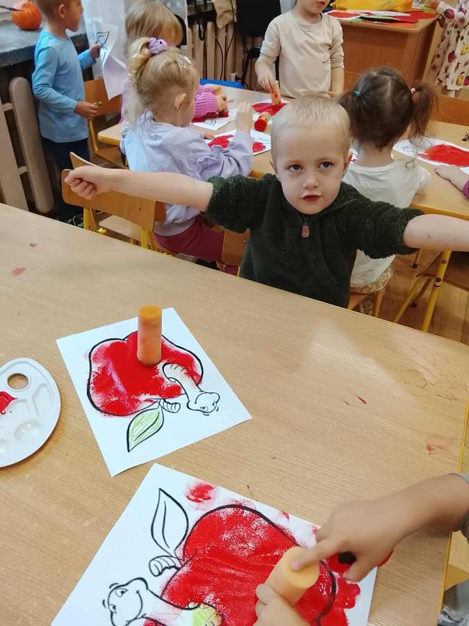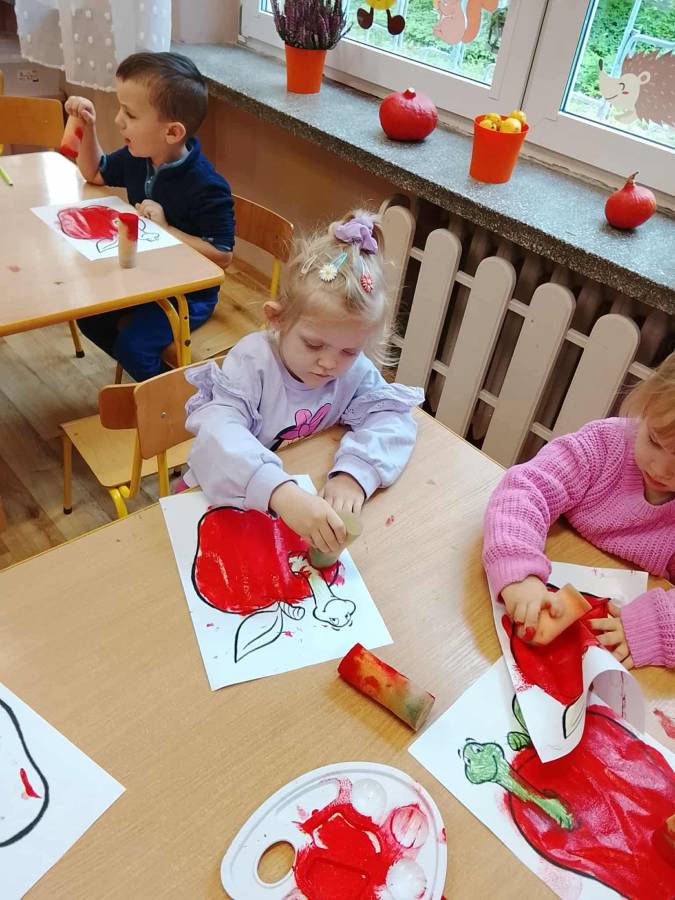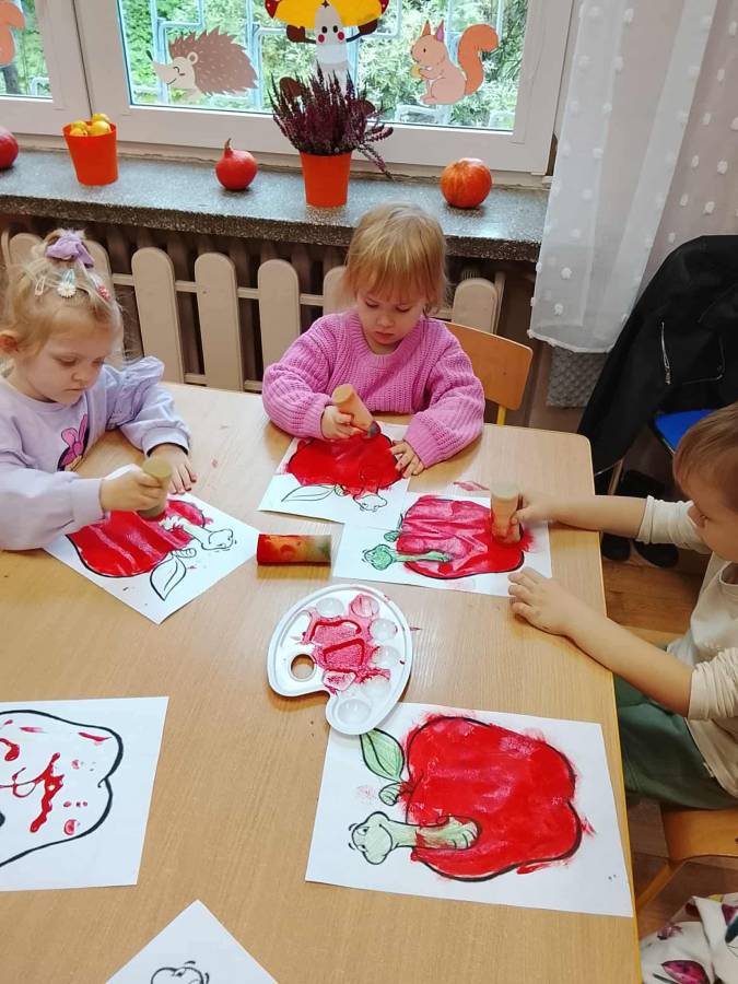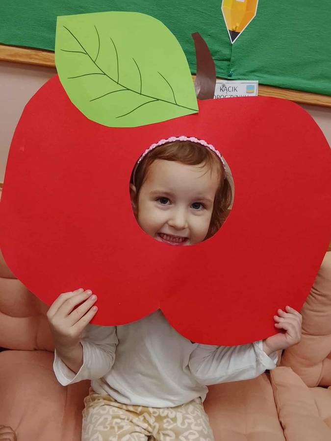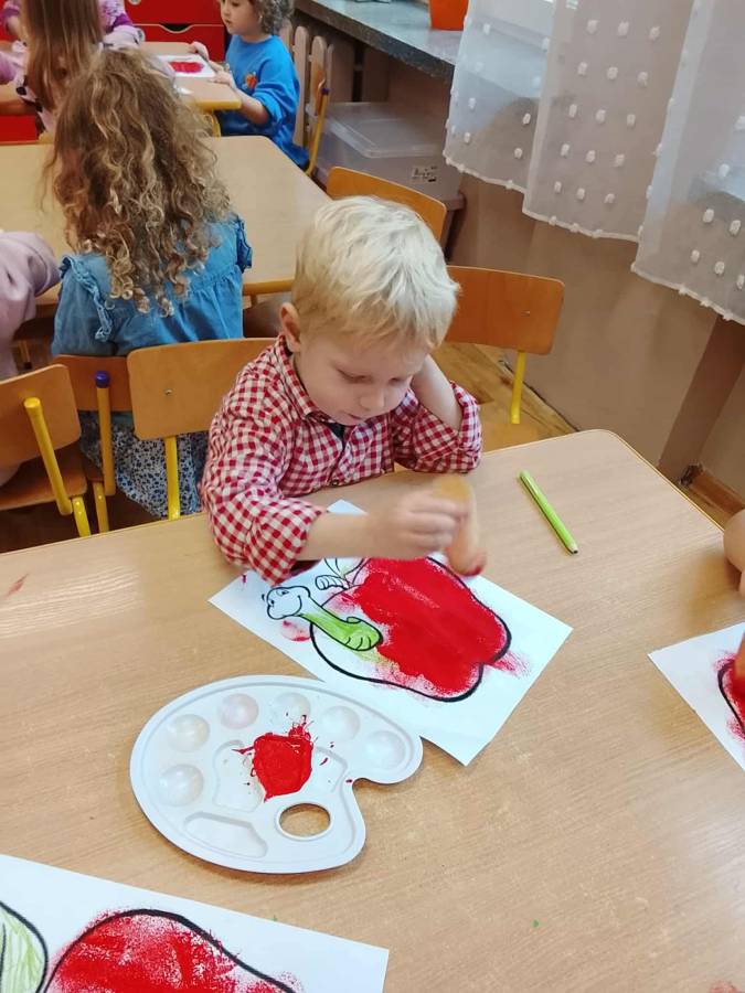 Dzień Jabłka w Kropeczkach wypełniony był jabłuszkowymi zajęciami. Tańczyliśmy jabłkowe piosenki, czytaliśmy jabłkowe wierszyki i wykonaliśmy malowane jabłuszka.