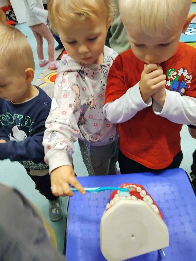 Ślimaczki i Jagódki odwiedziła dzisiaj Pani stomatolog, która pokazała jak prawidłowo szczotkować i dbać o zęby, a także przeprowadziła przegląd stomatologiczny. Dzielne przedszkolaki w nagrodę otrzymały naklejki i dyplomy.