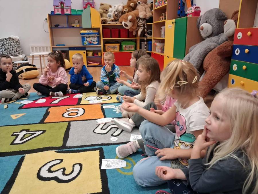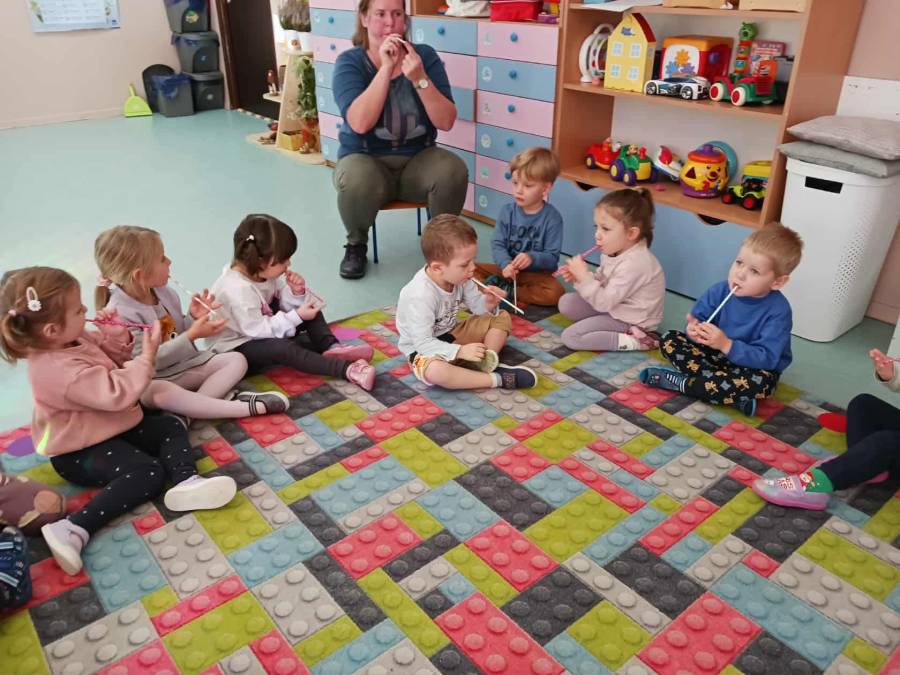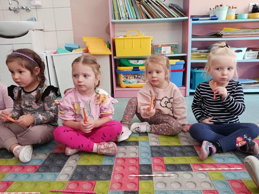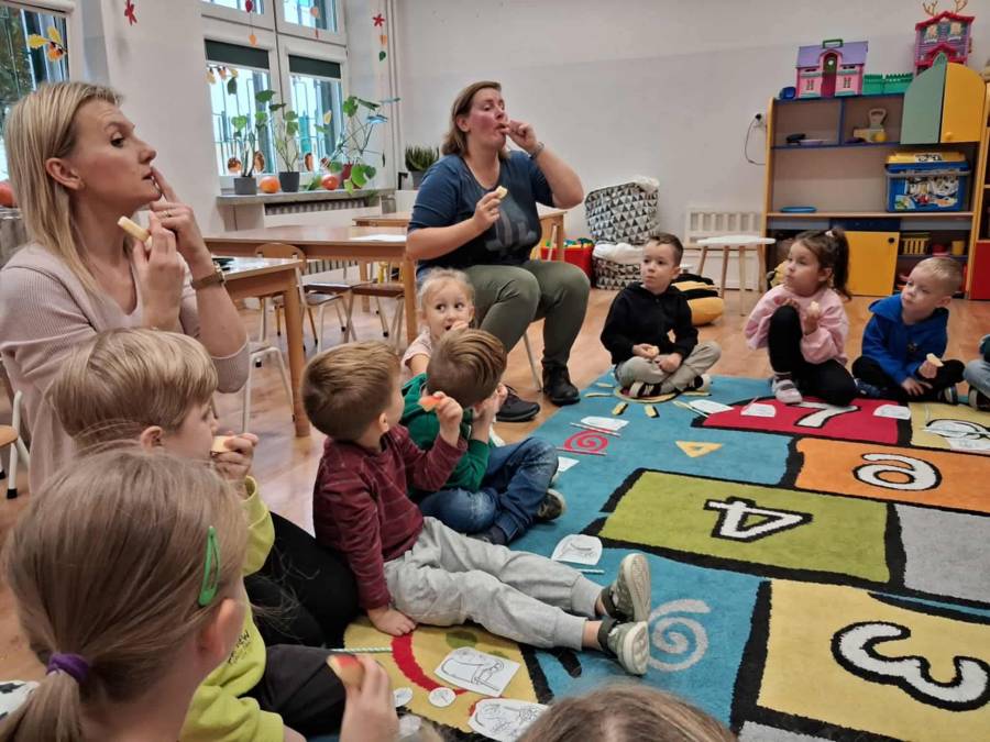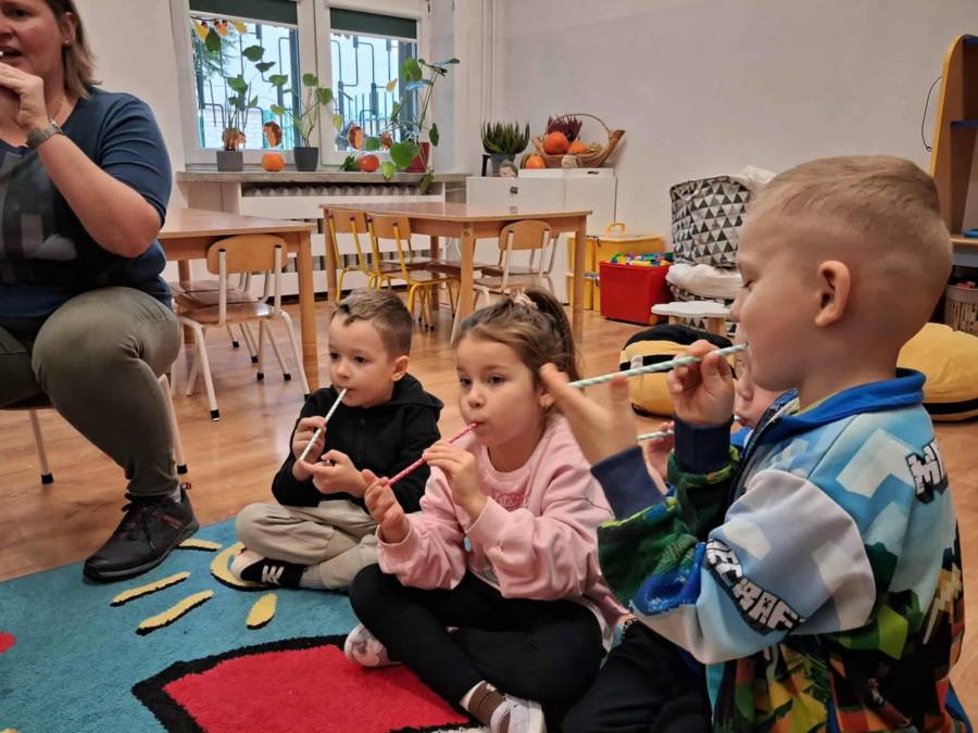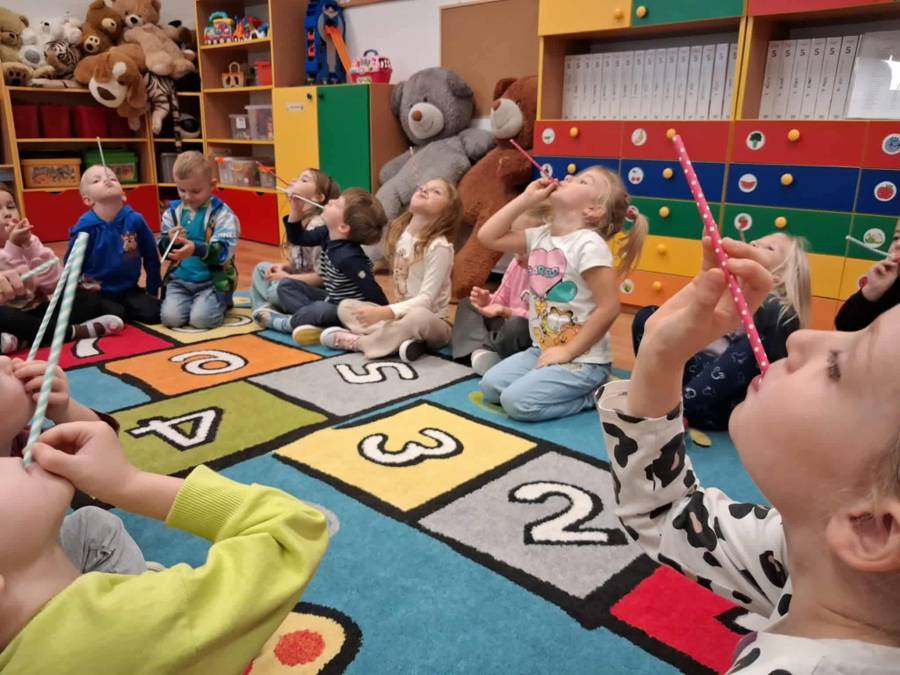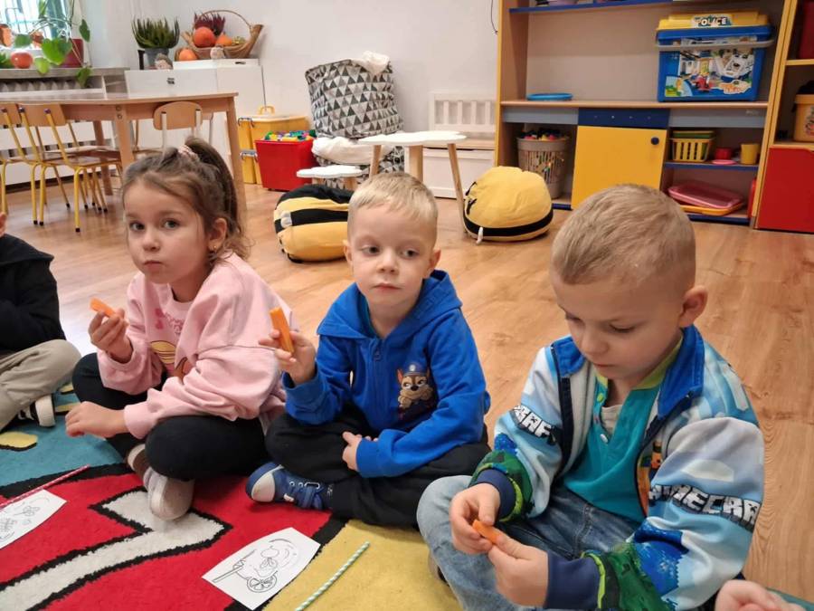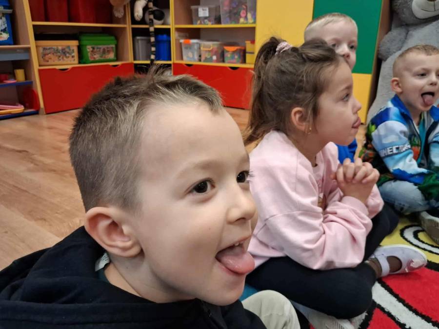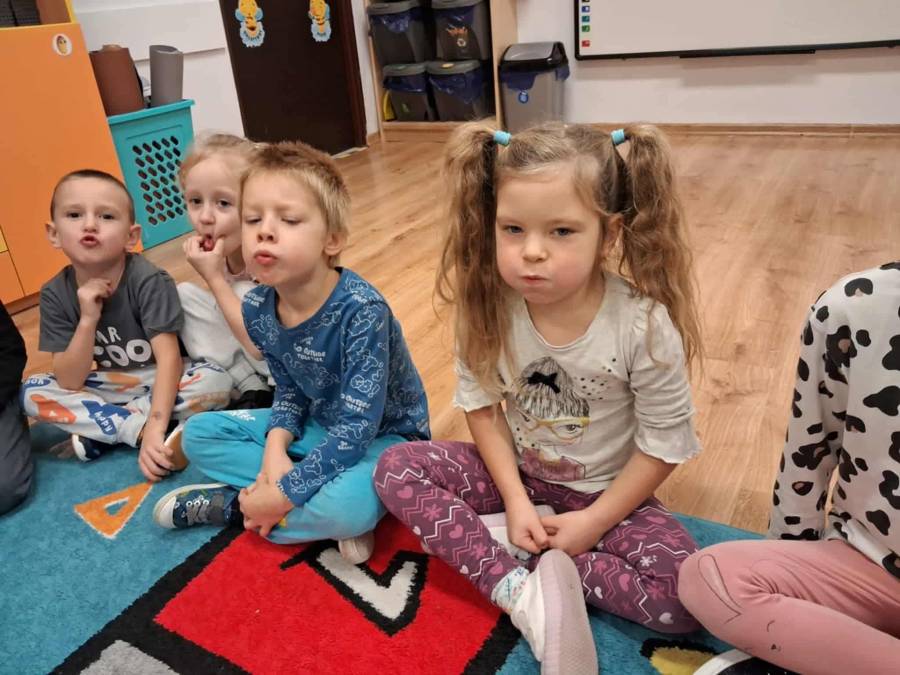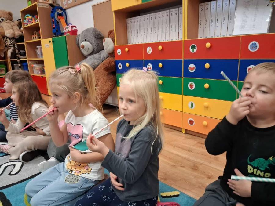 W grupach Ślimaczki i Pszczółki w naszym przedszkolu odbyły się wyjątkowe zajęcia w ramach Ogólnopolskiego Projektu Edukacyjnego Logopedyczny kalendarz świąt nietypowych. Podczas zajęć dzieci usprawniały aparat mowy oraz wzmacniały mięśnie całego ciała poprzez różnorodne ćwiczenia ruchowe i artykulacyjne. Następnie z wykorzystaniem słomek przedszkolaki wykonywały ćwiczenia oddechowe, które wspomagały naukę prawidłowej realizacji głosek, w tym głosek szumiących. Dzieci uczyły się również prawidłowo gryźć, żyć i chrupać. W dalszej części zajęć dzieci zostały zapoznane z twórczością Jana Brzechwy. W trakcie słuchania wiersza Na straganie przedszkolaki rozpoznawały warzywa.