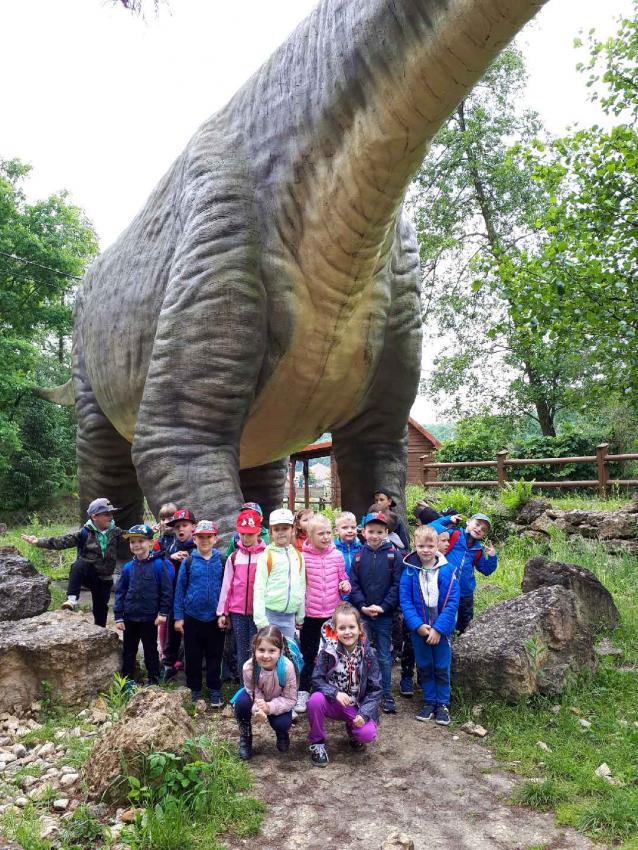 W dniu 18.05.2018 r. dzieci z grupy VII i VIII wybrały się na wycieczkę do Bałtowa. Zwiedziły Jura Park –wędrowały ścieżką dydaktyczną. Świat i środowisko dinozaurów starała się przybliżyć przewodniczka. Dzięki jej opowieścią dzieci dowiedziały się wielu ciekawostek o tych niesamowitych stworzeniach. Pośród różnych dinozaurów mogliśmy zobaczyć m.in. groźnego tyranozaura czy też ogromnego diplodoka.