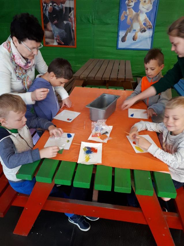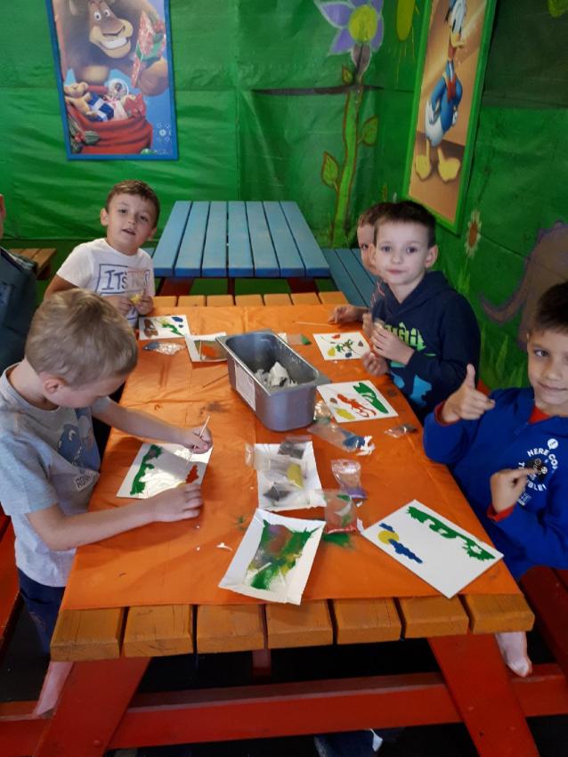 Byliśmy na warsztatach pt: „Malowanie piaskiem” –dzieci wykonały piękne obrazki przedstawiające  dinozaury.