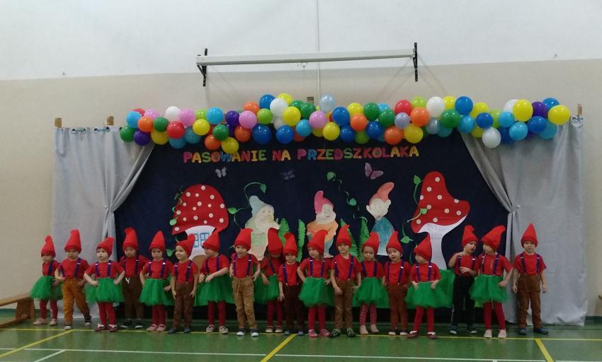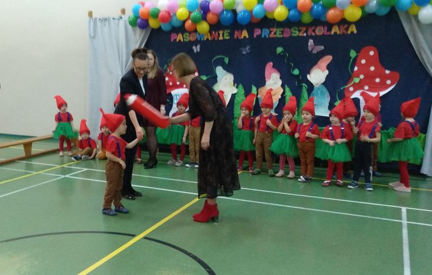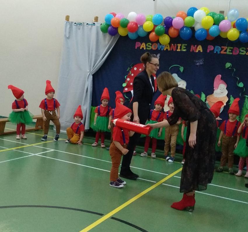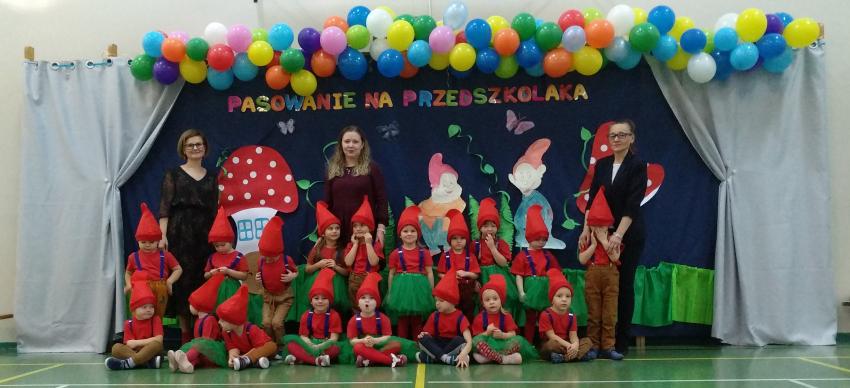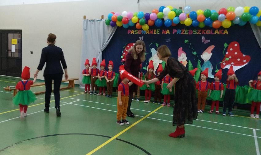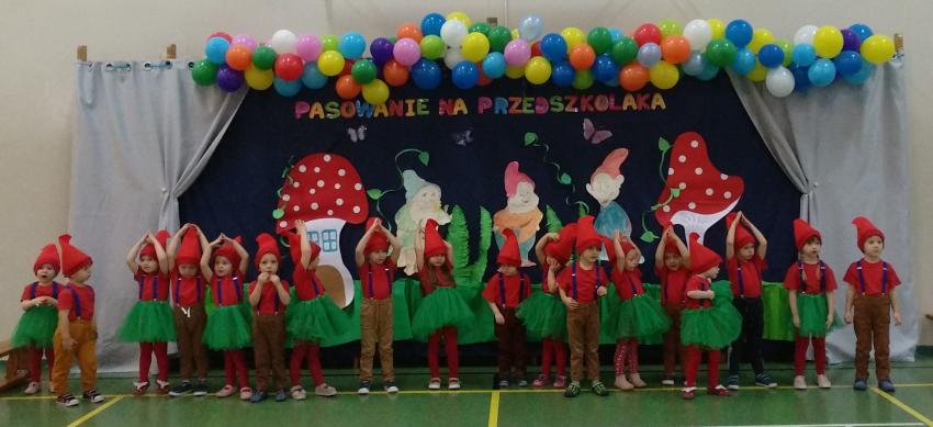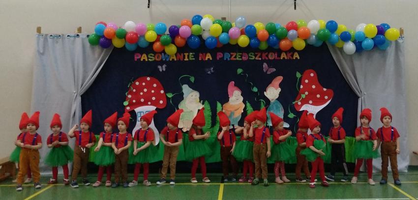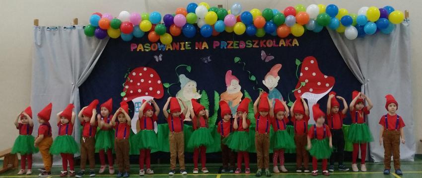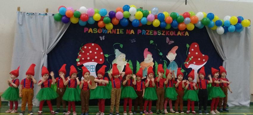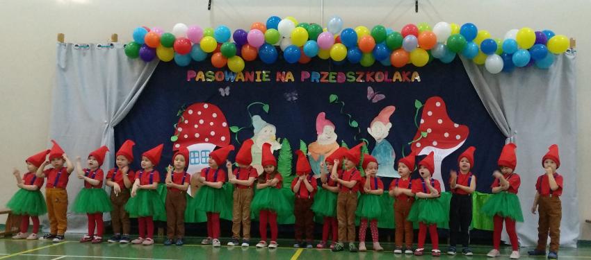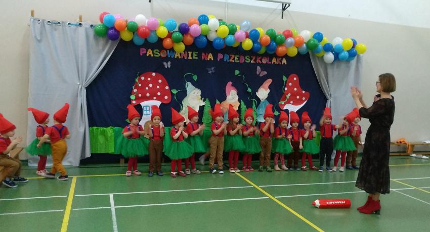 „Pasowanie na przedszkolaka” w grupie I „Krasnoludki” odbyło się 23 listopada 2021 r. Dzieci w tym dniu były prawdziwymi krasnalami, które zaprezentowały swoje umiejętności wokalne, taneczne oraz recytatorskie. Było to pierwsze wystąpienie Krasnoludków, z którym poradziły sobie na medal. Po zakończeniu części artystycznej nadszedł czas na uroczyste pasowanie każdego dziecka na przedszkolaka. Pani Dyrektor za pomocą „czarodziejskiego ołówka" przyjęła z radością nasze najmłodsze dzieci do wielkiej przedszkolnej rodziny. Na pamiątkę tego ważnego wydarzenia każdy przedszkolak otrzymał dyplom pasowania.