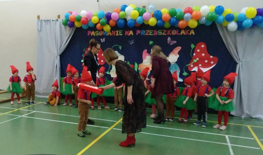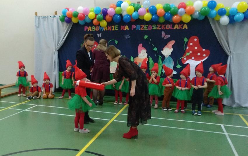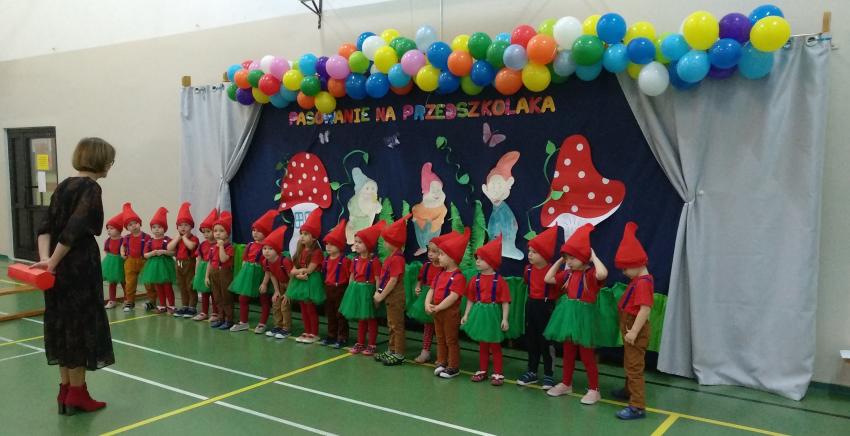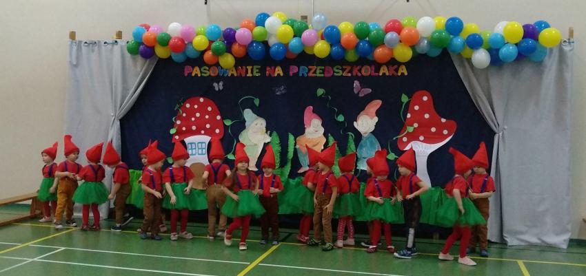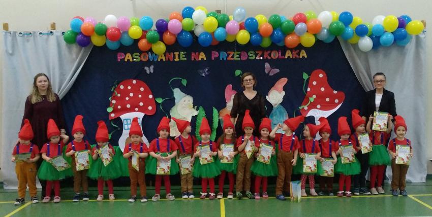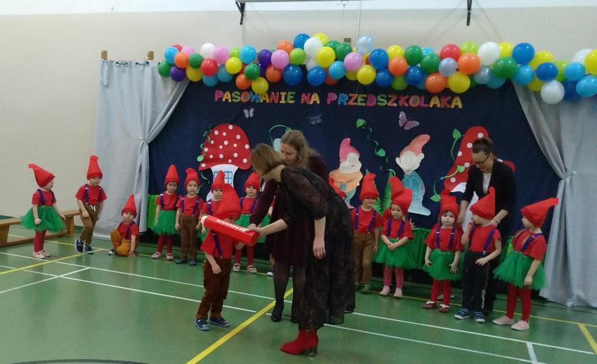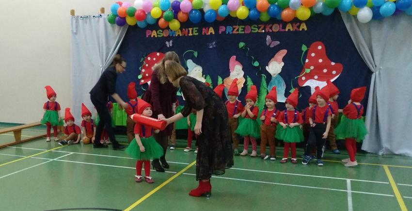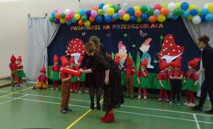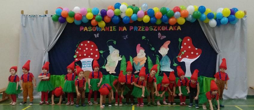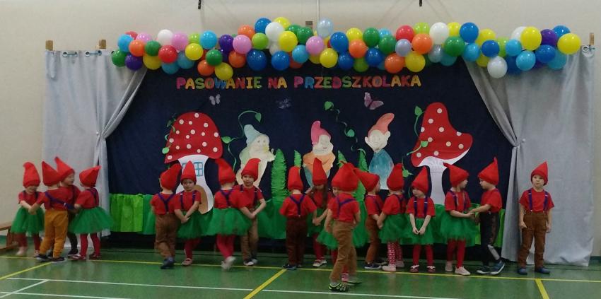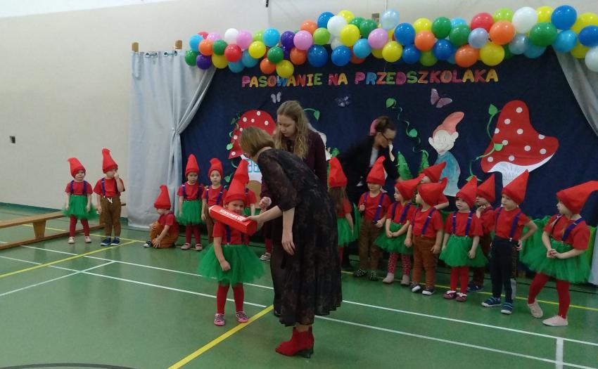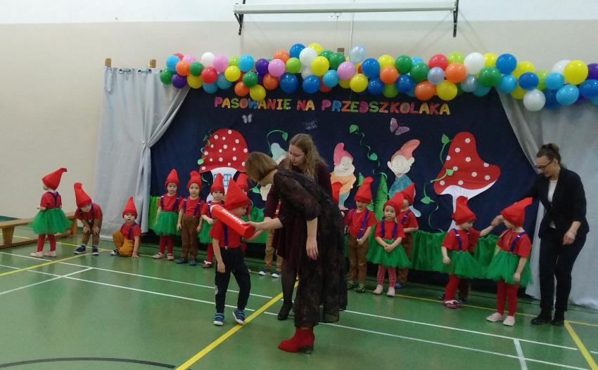 „Pasowanie na przedszkolaka” w grupie I „Krasnoludki” odbyło się 23 listopada 2021 r. Dzieci w tym dniu były prawdziwymi krasnalami, które zaprezentowały swoje umiejętności wokalne, taneczne oraz recytatorskie. Było to pierwsze wystąpienie Krasnoludków, z którym poradziły sobie na medal. Po zakończeniu części artystycznej nadszedł czas na uroczyste pasowanie każdego dziecka na przedszkolaka. Pani Dyrektor za pomocą „czarodziejskiego ołówka" przyjęła z radością nasze najmłodsze dzieci do wielkiej przedszkolnej rodziny. Na pamiątkę tego ważnego wydarzenia każdy przedszkolak otrzymał dyplom pasowania.