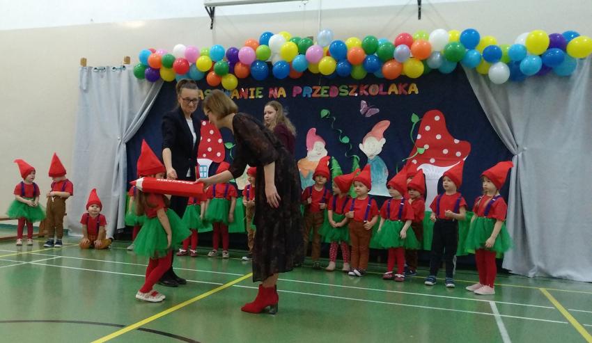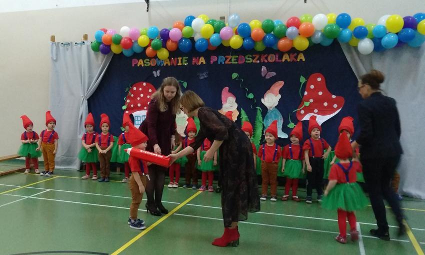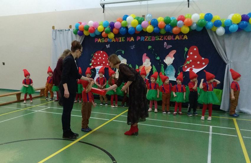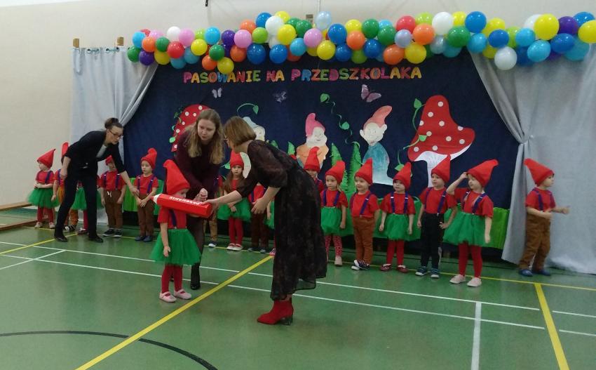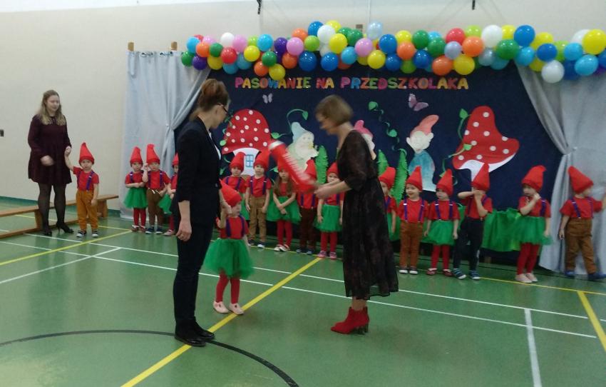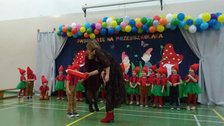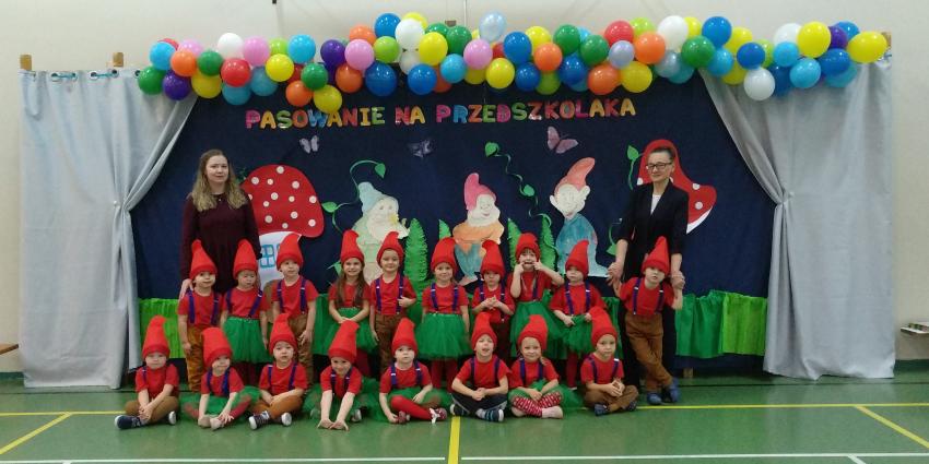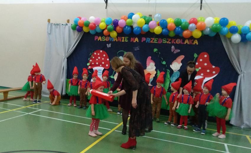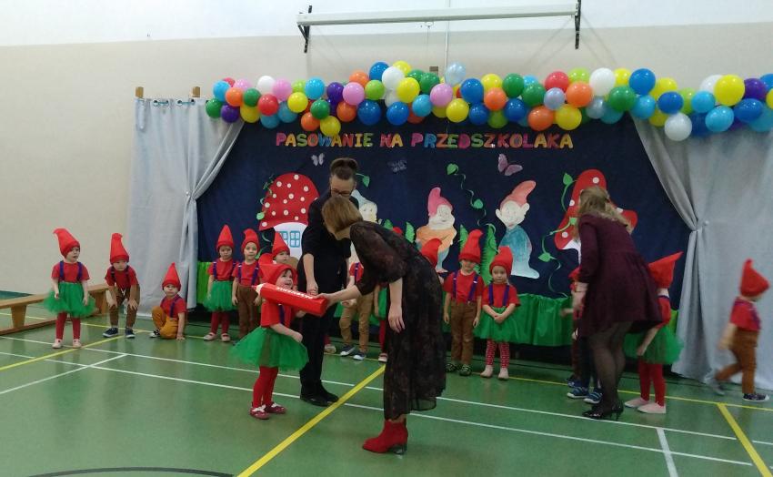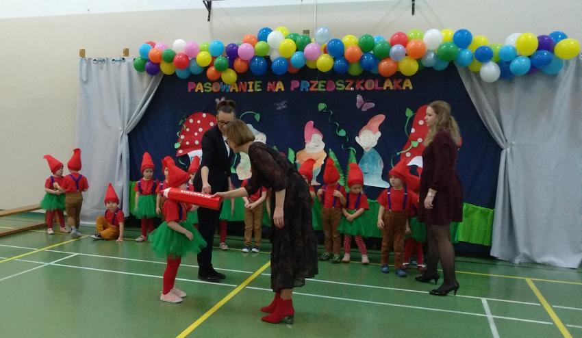 „Pasowanie na przedszkolaka” w grupie I „Krasnoludki” odbyło się 23 listopada 2021 r. Dzieci w tym dniu były prawdziwymi krasnalami, które zaprezentowały swoje umiejętności wokalne, taneczne oraz recytatorskie. Było to pierwsze wystąpienie Krasnoludków, z którym poradziły sobie na medal. Po zakończeniu części artystycznej nadszedł czas na uroczyste pasowanie każdego dziecka na przedszkolaka. Pani Dyrektor za pomocą „czarodziejskiego ołówka" przyjęła z radością nasze najmłodsze dzieci do wielkiej przedszkolnej rodziny. Na pamiątkę tego ważnego wydarzenia każdy przedszkolak otrzymał dyplom pasowania.