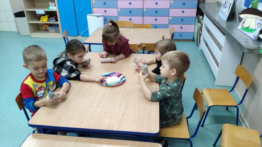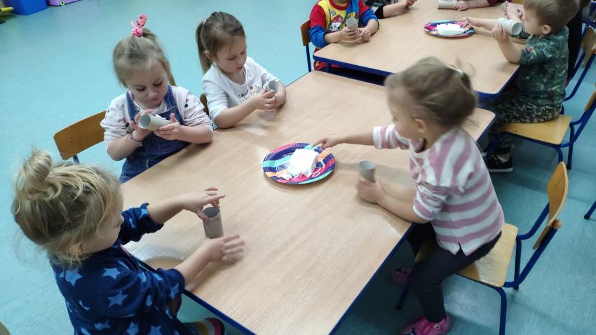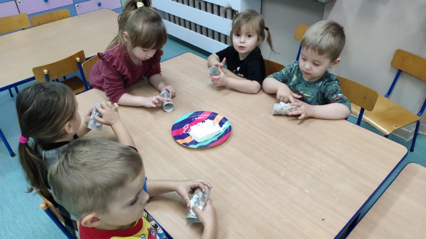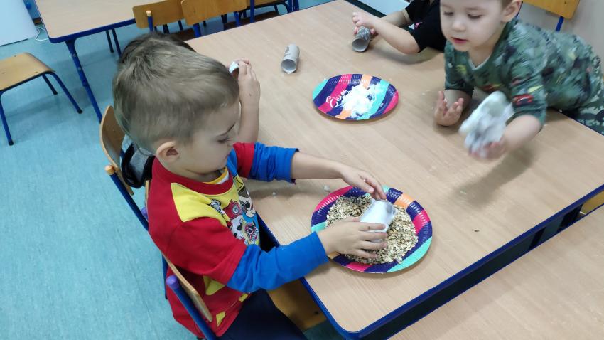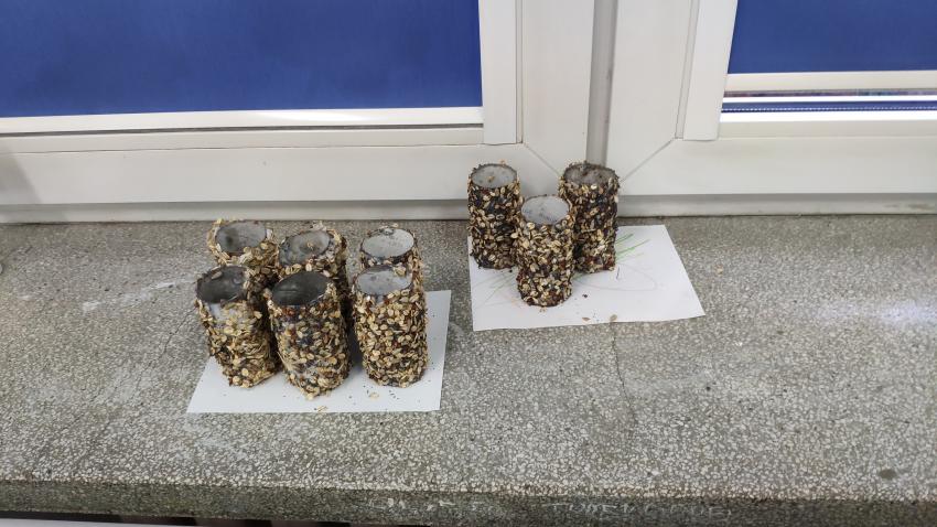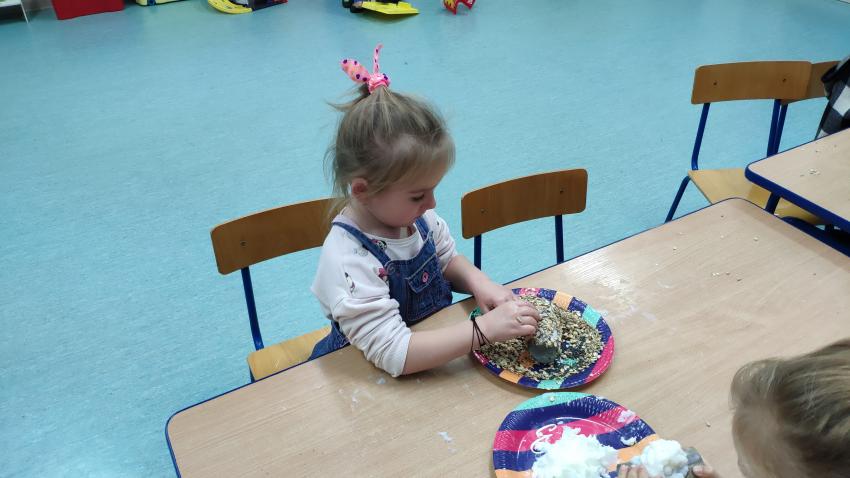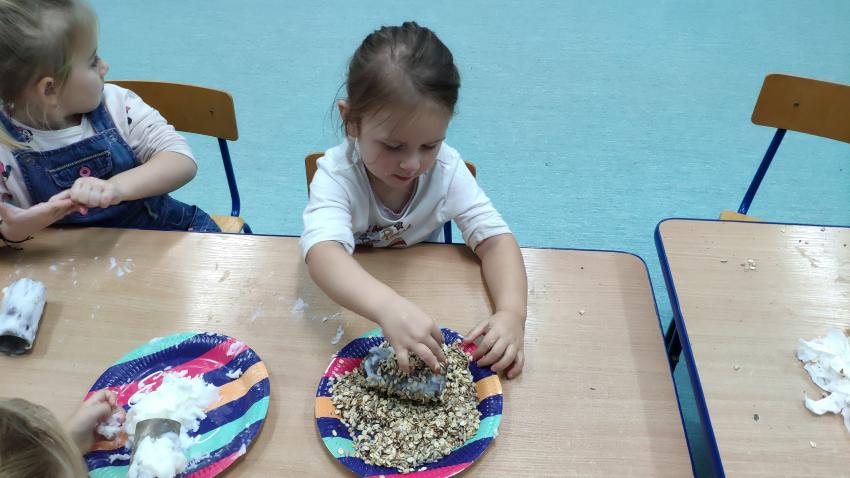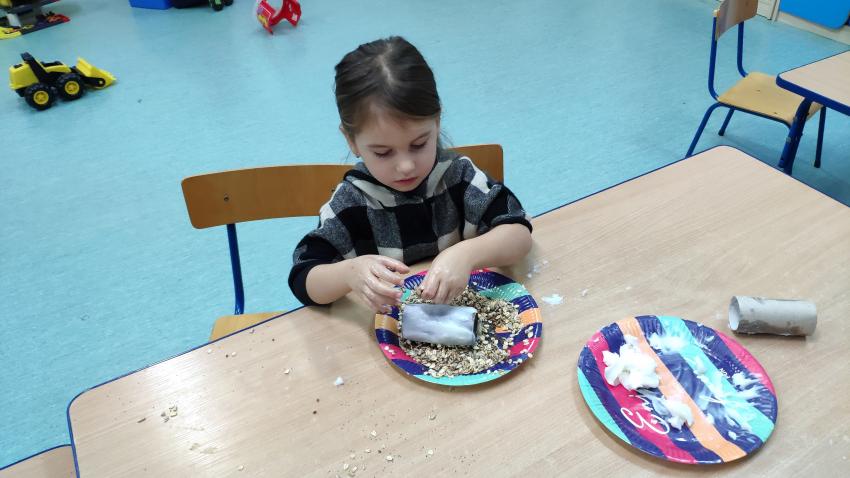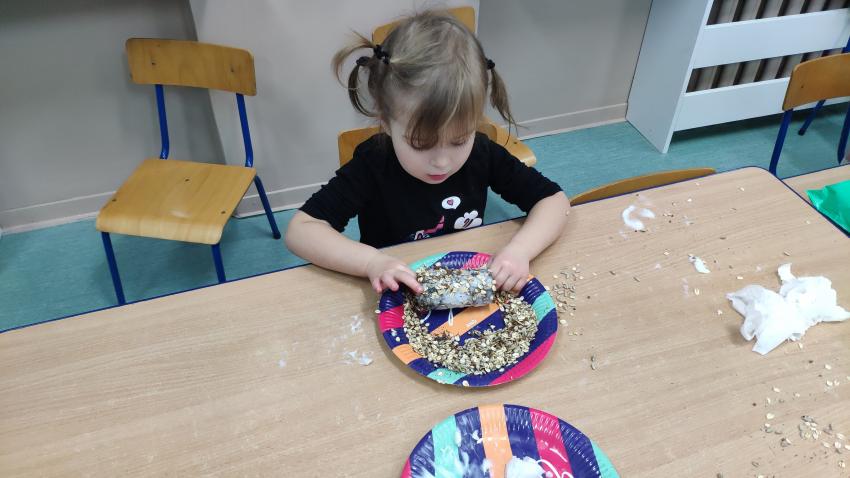 -grupy I wykonała zadanie "Rolka po papierze na spacer się wybierze". Dzieci wykonały karmniki dla ptaków z wykorzytsaniem rolek po papierze, które wraz z rodzicami rozwiesiły w pobliżu swich domów;
