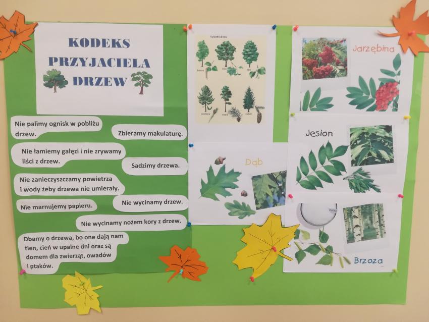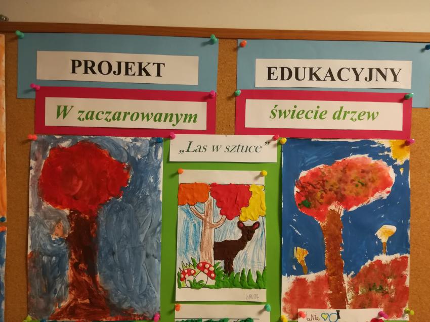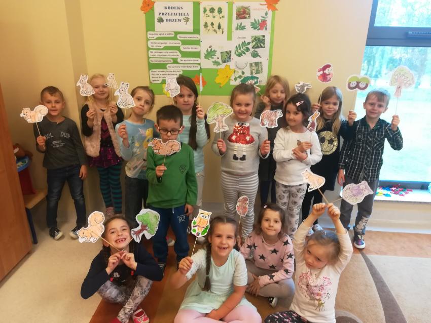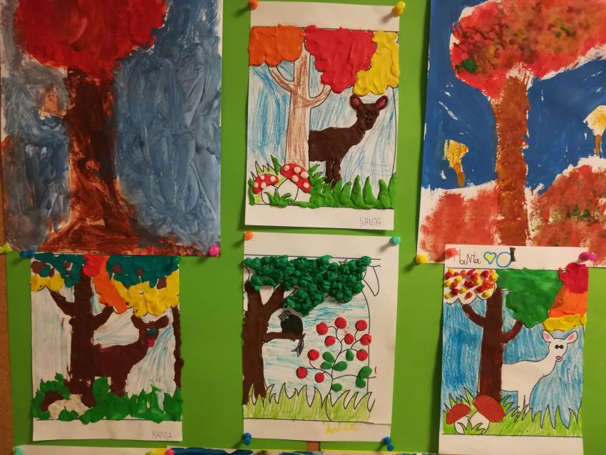 Na początku listopada realizowaliśmy dalsze zadania związane z projektem „W zaczarowanym świecie drzew”. Wspólnie z dziećmi stworzyliśmy Kodeks Przyjaciela Drzew, kukiełki, które wykorzystaliśmy do zabaw parateatralnych oraz galerię prac plastycznych wykonanych różnymi technikami pt. „Las w sztuce”. Efekty wspólnej pracy możemy podziwiać na zamieszczonych zdjęciach.