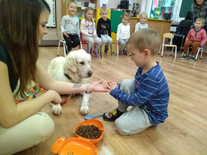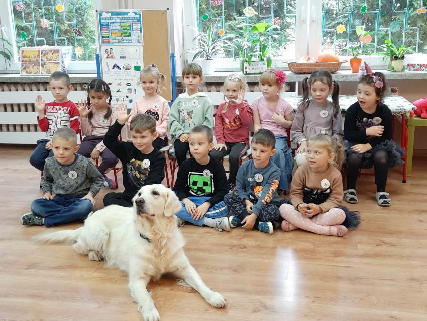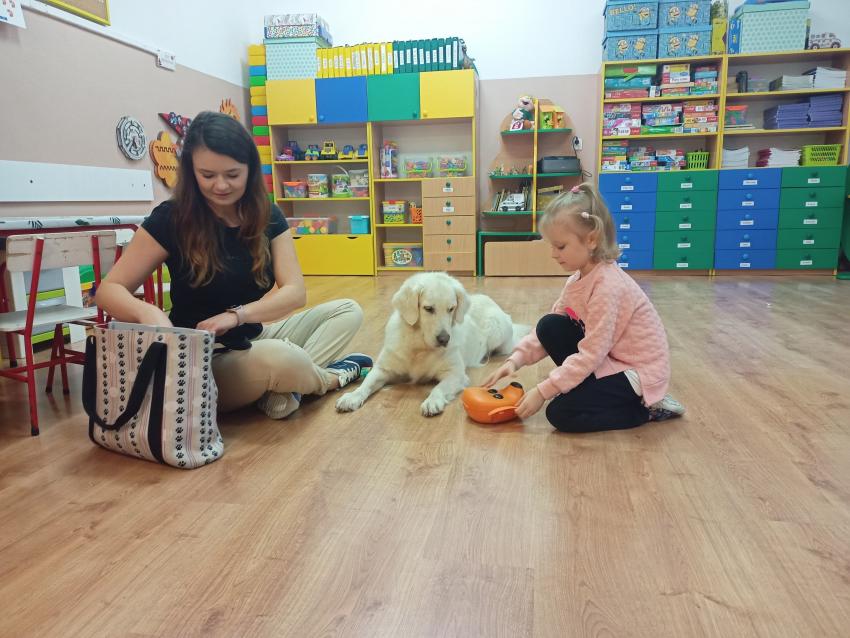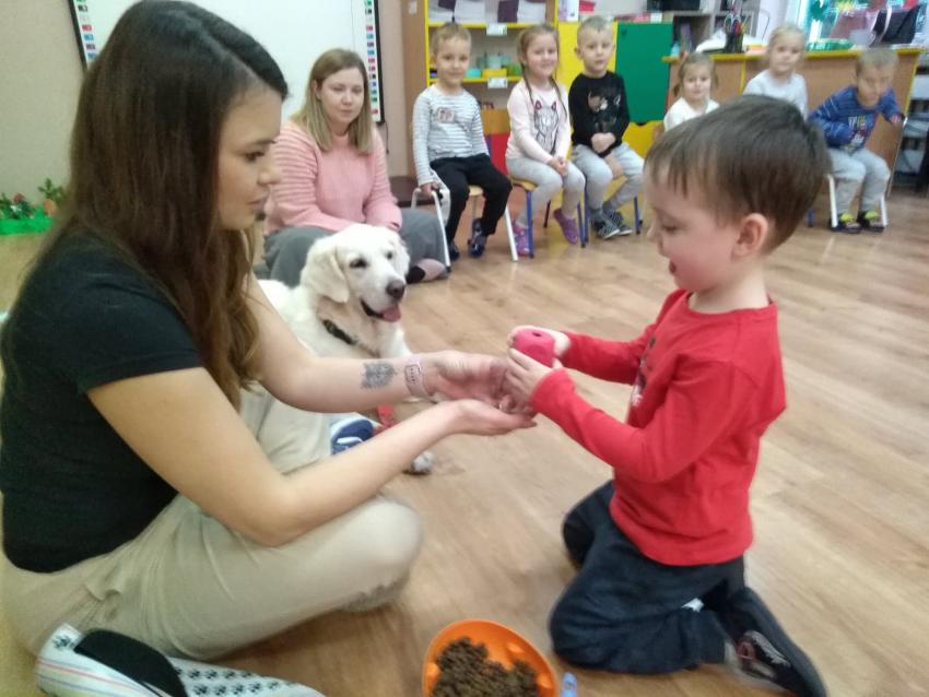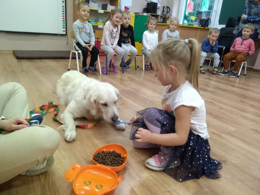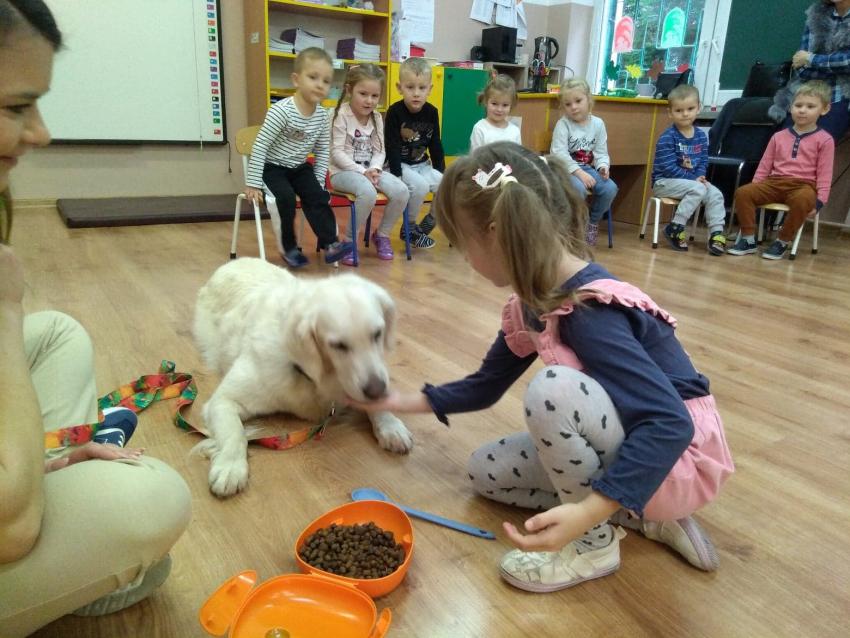 Dzieci z grupy Krasnoludków i Muchomorków wzięły udział w warsztatach edukacyjnych na temat bezpiecznego kontaktu dziecko-pies. Pani Kasia opowiedział dzieciom czym jest mowa ciała psa, jakie sygnały ostrzegawcze wysyła pies oraz jak zachowywać się gdy pies agresywny. Dzieci poznały sztuczki pieska Bezy, nakarmiły ją smakołykami oraz wykonały dla niej korale. Cieszymy się, że mogliśmy poznać naszych wspaniałych gości.