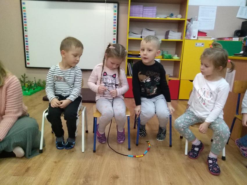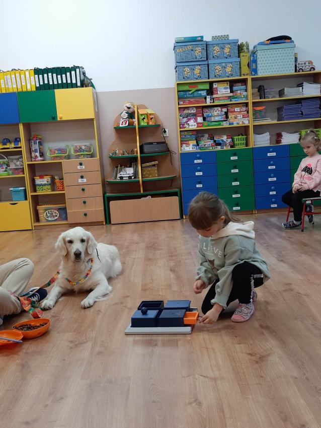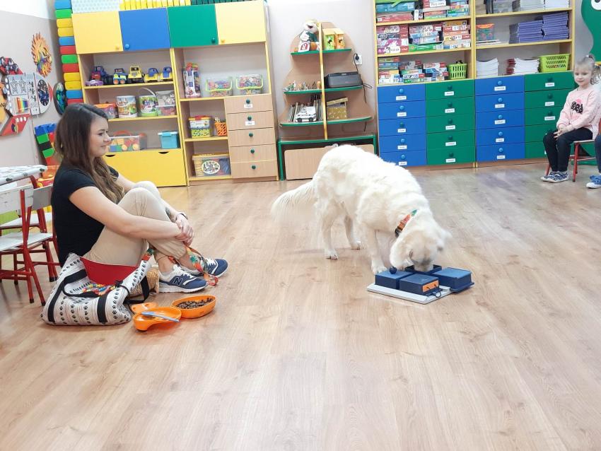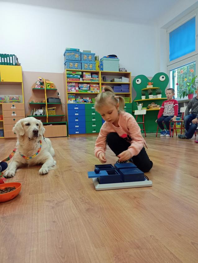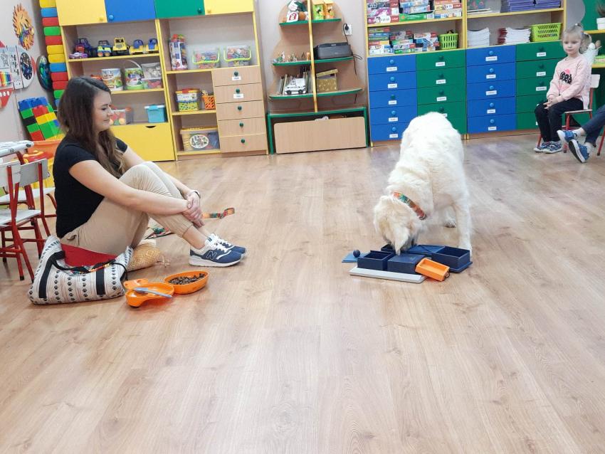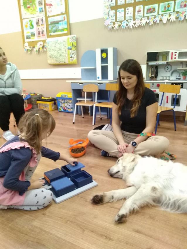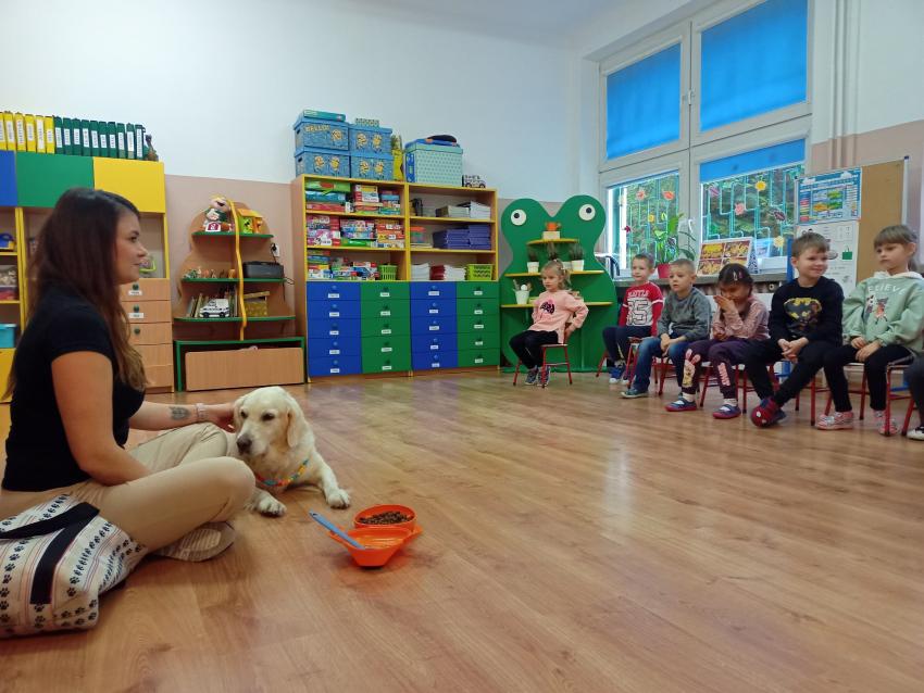 Dzieci z grupy Krasnoludków i Muchomorków wzięły udział w warsztatach edukacyjnych na temat bezpiecznego kontaktu dziecko-pies. Pani Kasia opowiedział dzieciom czym jest mowa ciała psa, jakie sygnały ostrzegawcze wysyła pies oraz jak zachowywać się gdy pies agresywny. Dzieci poznały sztuczki pieska Bezy, nakarmiły ją smakołykami oraz wykonały dla niej korale. Cieszymy się, że mogliśmy poznać naszych wspaniałych gości.