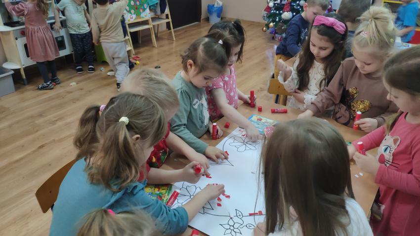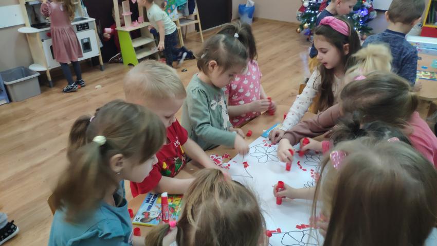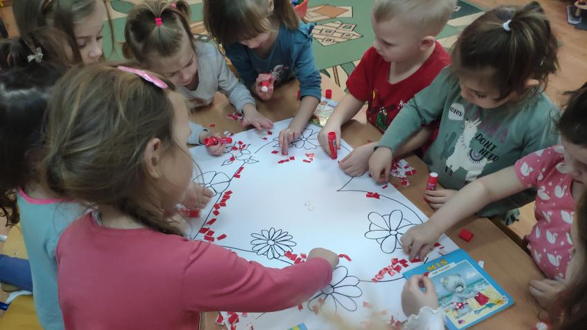 - grupa III wykonała zadanie Papierowe wydzieranki- tworzymy kreatywne prace plastyczne ze skrawków papieru. Dzieci wykonały serce dla babci i dziadka
