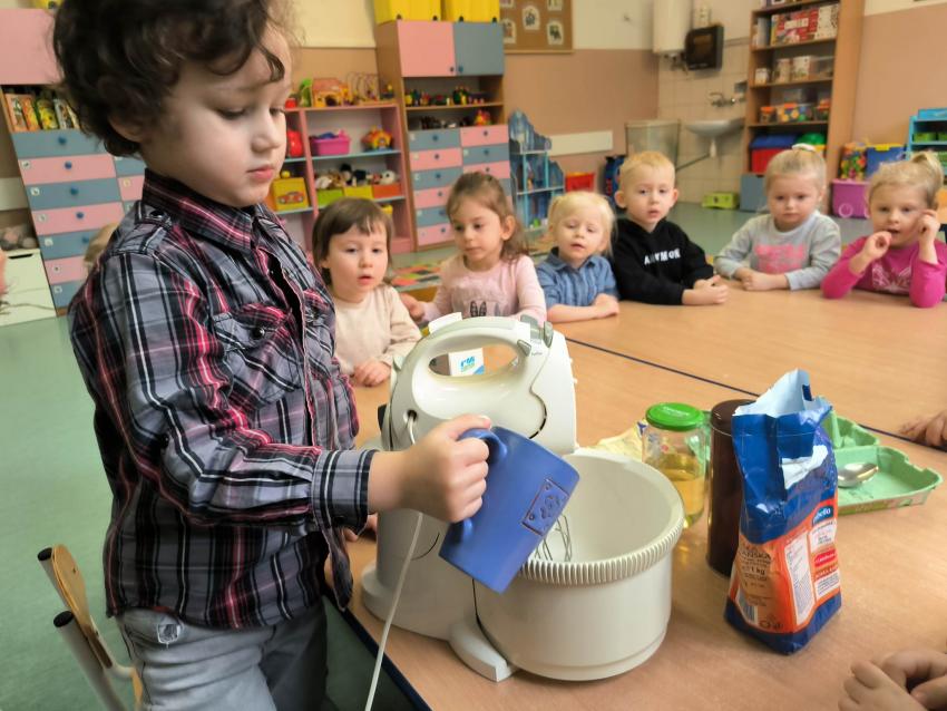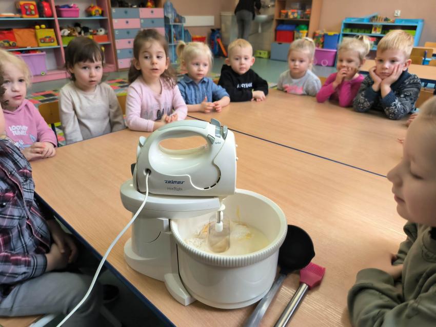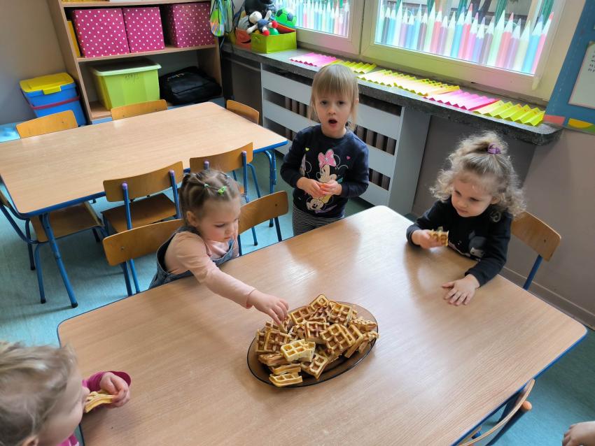 Poznając kulturę Belgii wykonały przepyszne i pachnące na całe przedszkole gofry (Moduł IV KULTURY ŚWIAT, zadanie 19. Smerfne zabawy i gofry- zapoznanie z kulturą Belgii; degustacja gofrów).