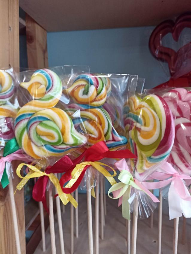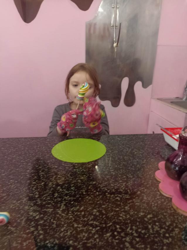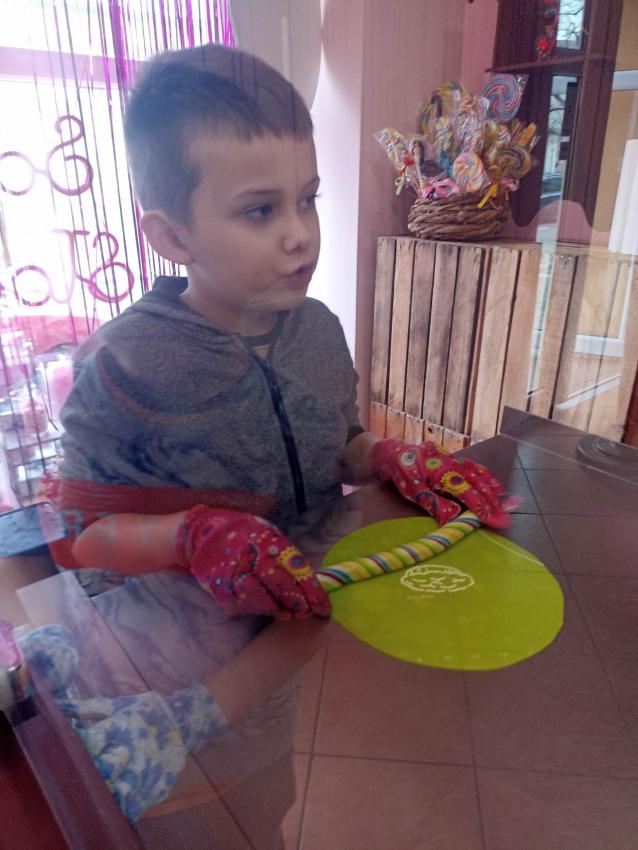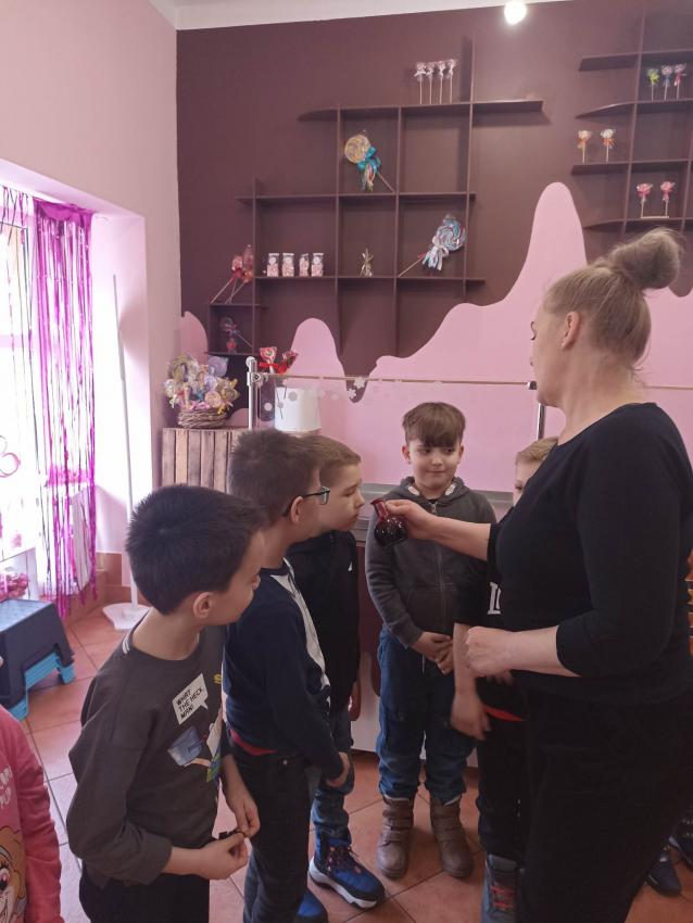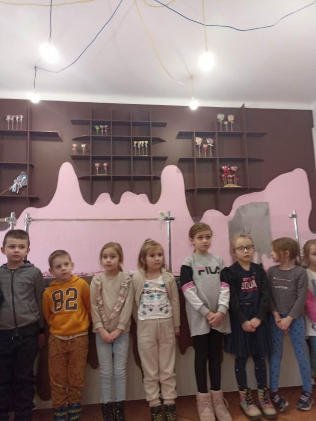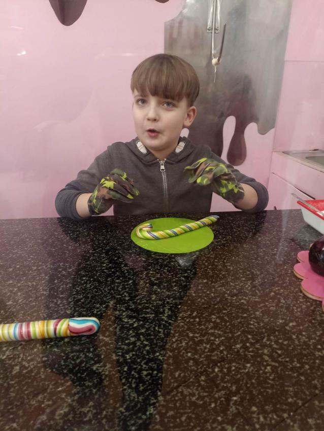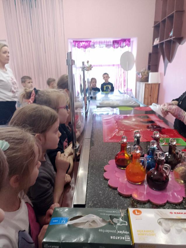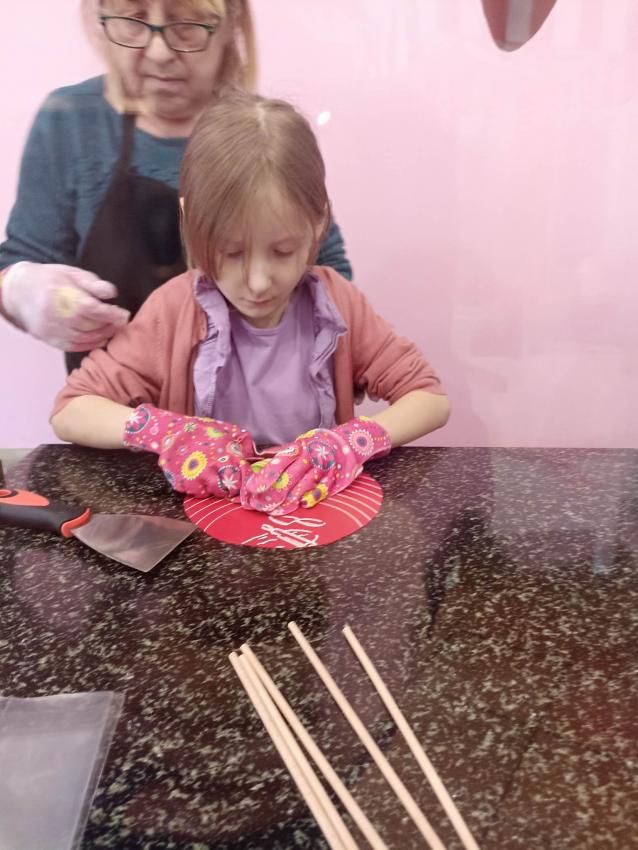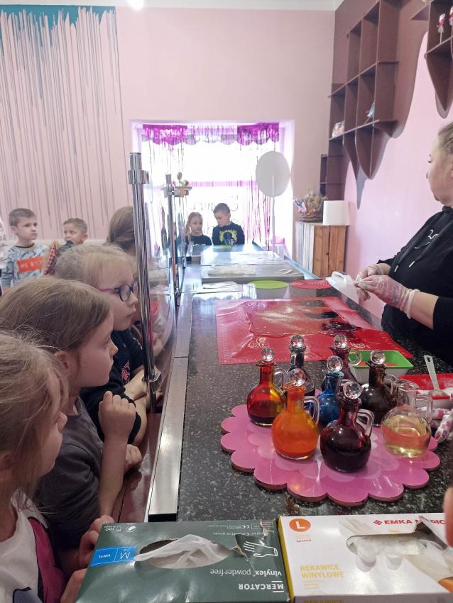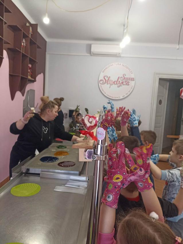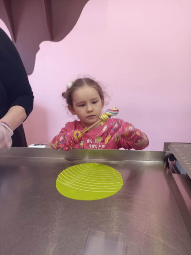 , mające w składzie tylko naturalne barwniki i aromaty. Obserwowały proces powstawania słodyczy od momentu wylania gorącego karmelu, barwienie poprzez nadanie mu kształtu. Na koniec dzieci miały możliwość samodzielnego wykonania lizaka