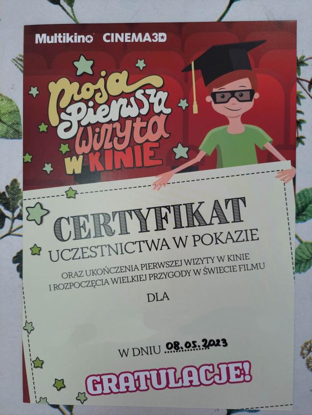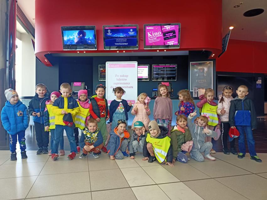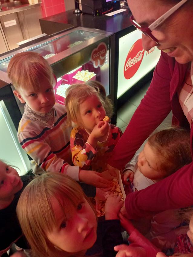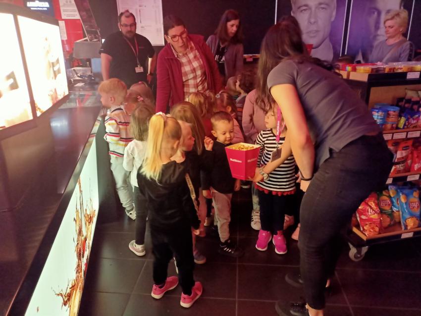 Dzieci z grup Kotki i Muchomorki wybrały się do Multikina na film pt. " Kicia Kocia: mówi Dzień dobry". Niespodzianką dla wszystkich było zwiedzanie tajemniczych pomieszczeń w kinie, czyli przejście drogą ewakuacyjną. Dzieci obserwowały etapy robienia popcornu, którego oczywiście mogliśmy skosztować. Solony, czy karmelowy? Z dużym zainteresowaniem oglądaliśmy na wielkim ekranie przygody Kici Koci. Wszystkie dzieci otrzymały na pamiątkę dyplomy i naklejki. Bardzo podobało nam się w kinie.