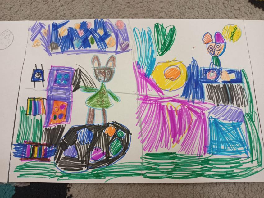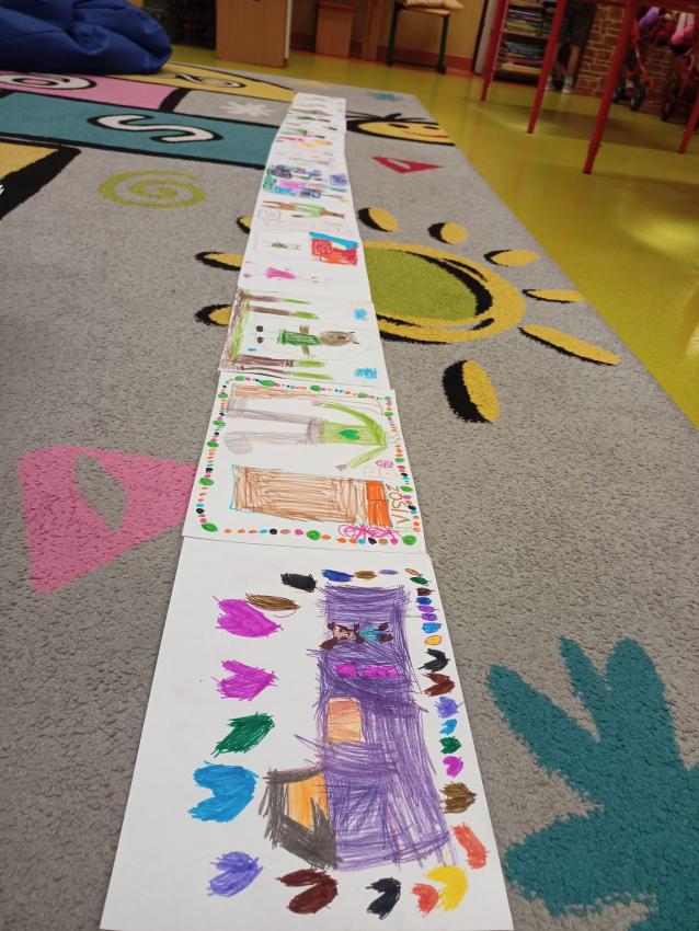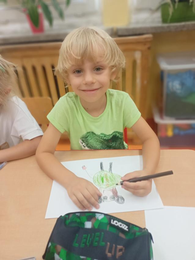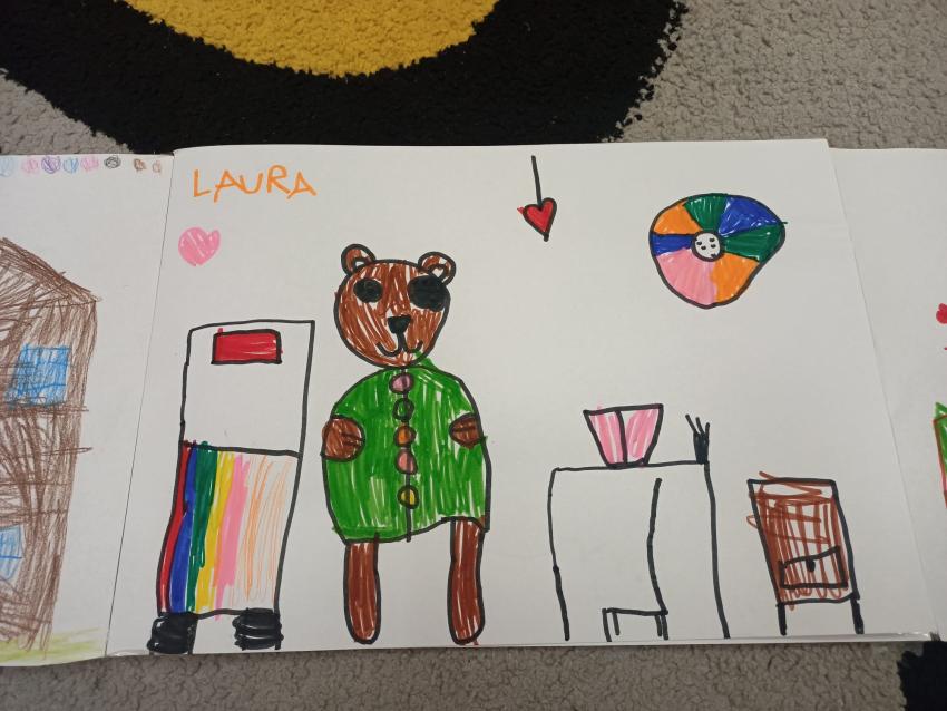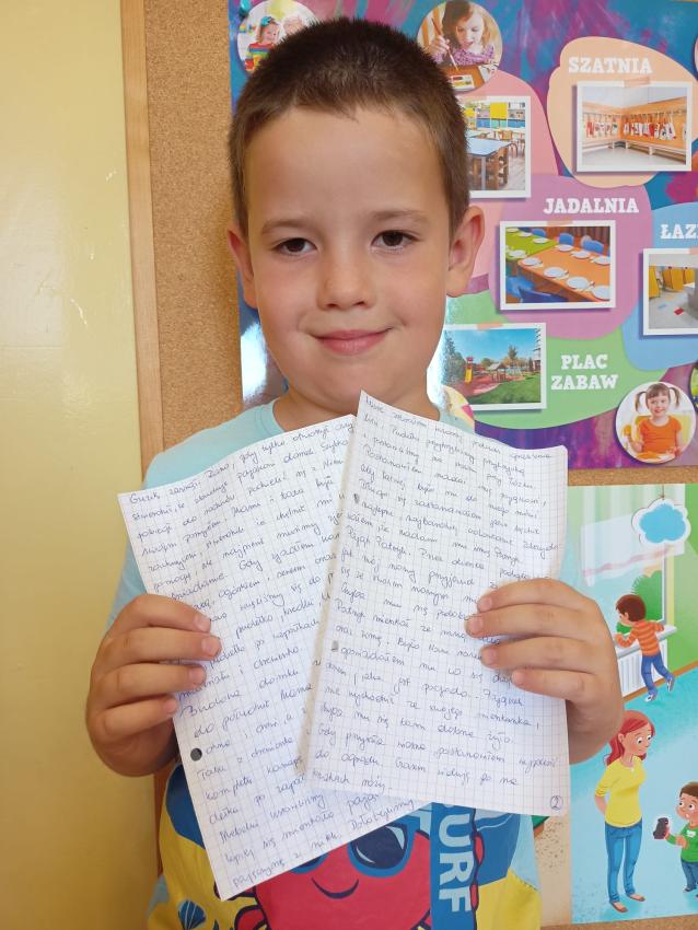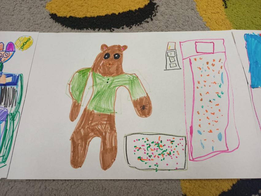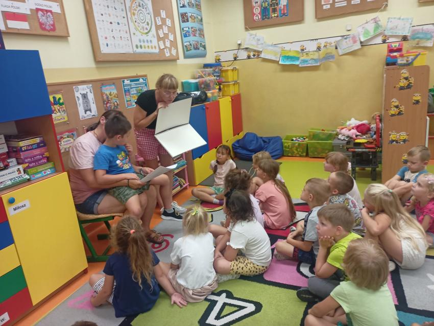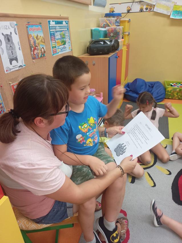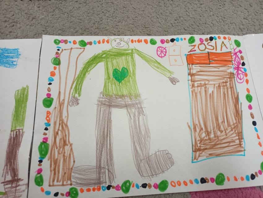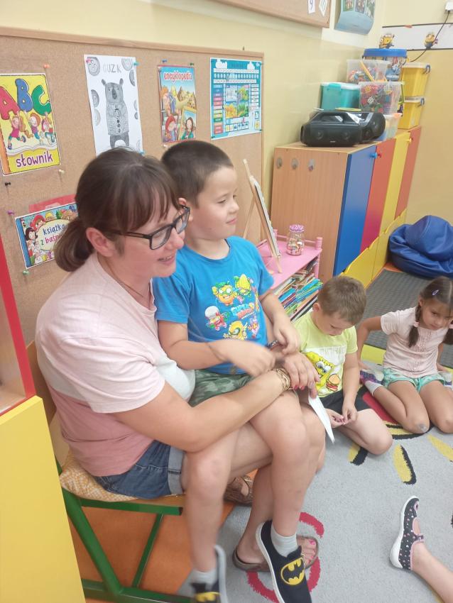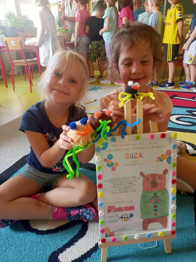 1.Zaprosiliśmy mamę Filipka, która przeczytała dzieciom opowiadanie, a dzieci wykonały do niego ilustracje. Pani Monika wspólnie z synkiem wymyślili zakończenie tej historii. Razem z rodzicami tworzymy książkę o losach małego misia Guzika.