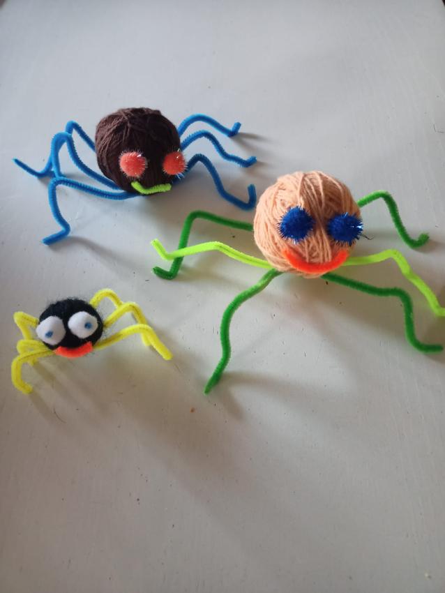2.Wykonaliśmy też pajączki z wełny, pomponów i kolorowych drucików. Pająk był bohaterem opowiadania.