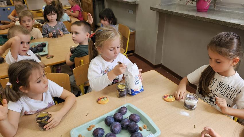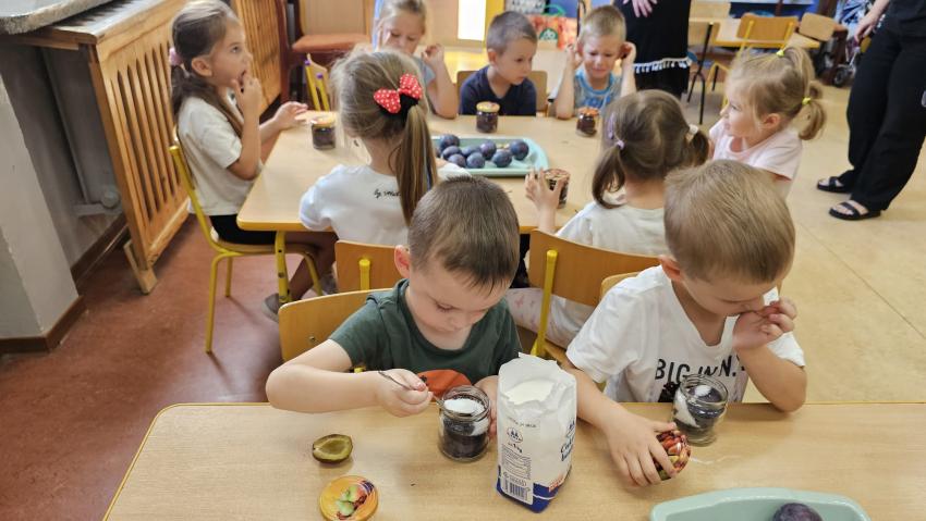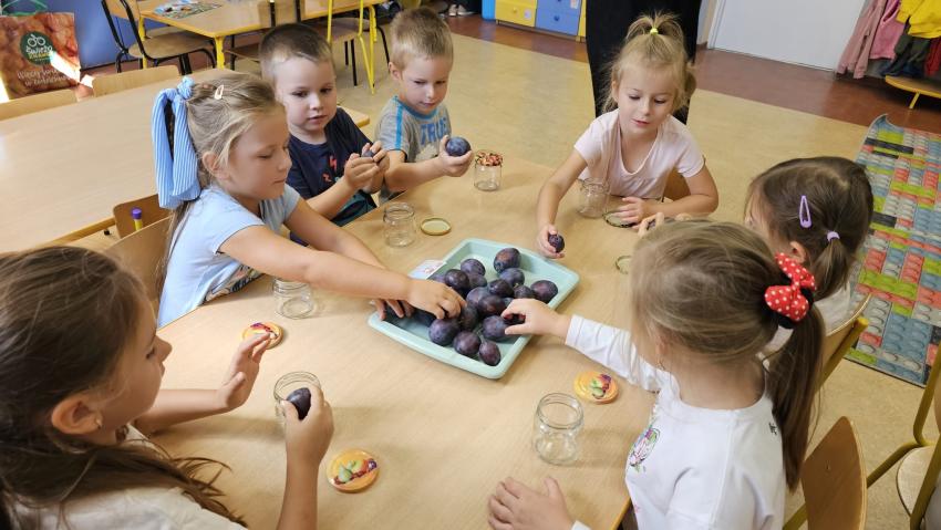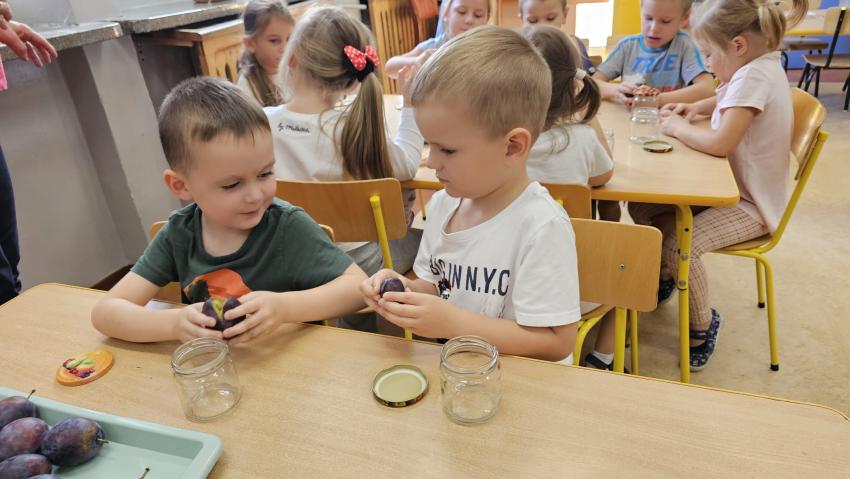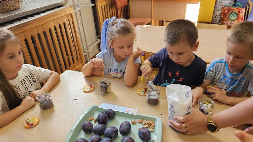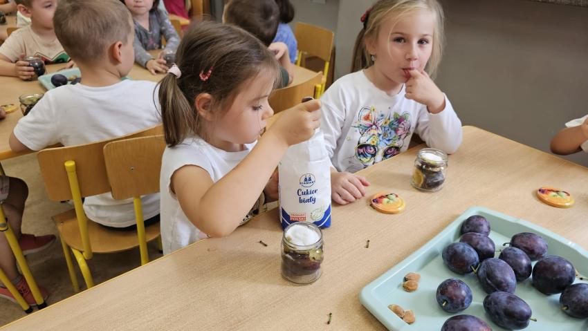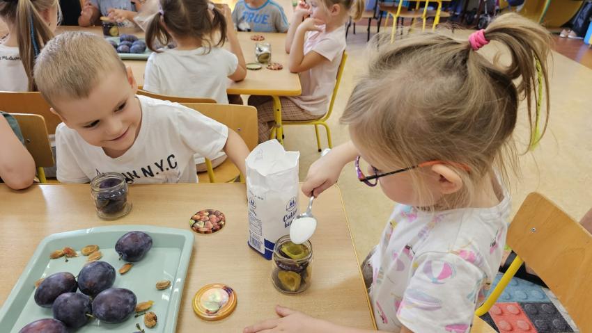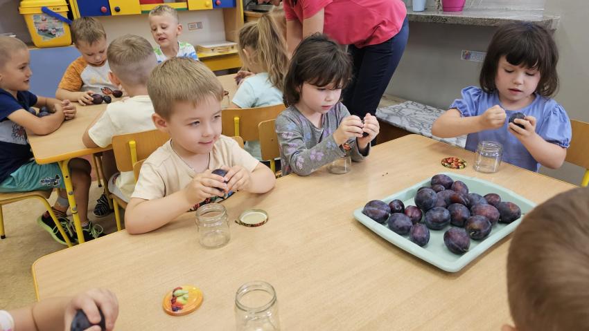 Krasnale realizując pierwsze zdania ?W słoiku zamknięte?- przetwory owocowe Ogólnopolskiego Projektu Edukacyjnego "Z darami natury świat nie jest ponury!" dzieci wykonały kompot ze śliwek. Teraz już będziemy wiedzieć jak przenieść smak lata na zimę.