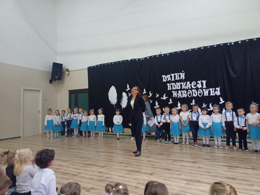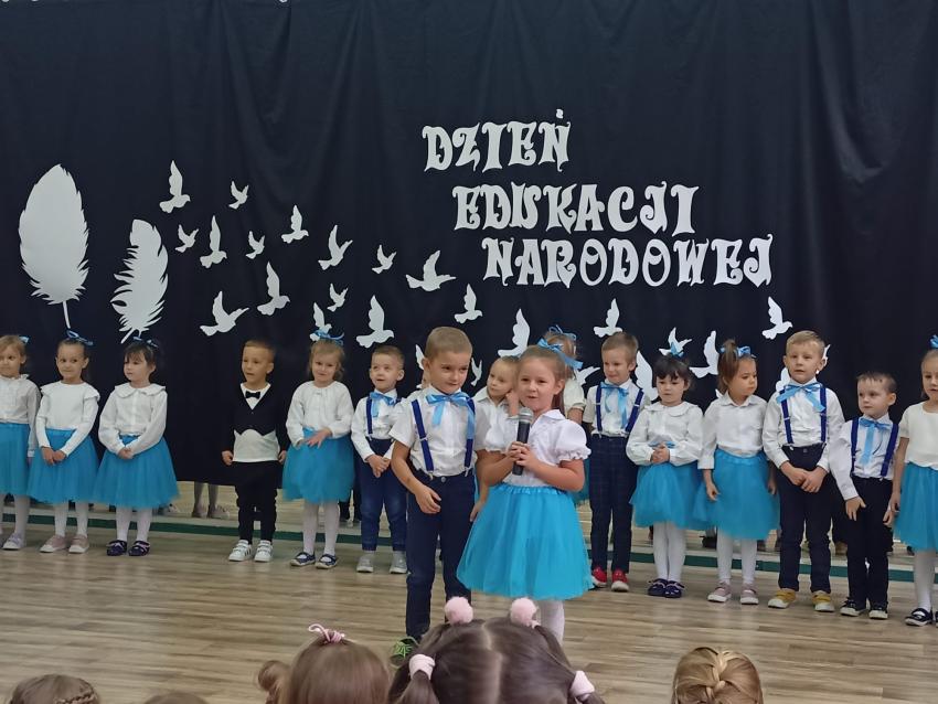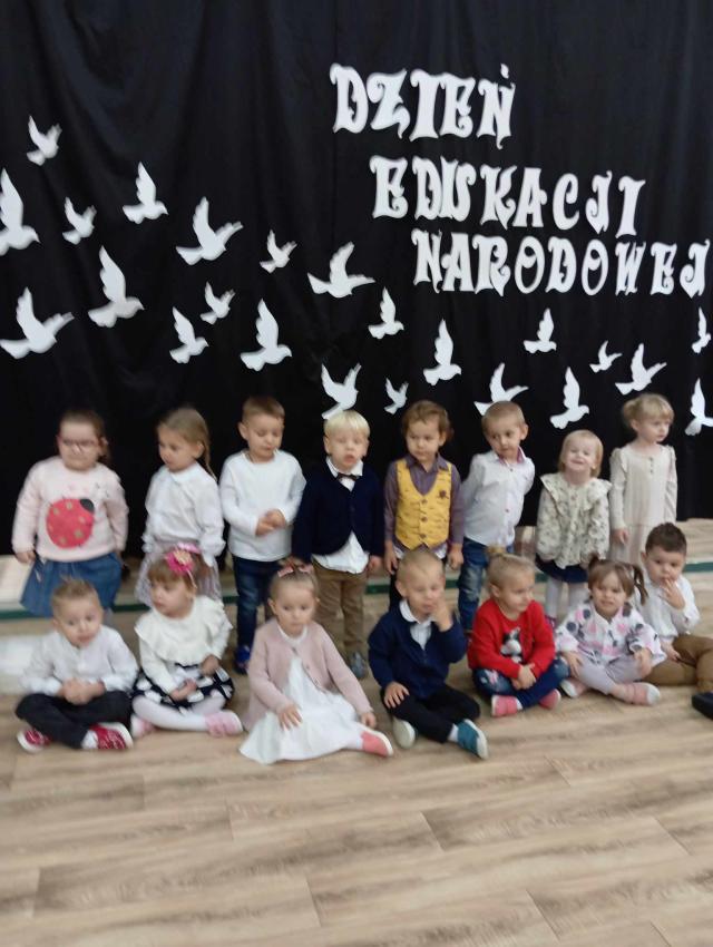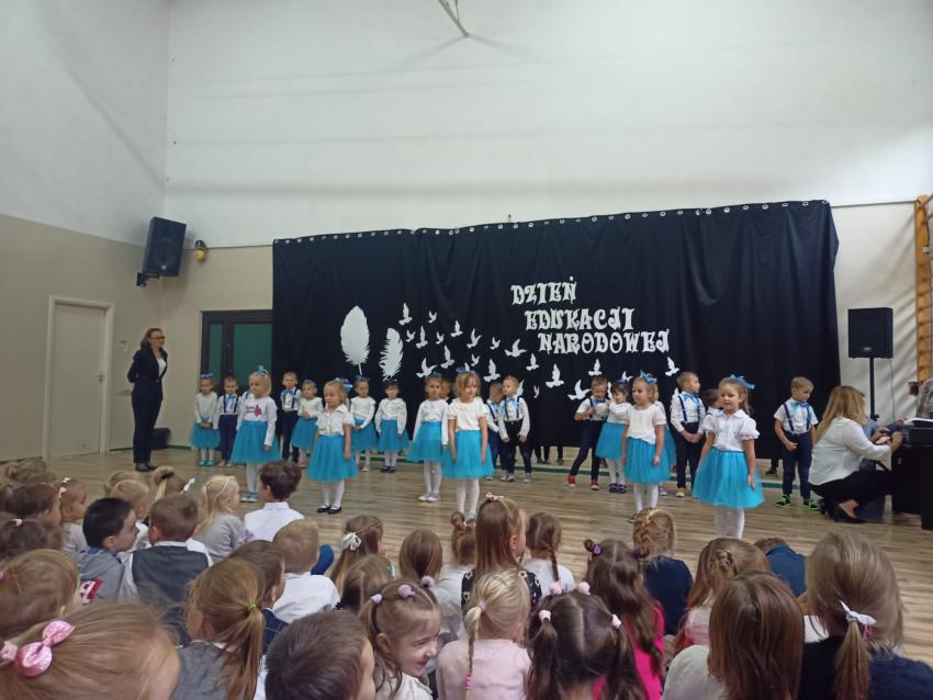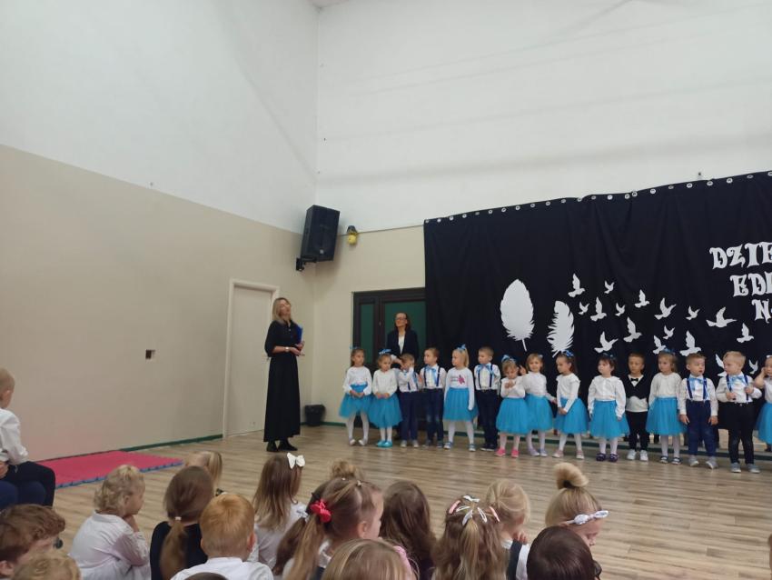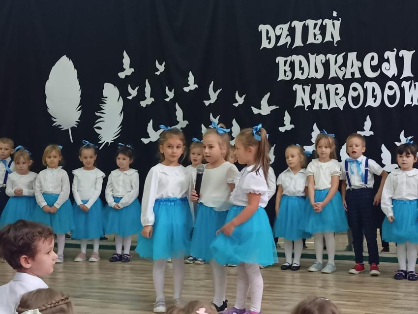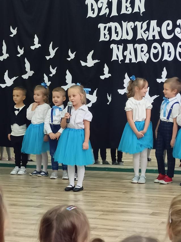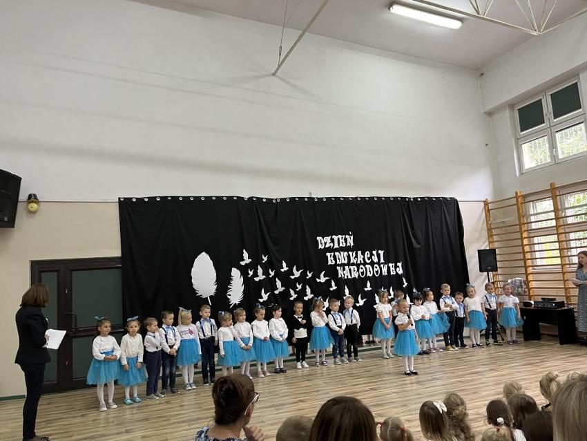 Dziś w Przedszkolu wielkie święto! Dzieci z grupy Krasnoludki, przygotowane przez Panią Annę Pęksyk i Panią Beatę Dziubińską zaprezentowały przed Panią Dyrektor, pracownikami przedszkola i przedszkolakami przedstawienie z okazji Dnia Edukacji Narodowej.