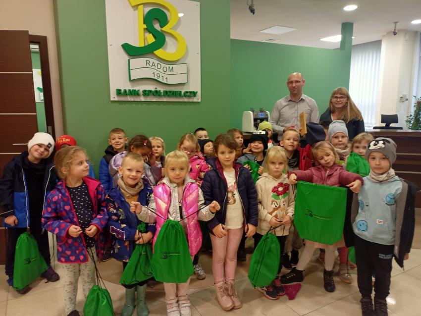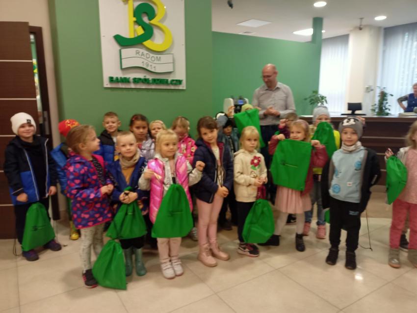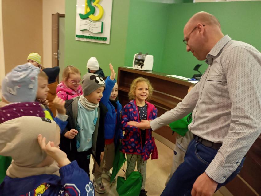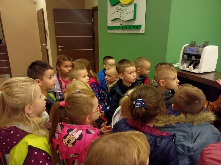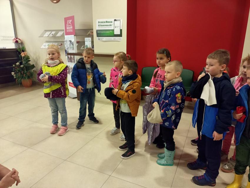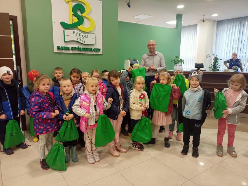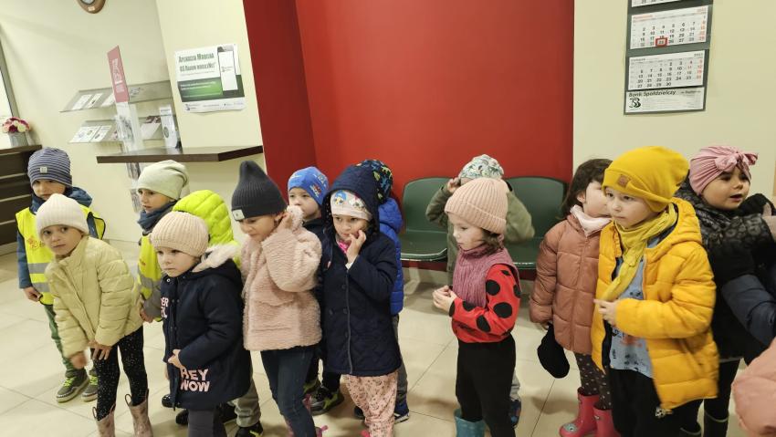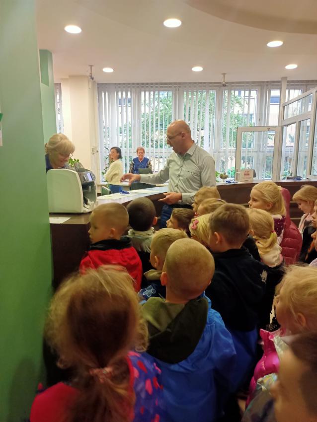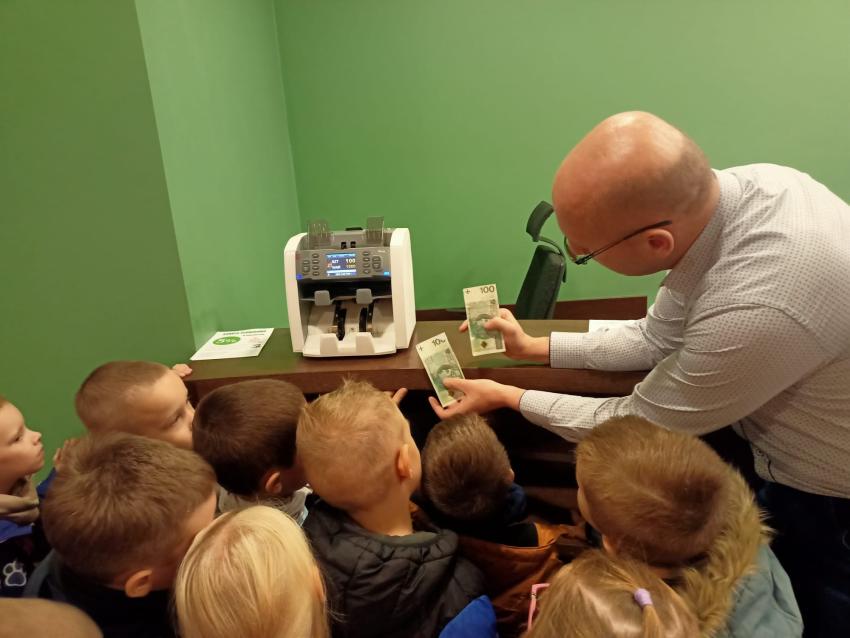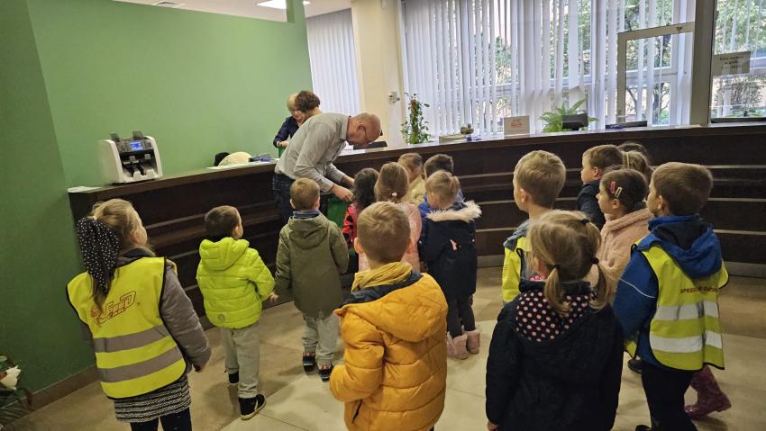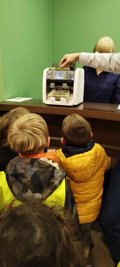 Dzieci z grupy Krasnoludki, Muchomorki i Tygryski odwiedziły Bank Spółdzielczy na ulicy Czachowskiego 21A. Pan Łukasz Myszka opowiedział dzieciom jak działa konto bankowe, wyjaśnił co i gdzie można zrobić w banku oraz pokazał jak szybko są liczone pieniądze w placówce bankowej.