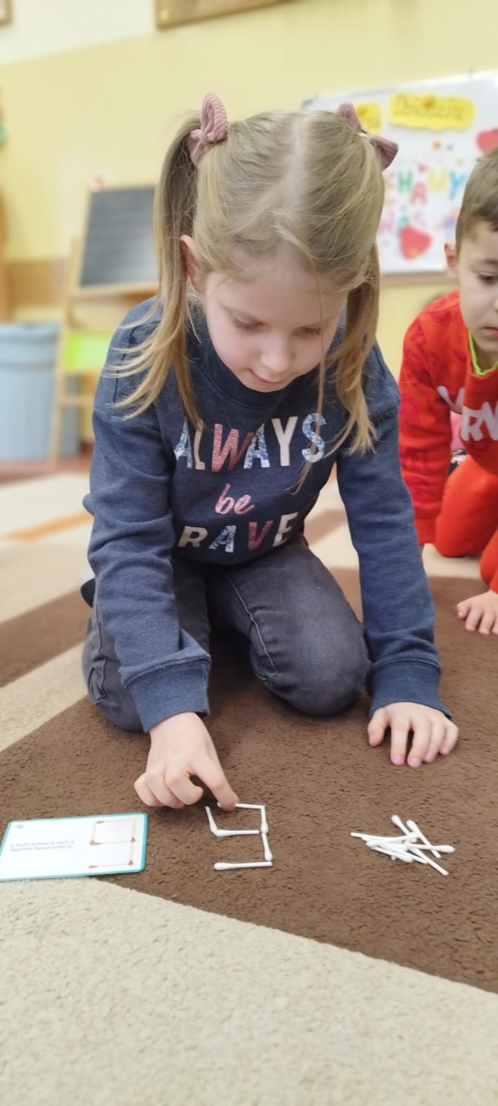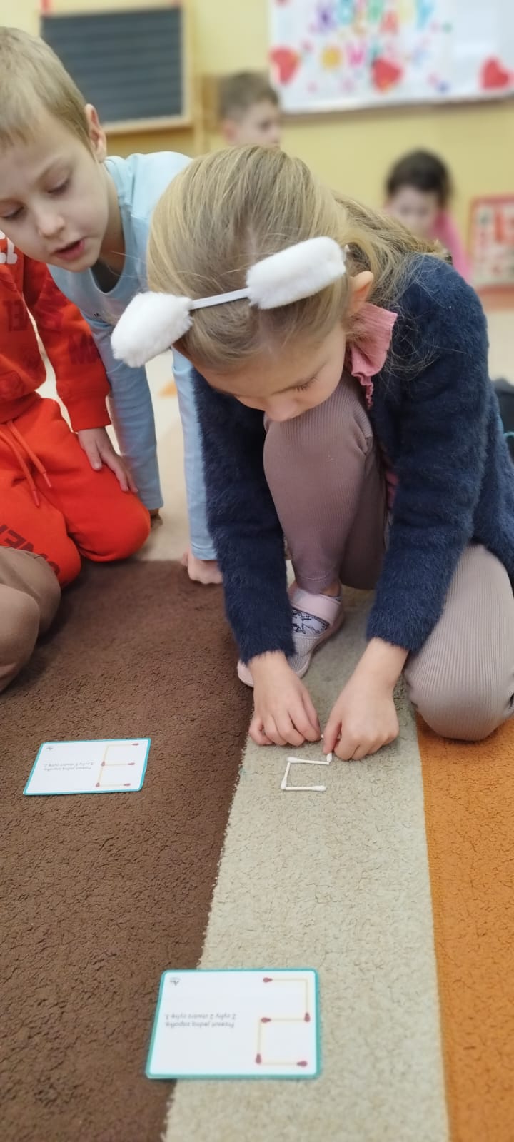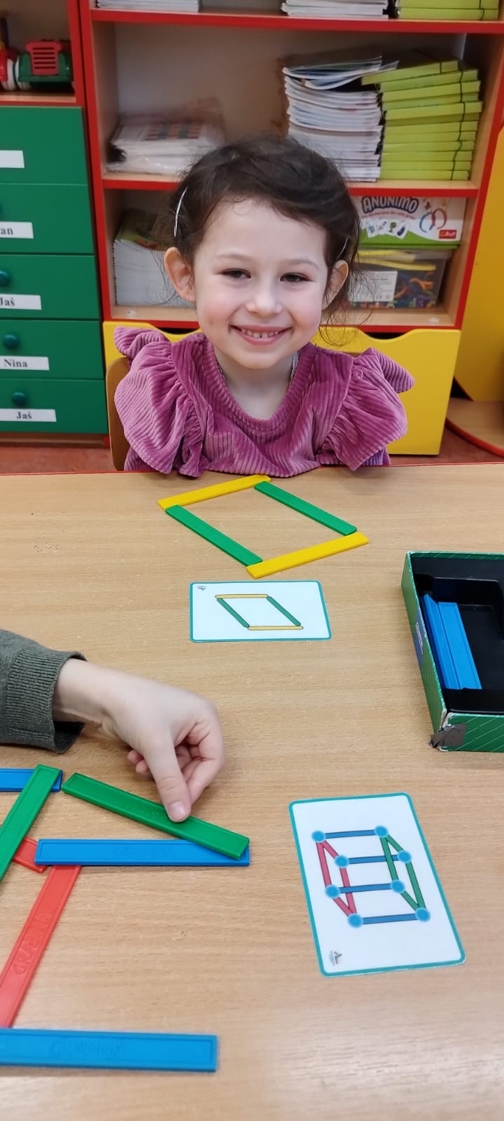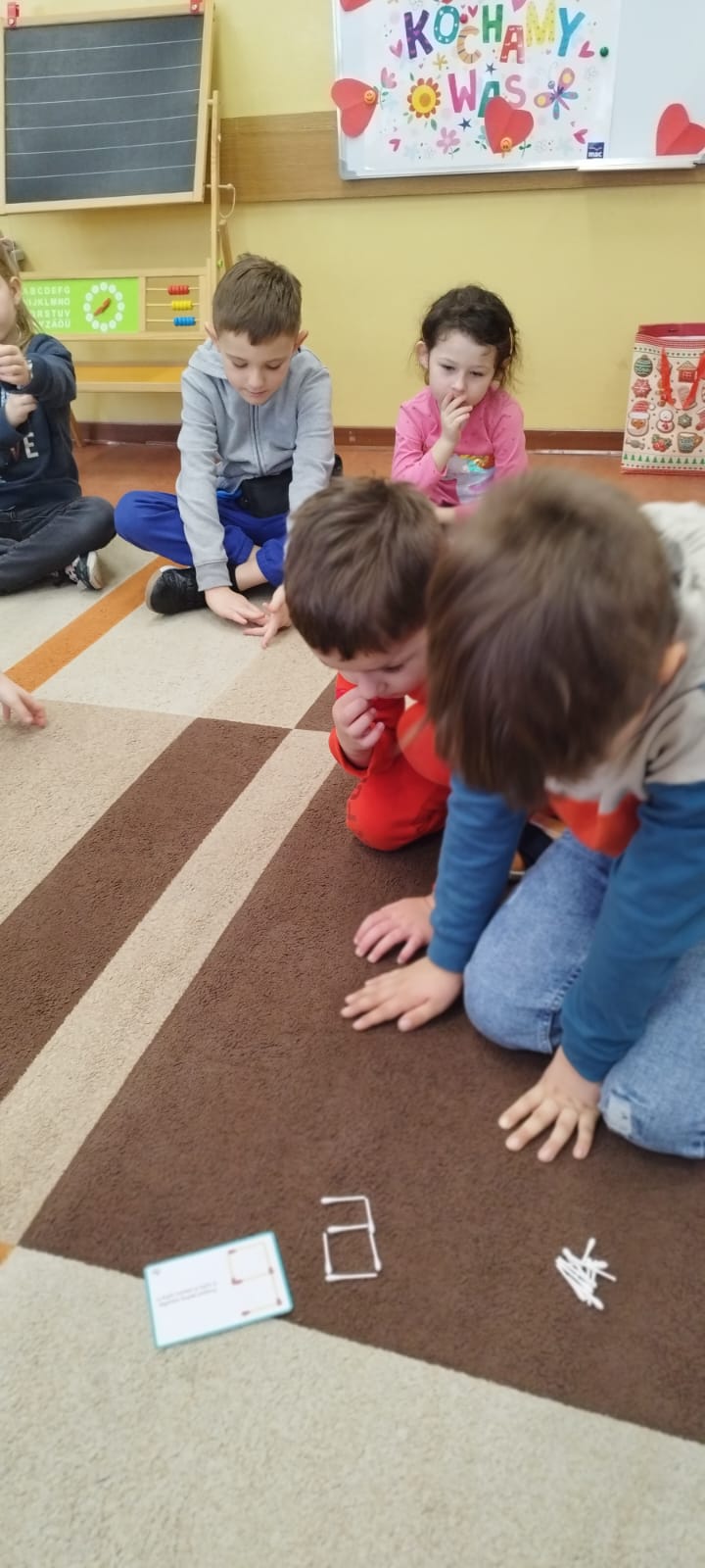 W ramach ogólnopolskiego projektu "Kreatywna matematyka" dzieci z grupy Tygryski wykonały matematyczne łamigłówki z wykorzystaniem patyczków. Dzieci musiały przełożyć tak jeden patyczek, aby np. z cyfry 3 postała cyfra 2. To była cudowna logiczna przygoda dla naszych zerówkowiczów. Dodatkowo układaliśmy z patyczków figury, zarówno te podstawowe, jak i bardziej skomplikowane.