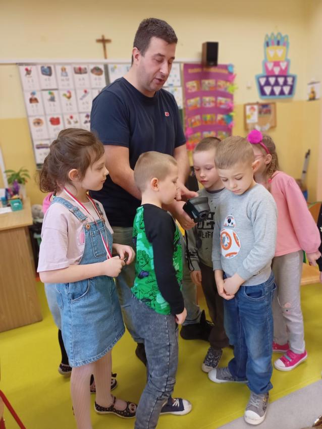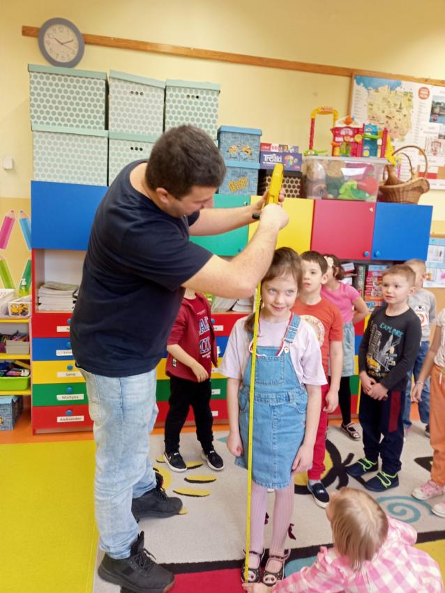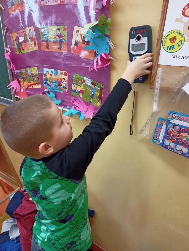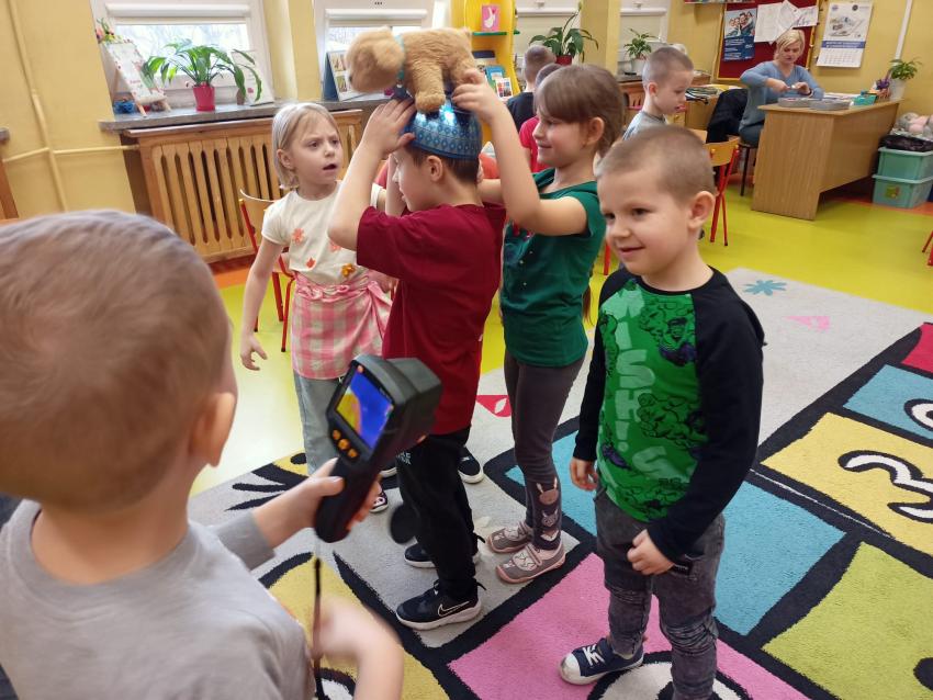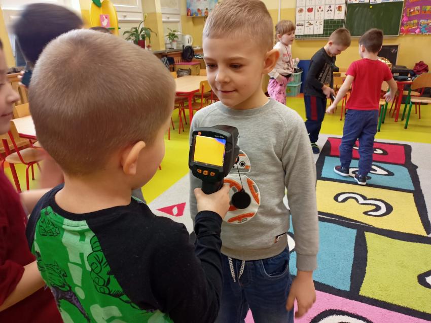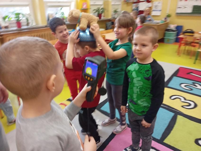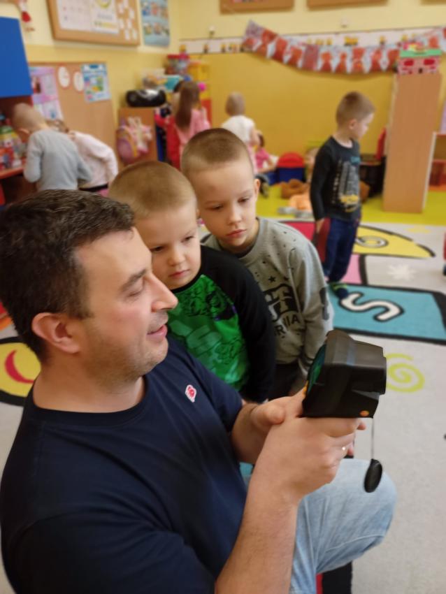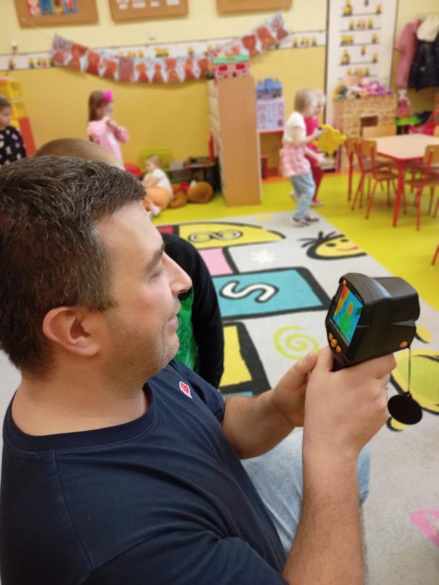 Muchomorki odwiedził wspaniały gość, tata Filipka. Odkrył przed nami tajemnicę nietypowego zawodu, jakim jest audytor energetyczny. Jakie narzędzia wykorzystuje w swojej pracy ? Czym jest termowizja i w jakiej dziedzinie ma zastosowanie? Na te pytania udało nam się poznać odpowiedź podczas zajęć z panem Mirkiem. Dzieci z wielkim zainteresowaniem słuchały wszystkich informacji na temat mierzenia temperatury domu, pomieszczeń, mierzenia szerokości i wysokości dużych budynków. Miały okazję same sprawdzić, jak działają przyniesione przez pana Mirka narzędzia. Największą furorę zrobiła kamera termowizyjna. Dzieci z wielką ciekawością i zdziwieniem przyglądały się obrazowi własnych ciał i śladów pozostawionych na powierzchni. Poszukiwaliśmy ciepłych miejsc w naszym ciele. Zastanawialiśmy się wspólnie w jakich dziedzinach jest ona wykorzystywana. To była wspaniała zabawa dla wszystkich. Tata Filipka zasłużył na podziękowanie i uścisk od wszystkich. Dziękujemy za wspaniałe warsztaty. Bardzo nam się podobało spotkanie.