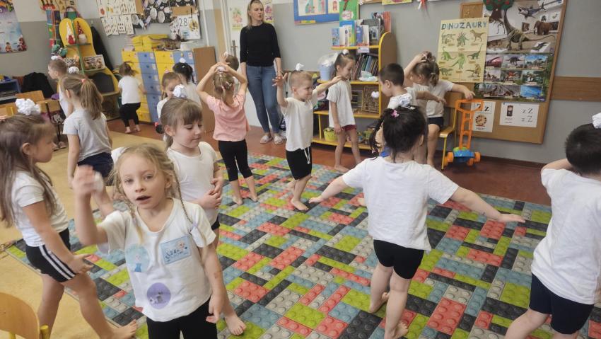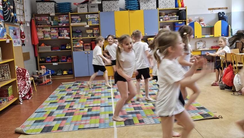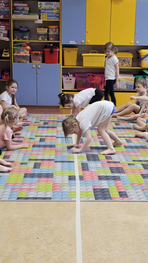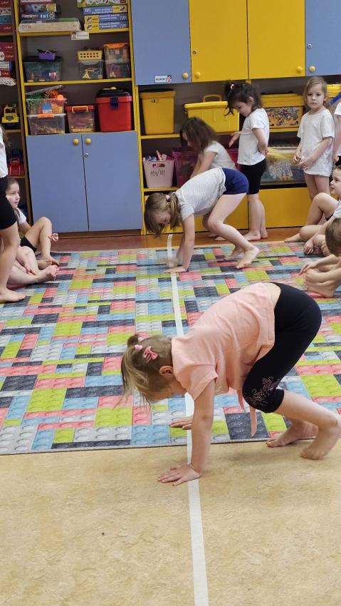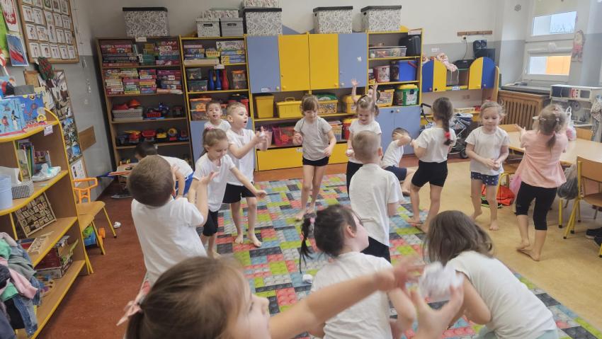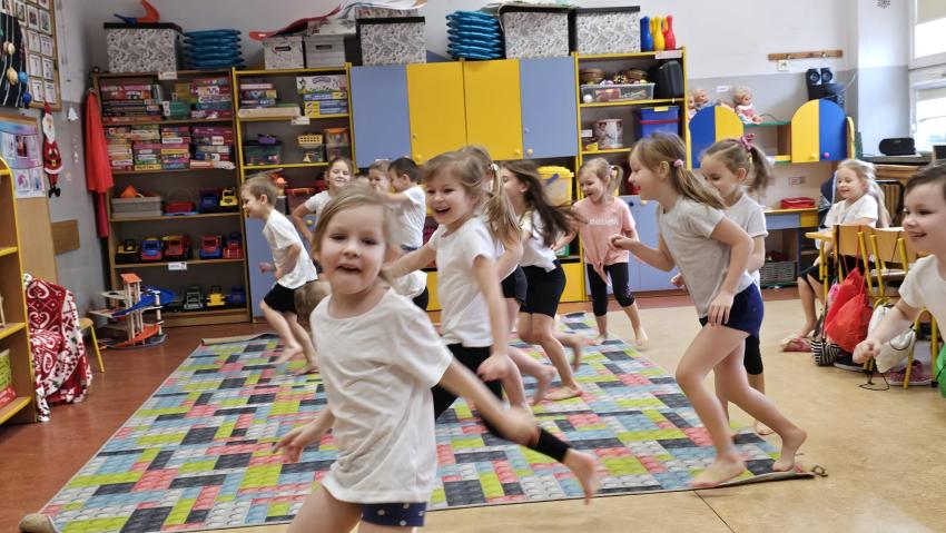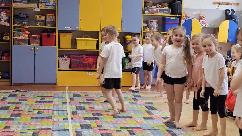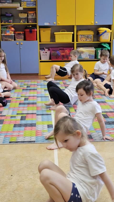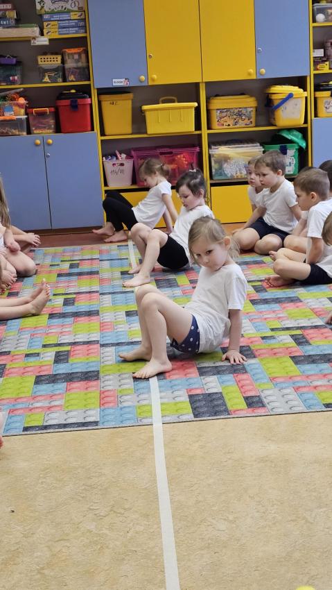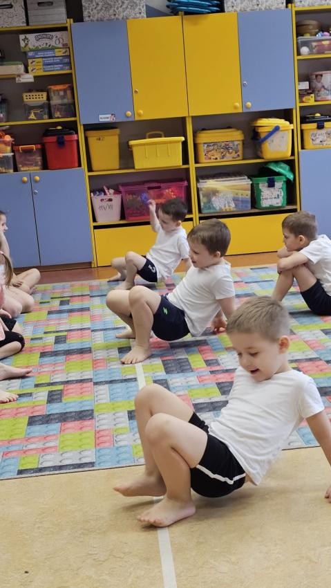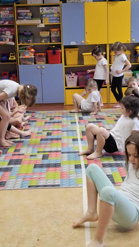 "Gimnastyka to podstawa i dla zdrowia, ważna sprawa. Ręce w górę, potem w bok i do przodu wielki skok". Krasnale dzielnie realizując kolejne zadania Ogólnopolskiego Projektu Edukacyjnego "W zdrowym ciele, zdrowy duch, wie to każdy mały zuch!".