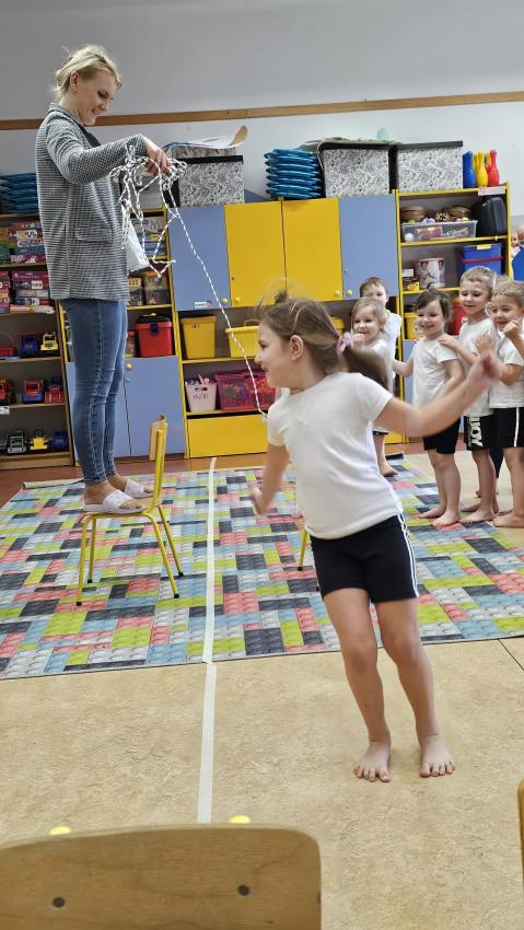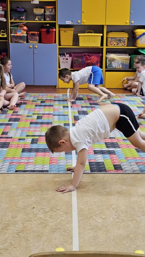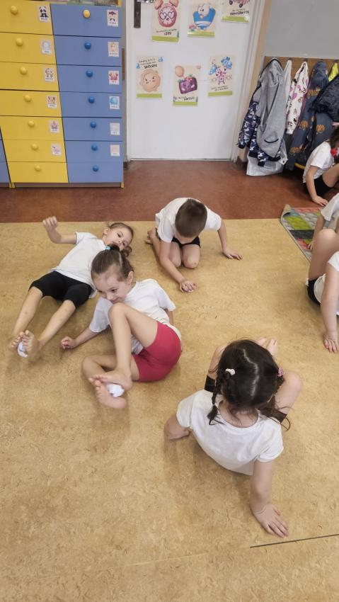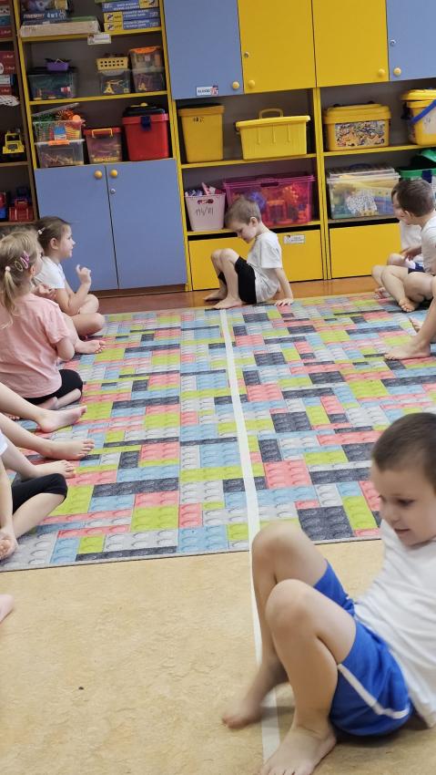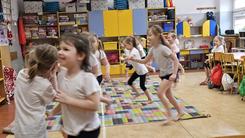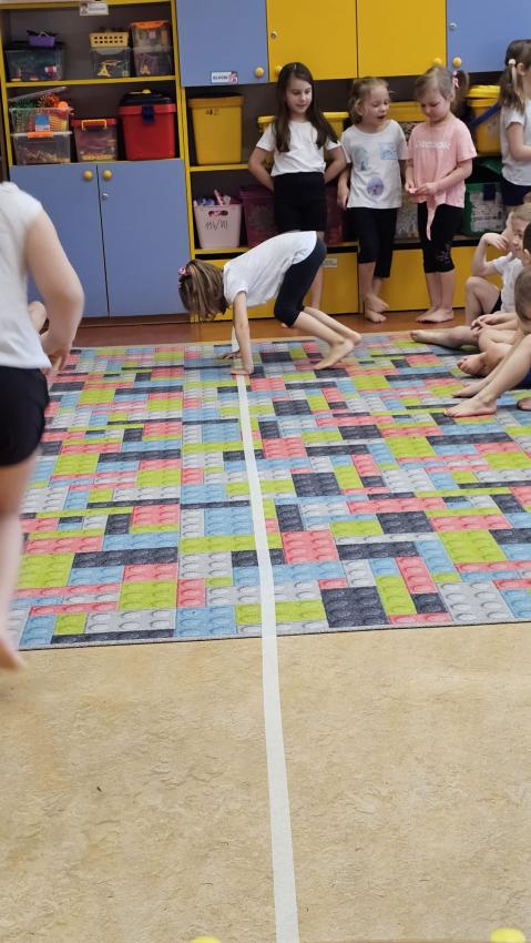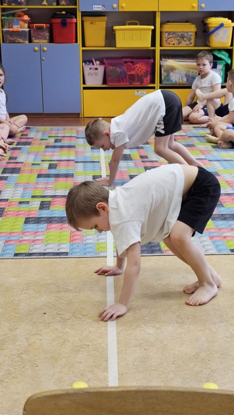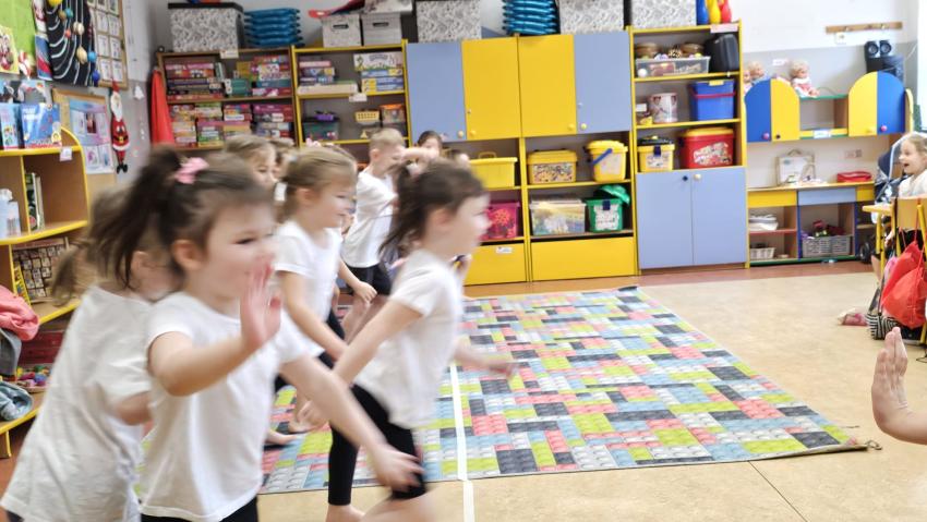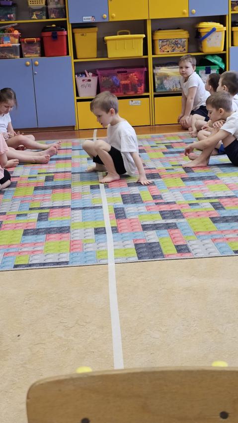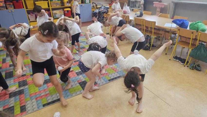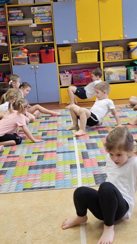 "Gimnastyka to podstawa i dla zdrowia, ważna sprawa. Ręce w górę, potem w bok i do przodu wielki skok". Krasnale dzielnie realizując kolejne zadania Ogólnopolskiego Projektu Edukacyjnego "W zdrowym ciele, zdrowy duch, wie to każdy mały zuch!".
