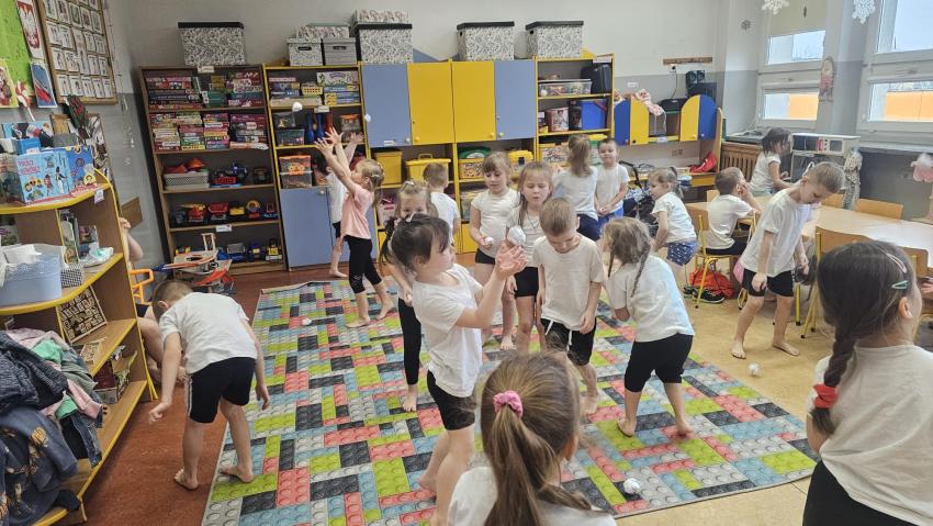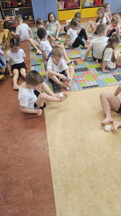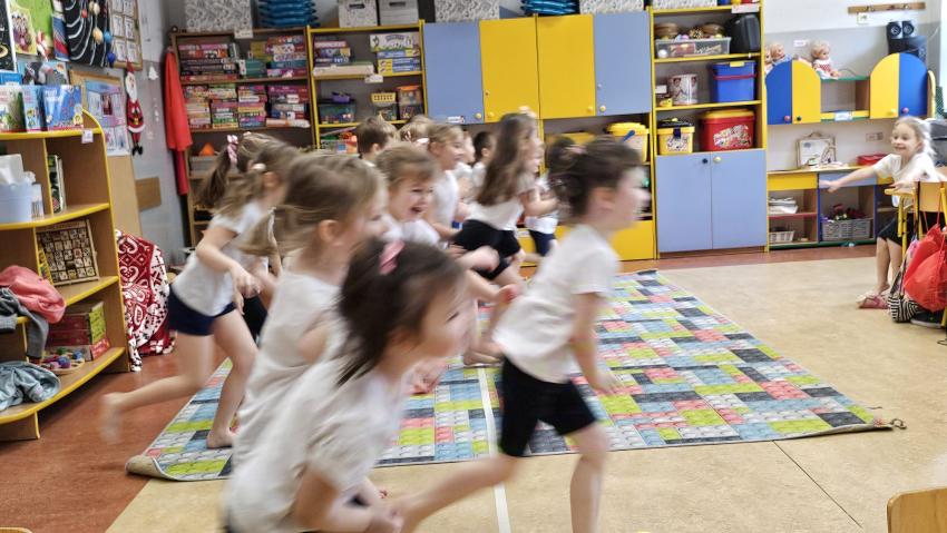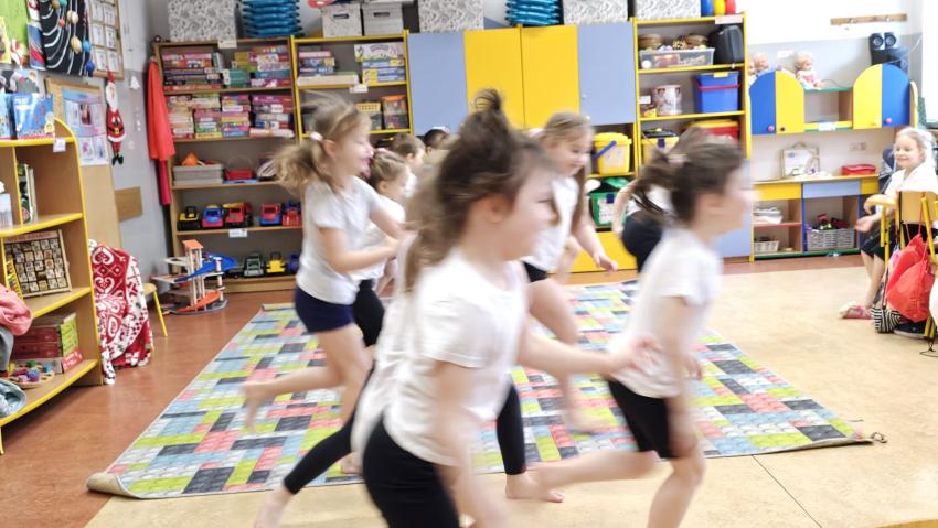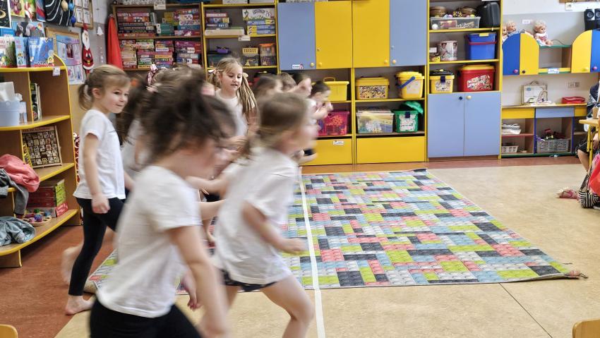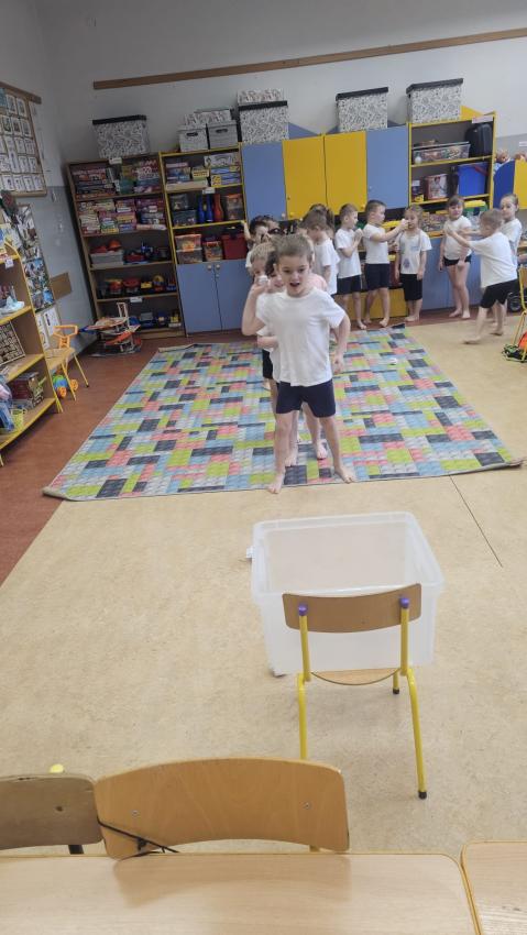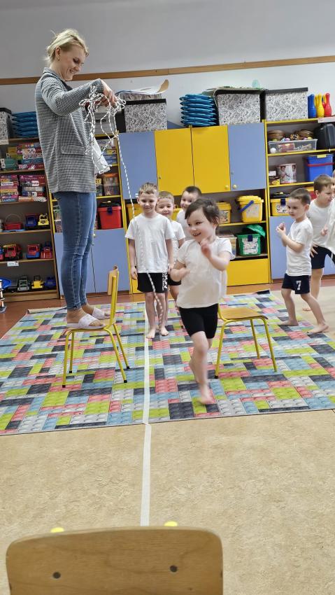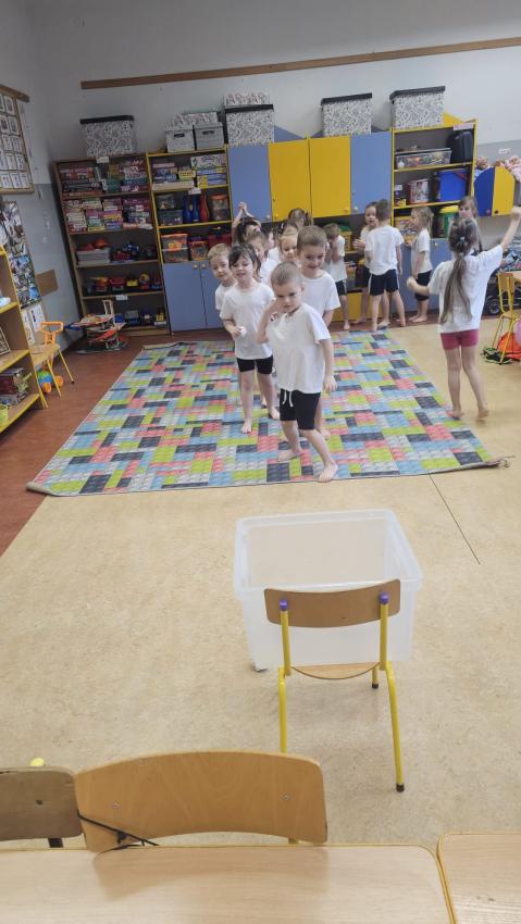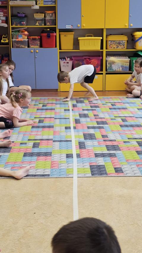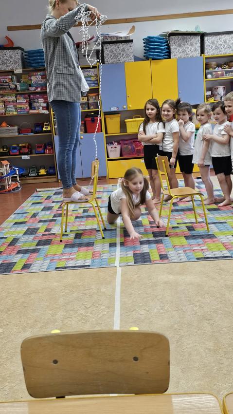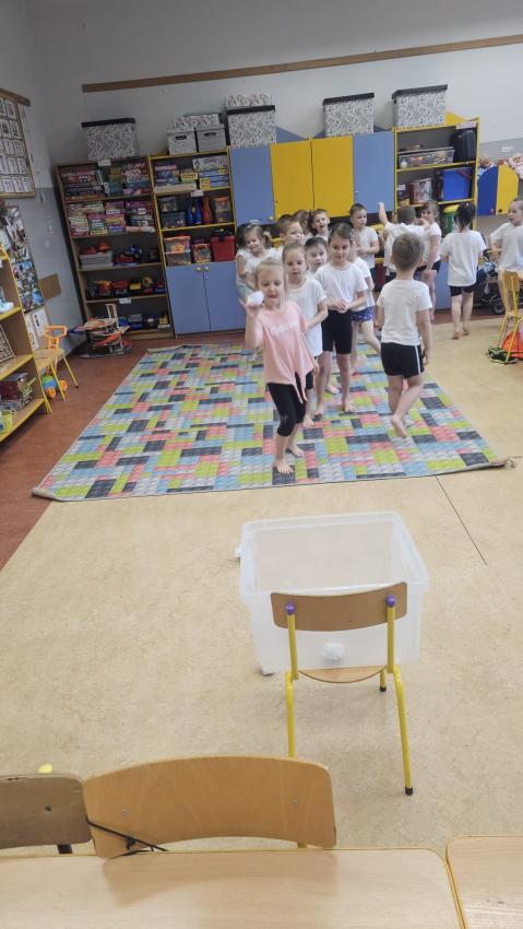 "Gimnastyka to podstawa i dla zdrowia, ważna sprawa. Ręce w górę, potem w bok i do przodu wielki skok". Krasnale dzielnie realizując kolejne zadania Ogólnopolskiego Projektu Edukacyjnego "W zdrowym ciele, zdrowy duch, wie to każdy mały zuch!".