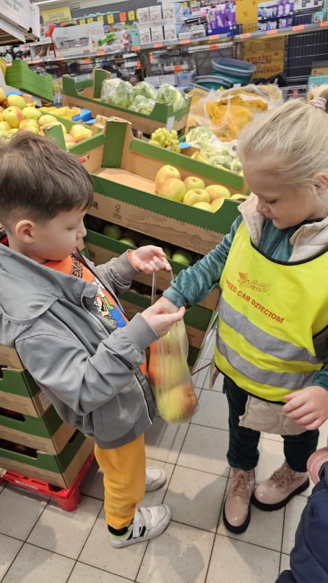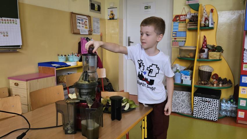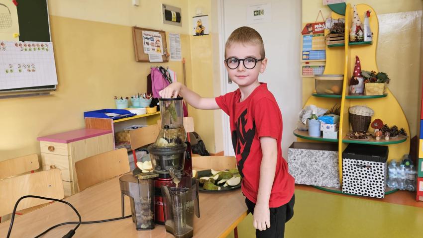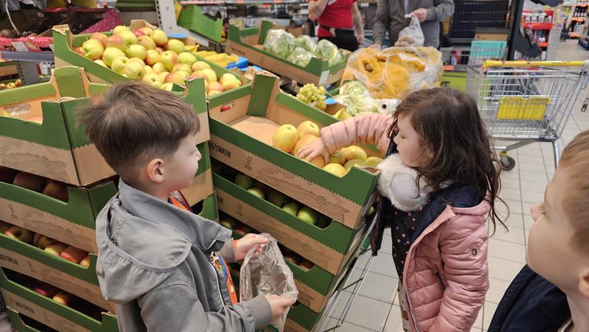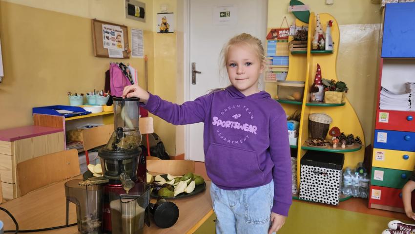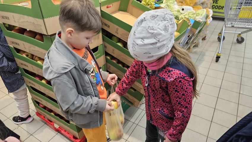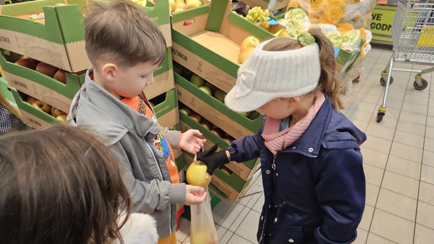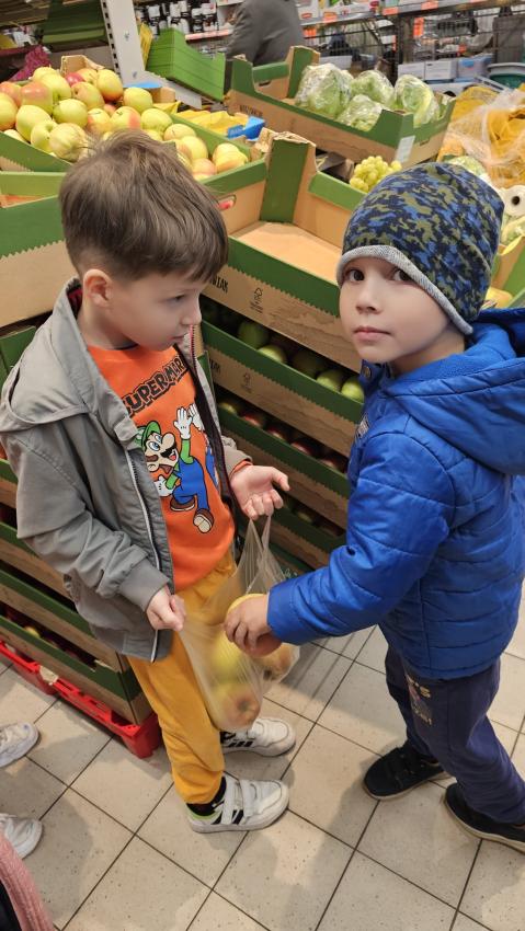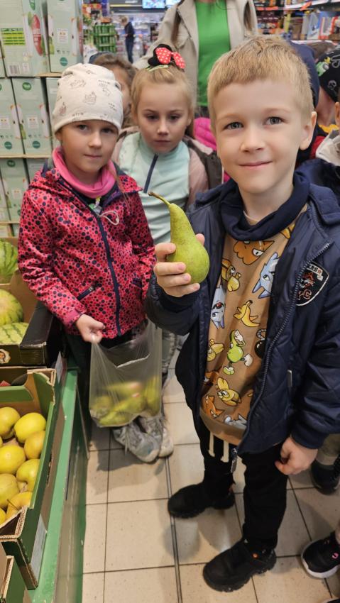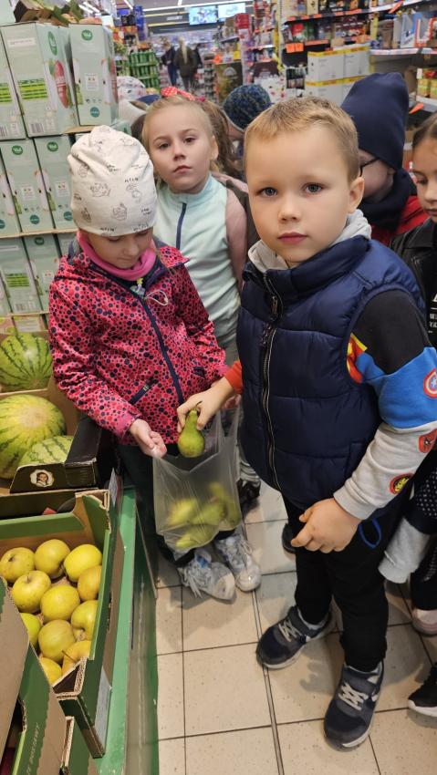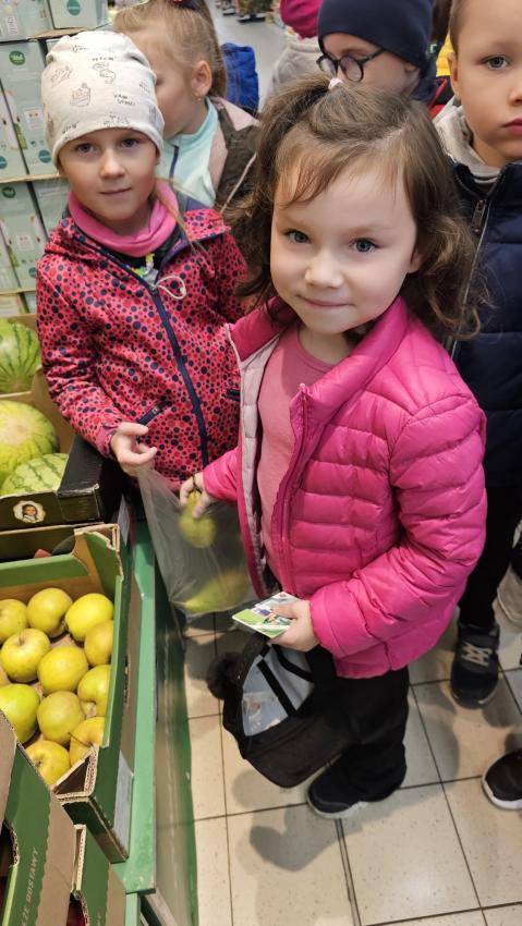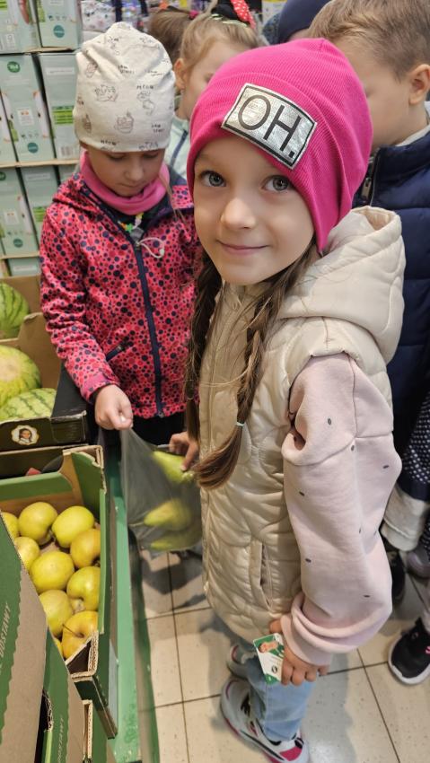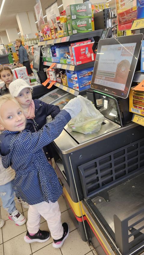 Krasnoludki wybrały się na zakupy. Dzieci kupiły owoce, z których samodzielnie wykonały pyszny i zdrowy sok. (Realizacja zadania Znamy witaminy - kolorowe talerze tworzymy- Ogólnopolskiego Projektu Edukacyjnego Postaw na wartości)