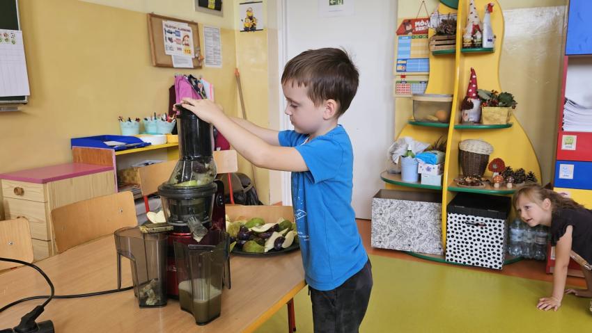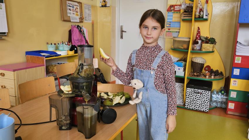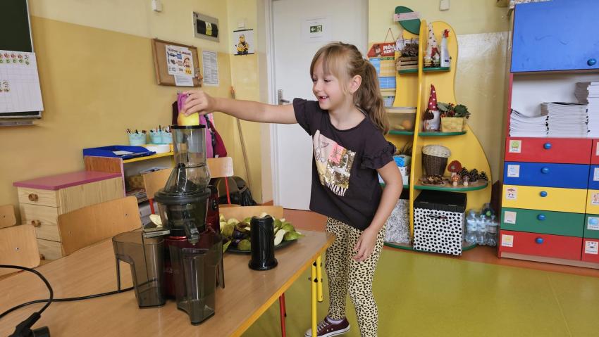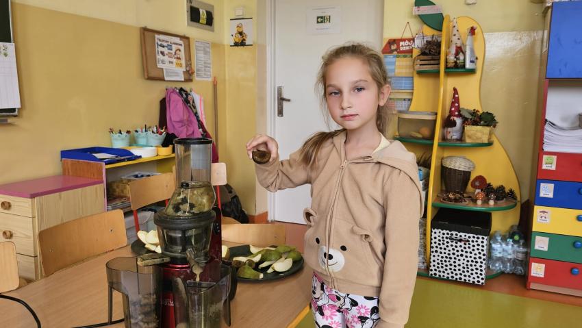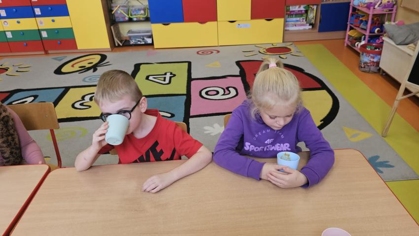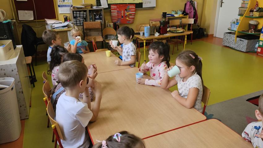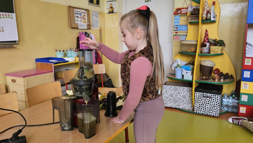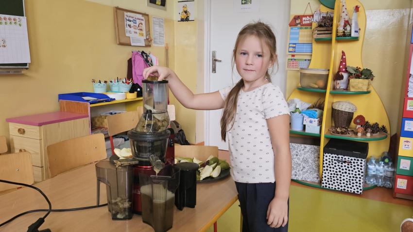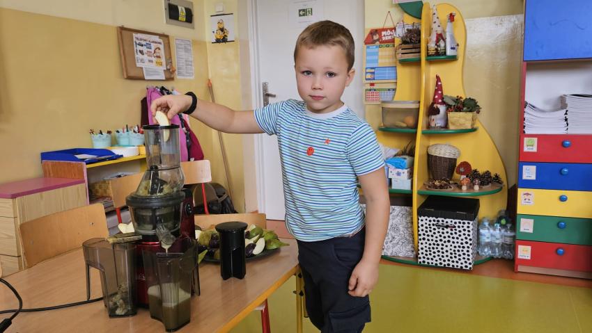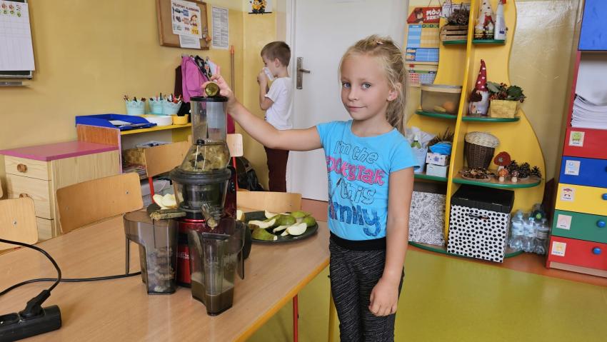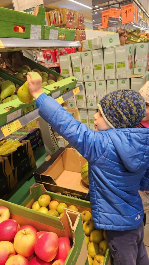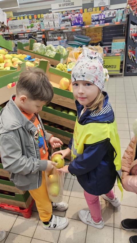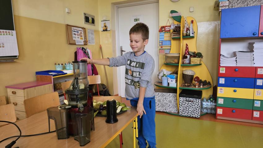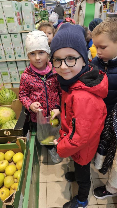 Krasnoludki wybrały się na zakupy. Dzieci kupiły owoce, z których samodzielnie wykonały pyszny i zdrowy sok. (Realizacja zadania Znamy witaminy - kolorowe talerze tworzymy- Ogólnopolskiego Projektu Edukacyjnego Postaw na wartości)