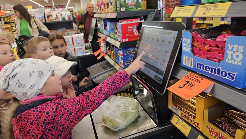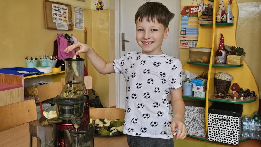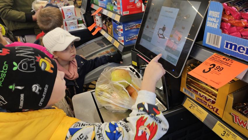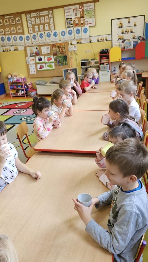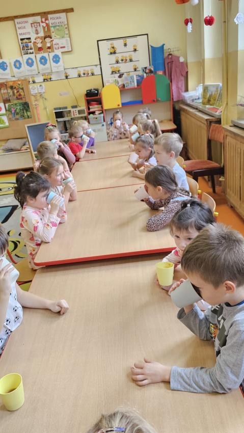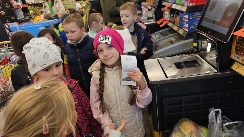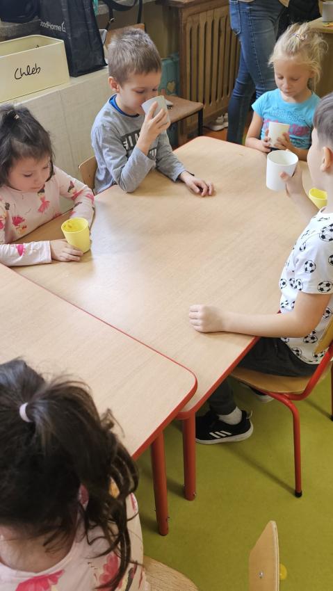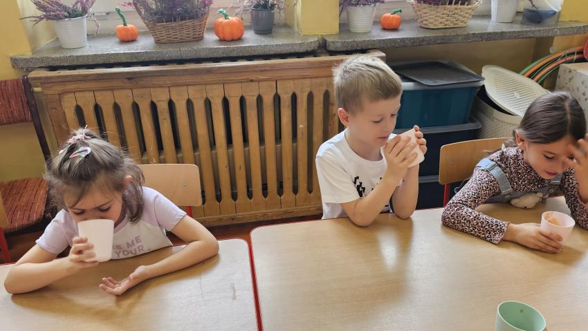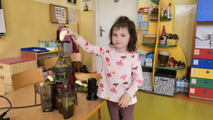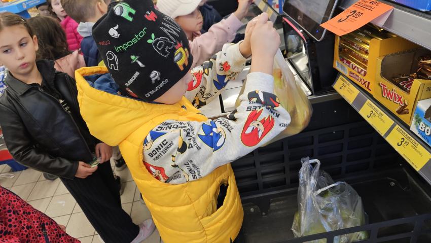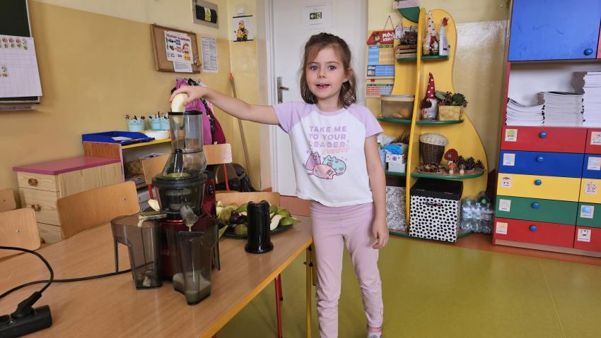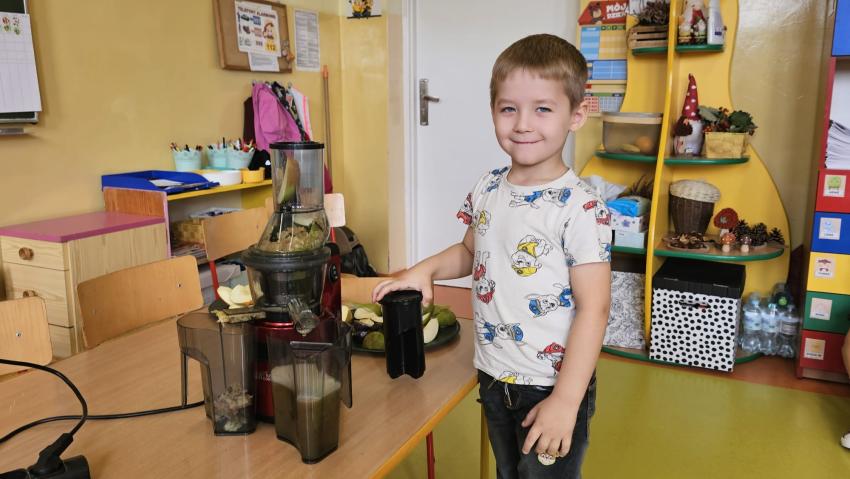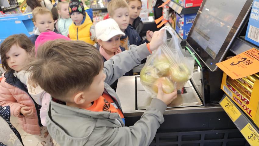 Krasnoludki wybrały się na zakupy. Dzieci kupiły owoce, z których samodzielnie wykonały pyszny i zdrowy sok. (Realizacja zadania Znamy witaminy - kolorowe talerze tworzymy- Ogólnopolskiego Projektu Edukacyjnego Postaw na wartości)
