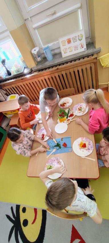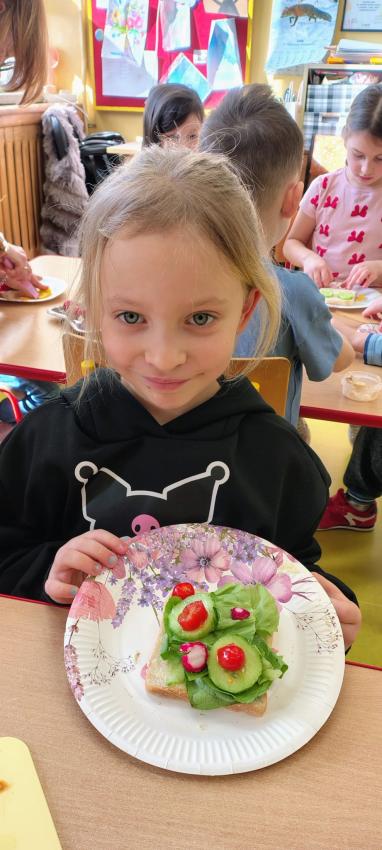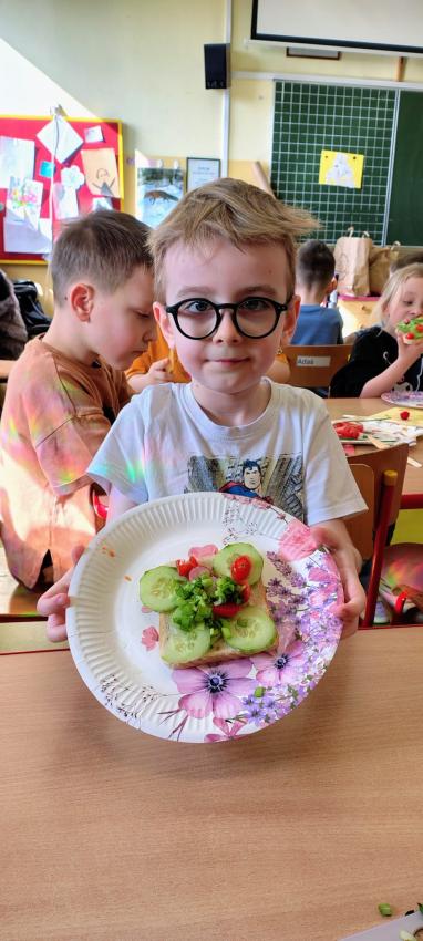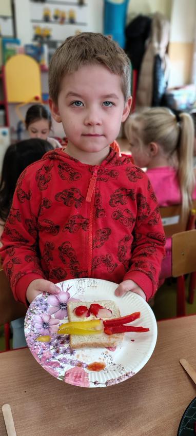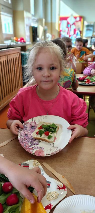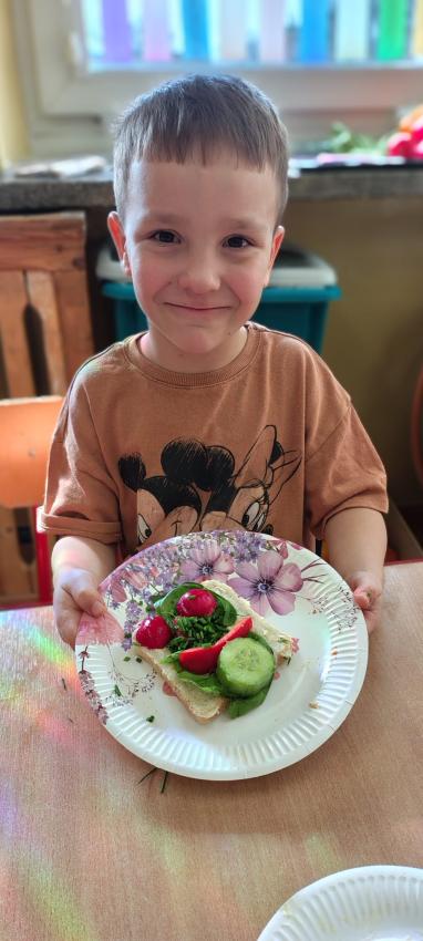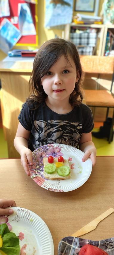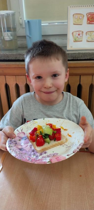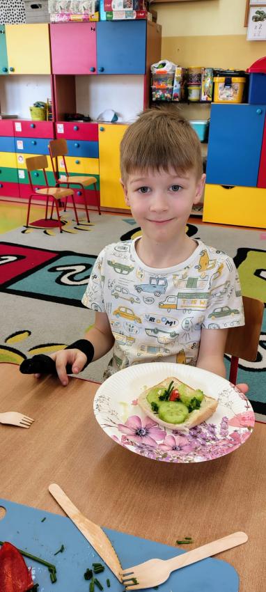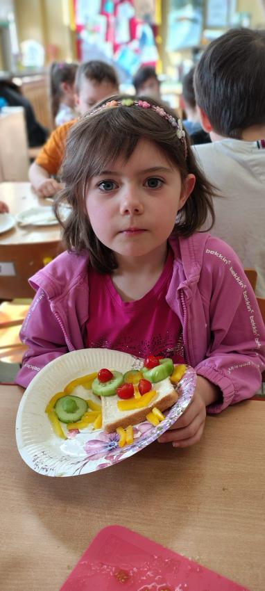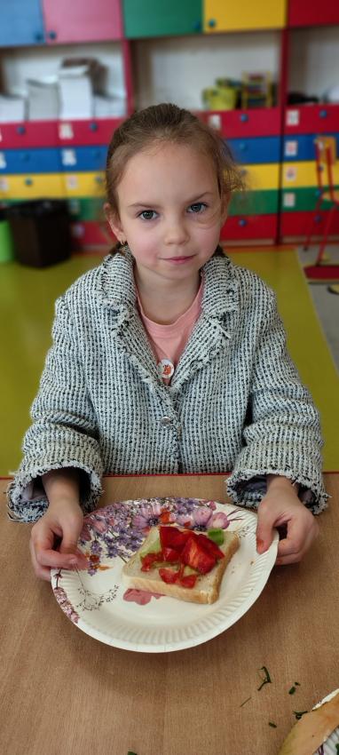 "Magiczna moc warzyw "-rewelacja zadania z Innowacji Pedagogicznej. Uświadomienie dzieciom pozytywnego wpływu warzyw oraz witamin w nich zawartych na zdrowie. Dzieci dowiedziały się co to znaczy, że odżywiamy się zdrowo i jak ważne jest jedzenie warzyw dla naszego organizmu oraz jaki wpływ mają one na nasze zdrowie. W związku z tym Dzieci samodzielnie przygotowały kolorowe warzywne kanapeczki. Dzieci z ogromnym zaangażowaniem i radością samodzielnie kroiły różne warzywa i robiły przecudne kompozycje na swoich kanapeczkach. Na koniec najlepsze - jedzenie tych pysznych kanapeczek. Mniam,mniam.