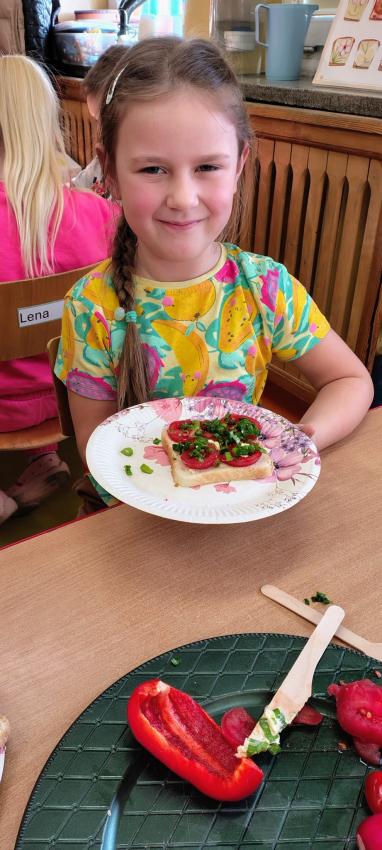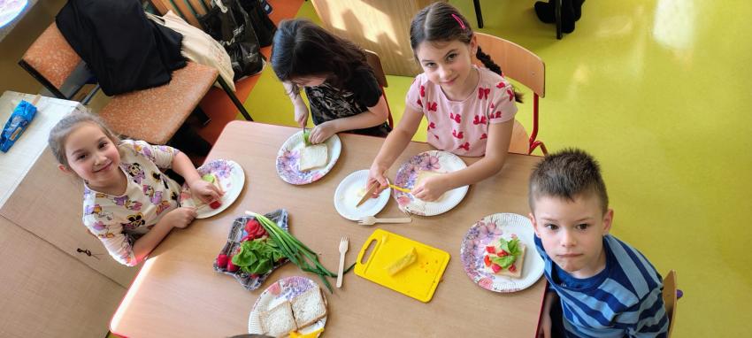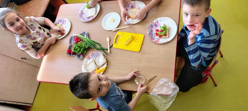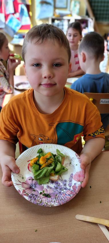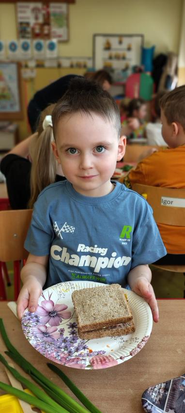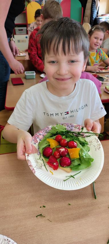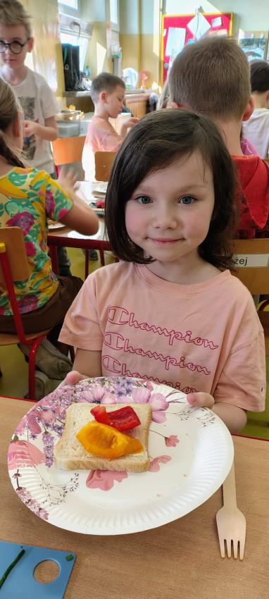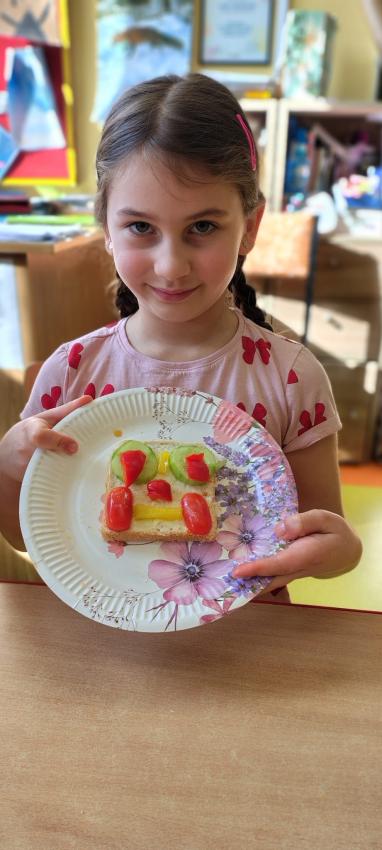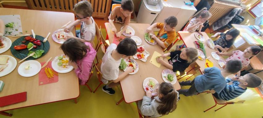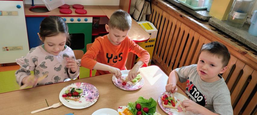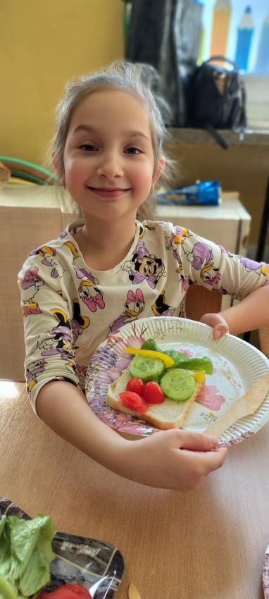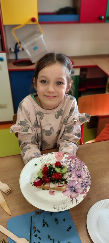 "Magiczna moc warzyw "-rewelacja zadania z Innowacji Pedagogicznej. Uświadomienie dzieciom pozytywnego wpływu warzyw oraz witamin w nich zawartych na zdrowie. Dzieci dowiedziały się co to znaczy, że odżywiamy się zdrowo i jak ważne jest jedzenie warzyw dla naszego organizmu oraz jaki wpływ mają one na nasze zdrowie. W związku z tym Dzieci samodzielnie przygotowały kolorowe warzywne kanapeczki. Dzieci z ogromnym zaangażowaniem i radością samodzielnie kroiły różne warzywa i robiły przecudne kompozycje na swoich kanapeczkach. Na koniec najlepsze - jedzenie tych pysznych kanapeczek. Mniam,mniam.