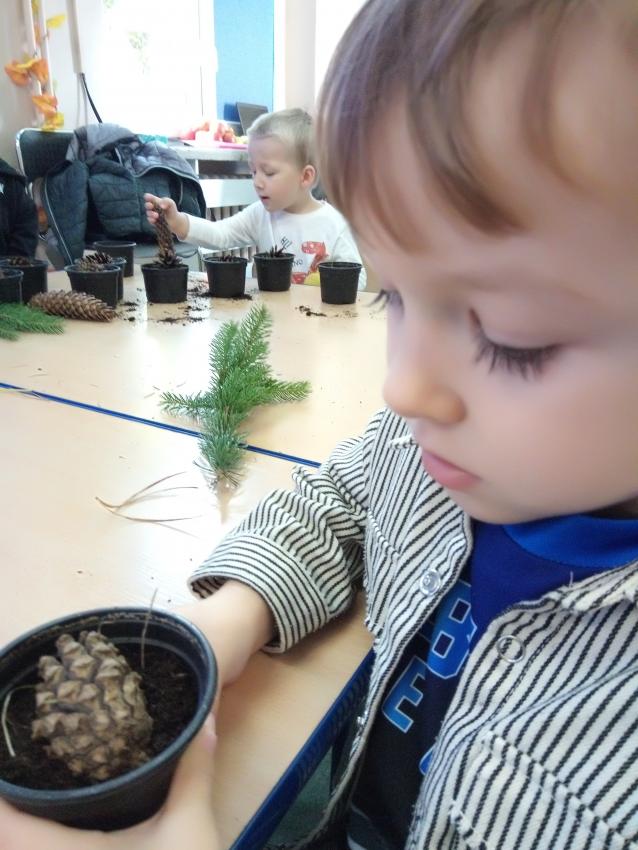 Dzisiaj grupa Kotków świętowała Dzień Drzewa. Wspólnie posadziliśmy lipę ,poznawaliśmy drzewa i posadziliśmy własne sosny z szyszek. Będziemy o nie dbać, aby wyrosły z nasionek.