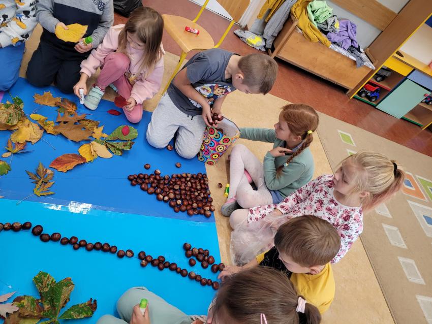 - grupa V wykonała zadanie 3. Drewnianki-kodowanki- zabawa w kodowanie z użyciem naturalnych materiałów przyrodniczych. Dzieci za pomocą kodu tworzyły jesienne liście, użyte podczas zabawy kasztany zostały zebrane przez dzieci.