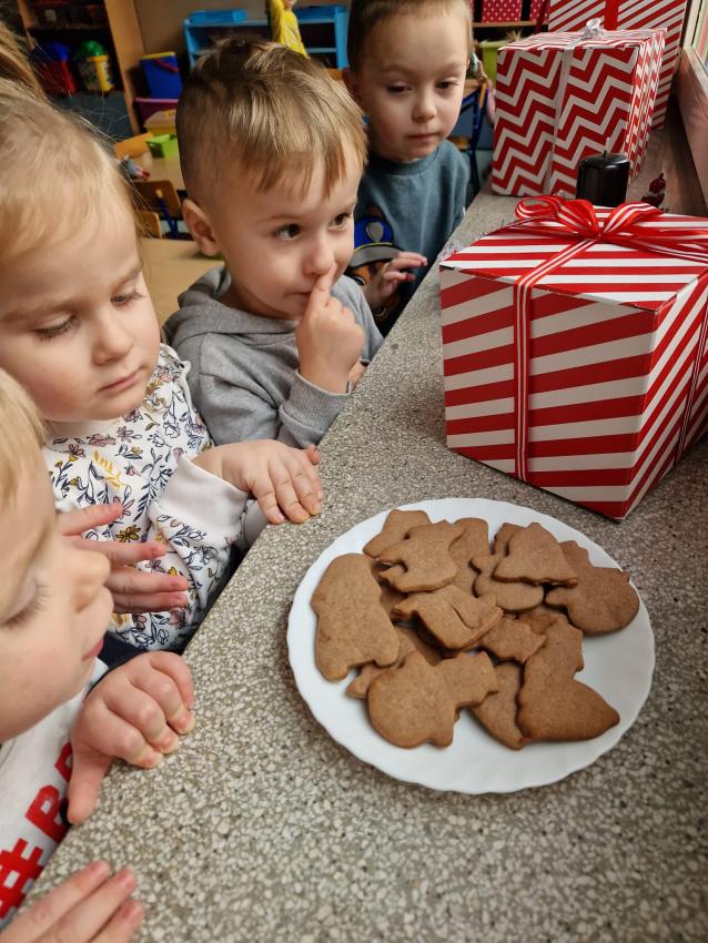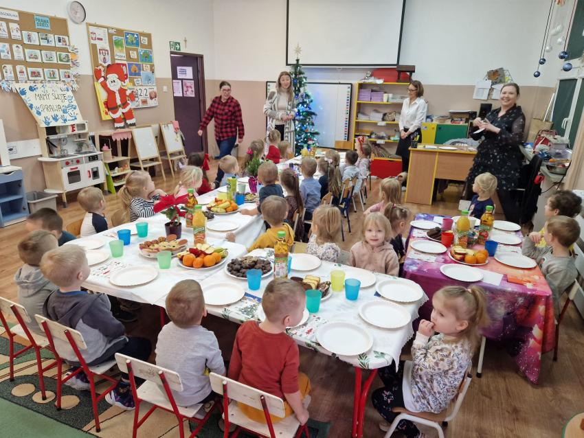 Krasnale czując już świąteczną atmosferę wraz z rodzicami i paniami zorganizowały spotkanie wigilijne. Dzięki nieocienionej pomocy rodziców grupa postanowiła świętować wraz z naszymi najmłodszymi grupami- Kotkami i Supersmykami. Jak starodawny zwyczaj nakazuje, dzieci wraz z panią Dyrektor i paniami złożyły sobie świąteczne życzenia dzieląc się opłatkiem, dzieci przepięknie zaśpiewały kolędę oraz przystąpiły do uroczystego poczęstunku. Było nam bardzo miło spędzić ten szczególny czas wspólnie, ciesząc się swoją obecnością i przepysznymi smakołykami. Nasze spotkanie świetnie wpisało się w realizację zadania 15. ?Savoir vivre przy stole? Międzynarodowy Projekt Edukacyjny ?Z kulturą mi do twarzy?.