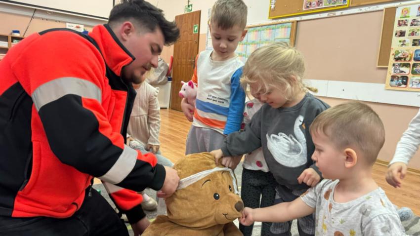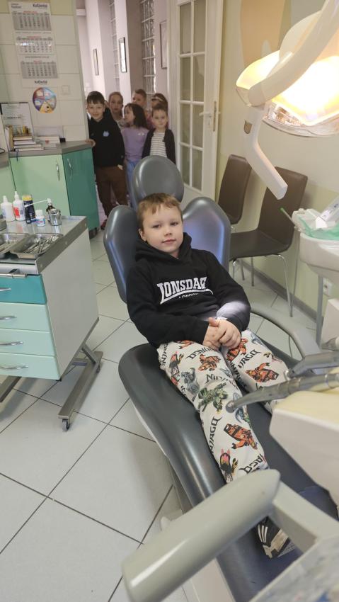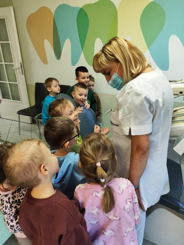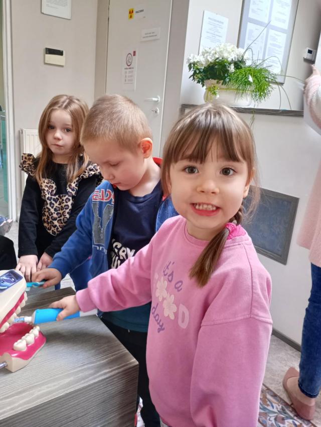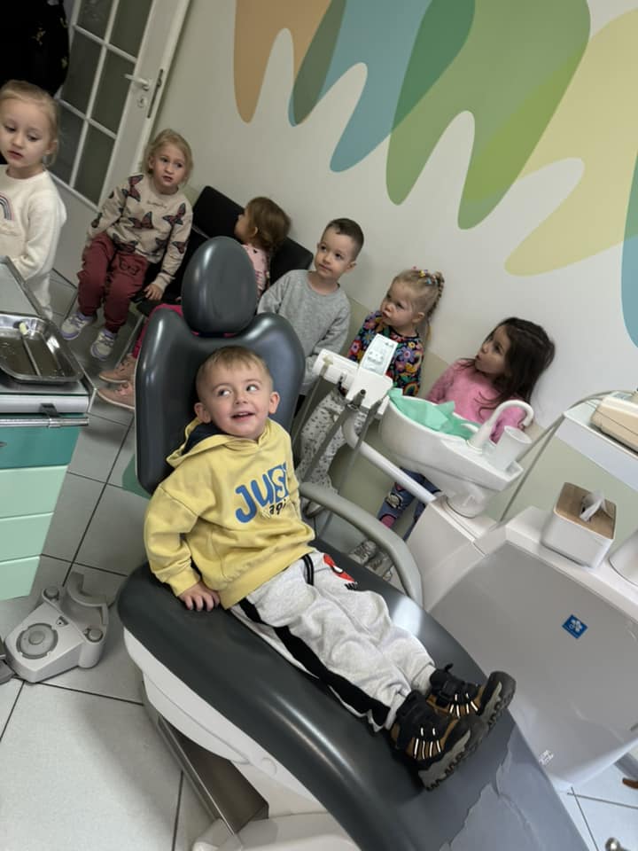 Biedronki wybrały się na wycieczkę do gabinetu stomatologicznego. Pani stomatolog zapoznała dzieci z wyposażeniem gabinetu stomatologicznego, a także pokazała narzędzia służące do badania i leczenia zębów. Następnie przeprowadziła pogadankę na temat prawidłowego mycia zębów m.in. na modelu tzw. ?dużej szczęki?, na którym przedszkolaki też mogły same poćwiczyć prawidłowe mycie ząbków. Pani stomatolog opowiedziała dzieciom na czym polega jej praca i zachęcała dzieci do regularnego dbania o zęby. Rozmawiała z dziećmi o negatywnym wpływie próchnicy na zęby mleczne i na zęby stałe oraz przypomniała dzieciom jakie pokarmy dobrze służą budowie zębów, a jakie je niszczą. Przedszkolaki dowiedziały się również jak dbać o zęby, by były zawsze piękne i zdrowe. Pani stomatolog z niezwykłą serdecznością skontrolowała zęby odważnych przedszkolaków.