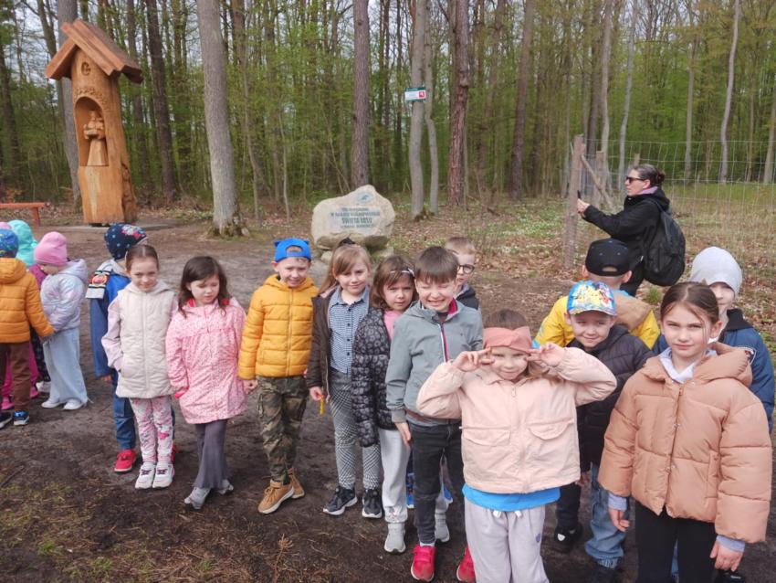 Dziś 5 i 6-latki wybrały się na wycieczkę do Lasu Kapturskiego na spotkanie z leśnikiem i zajęcia w terenie. Dzieci utrwaliły wiadomości na temat lasu i jego mieszkańców,poznały pracę leśniczego i gospodarkę leśną oraz zagrożenia dla lasu . Mogły podziwiać także wspaniały pomnik przyrody - 300-letni dąb. Na zakończenie każdy otrzymał pamiątkową kolorowankę i mógł podziwiać niezwykłe okazy owadów.