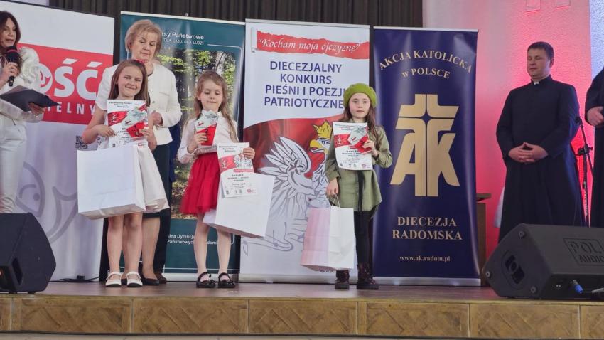 W dniu dzisiejszym trio z grupy Kotków (Matylda, Marcelina i Aron) oraz Basia z grupy Krasnoludków wzięli udział w etapie diecezjalnym Konkursu Pieśni i Poezji Patriotycznej "Kocham Moją Ojczyznę".