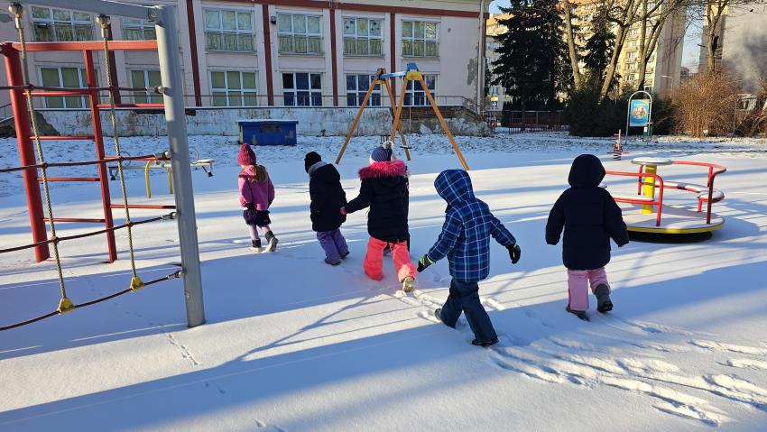 Dzieci z grupy Krasnoludki w ramach realizacji Ogólnopolskiego Projektu Edukacyjnego ?Z darami natury świat nie jest ponury !? wykonały zimowe zadanie ?Zimowe podchody?- zabawy tropiące. Dzieci tropiły ukrytą panią podążając za śladami na śniegu.