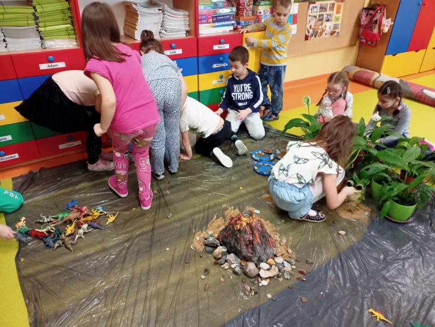 Grupę Supersmyków opanowały dinozaury. Były wykopaliska tworzenie szkieletów przeliczanie rodzin. Ugniataliśmy masę solną z której powstały piękne figurki. W przedszkolu pojawiły się nawet dziwne ślady, które zaprowadziły nas na salę gimnastyczną, gdzie wszyscy pokonali tor przeszkód, a na końcu zobaczyliśmy wybuch wulkanu. To był tydzień pełen niespodzianek.