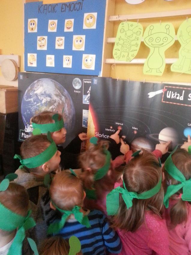 20 lutego nasze Słoneczka uczestniczyły w zajęciu,którego celem było przybliżenie wiadomości o kosmosie. Zabawy rozpoczęliśmy piosenką"My jesteśmy Ufoludki". Dzieci rozwiązywały zagadki o kosmosie, poznały planety Układu Słonecznego,rozmawiały również w języku kosmitów. Było dużo śmiechu i radości.