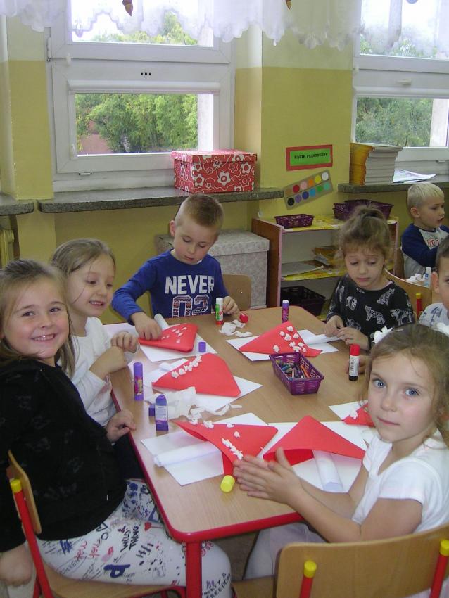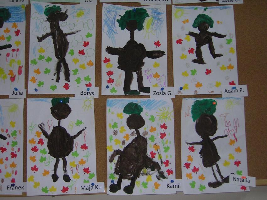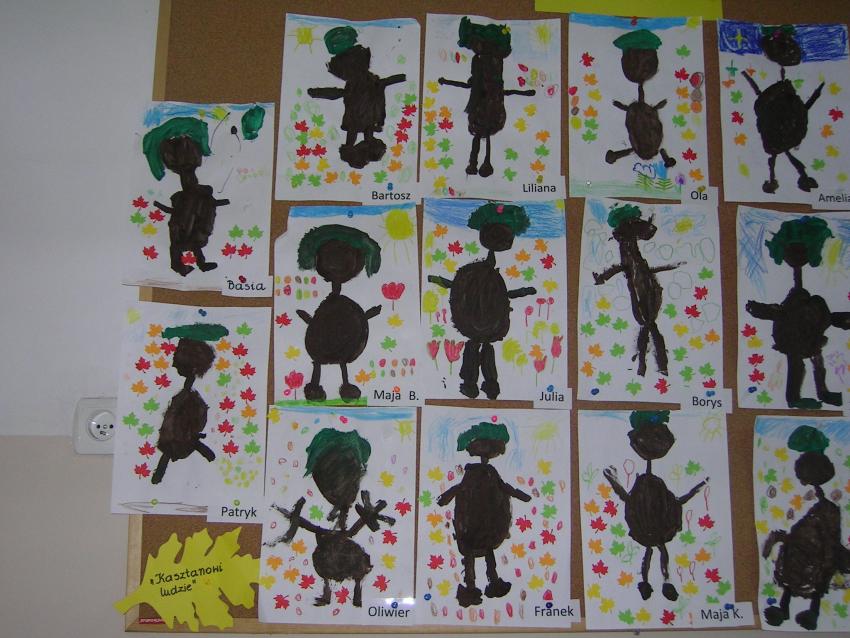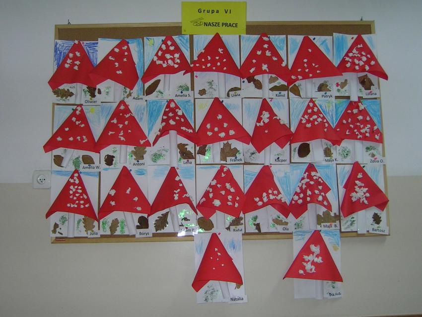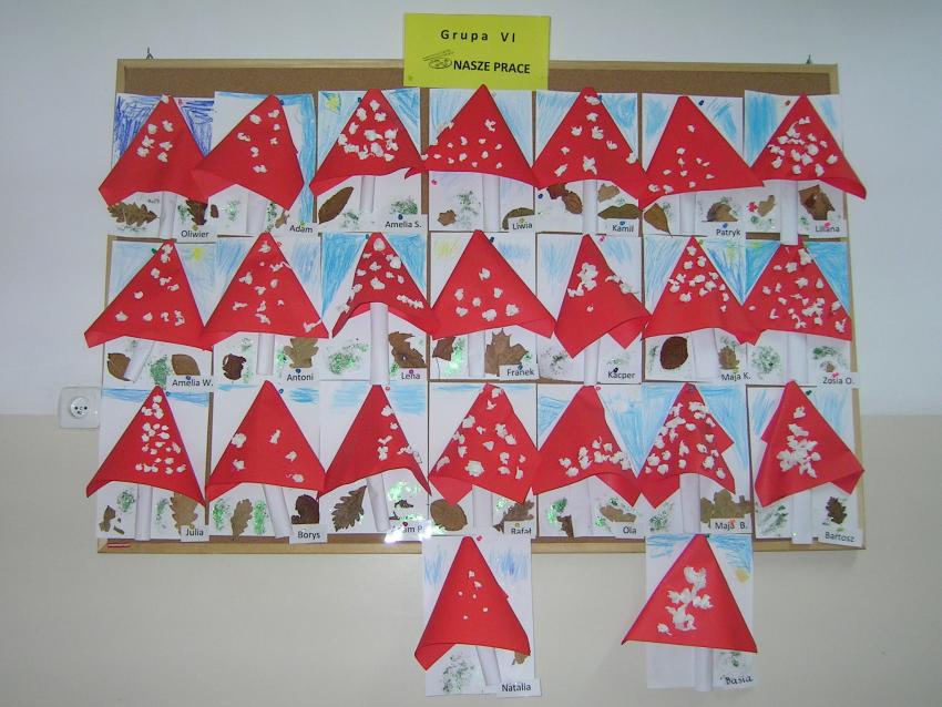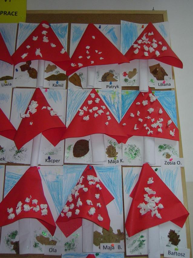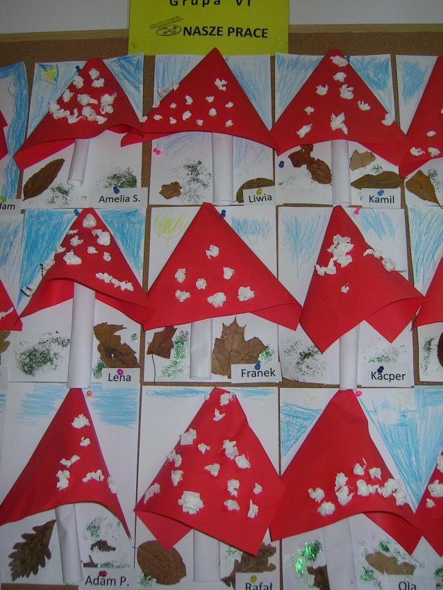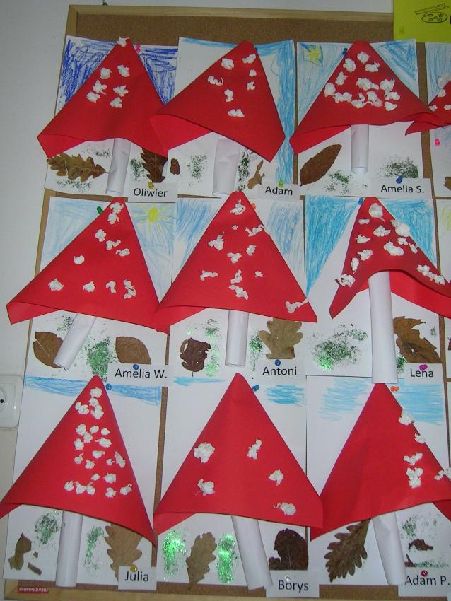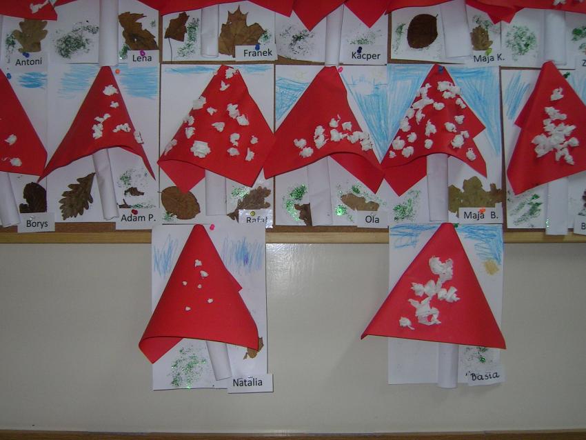 Bardzo lubimy wykonywać prace plastyczne. Wycinanie i wyklajanie "Budynku szkoły" było świetną zabawą. Malowanie "Kasztanowych ludzi" po spacerze w parku Leśniczówka przypomniało nam, jakie cuda można robić z kasztanów. Praca "Muchomor czerwony" była inspirowana wystawą grzybów, którą obejrzeliśmy w dniu 10 października 2017 roku. Dowiedzielismy się wtedy, że z grzybami nie ma żartów, chociaż są takie piękne i pachnące. Wkrótce kolejne prace!