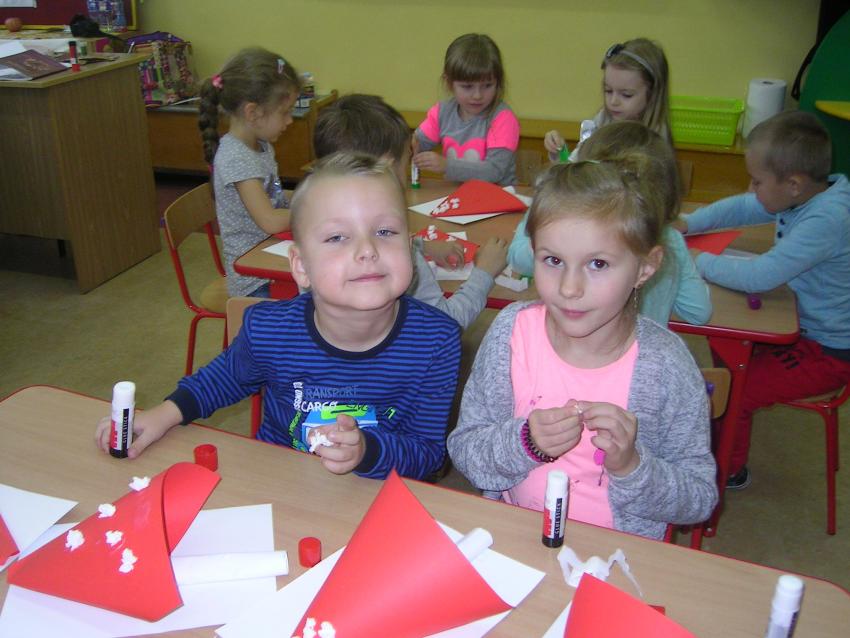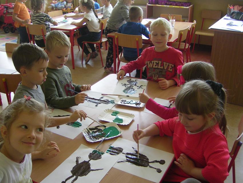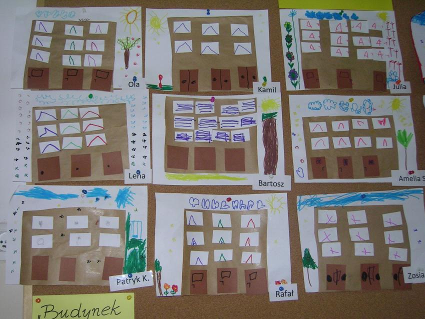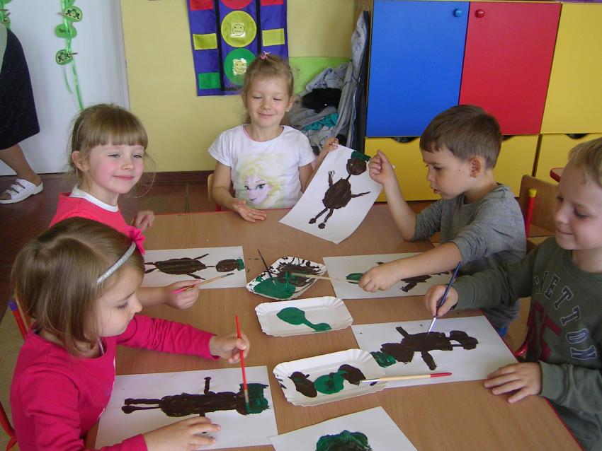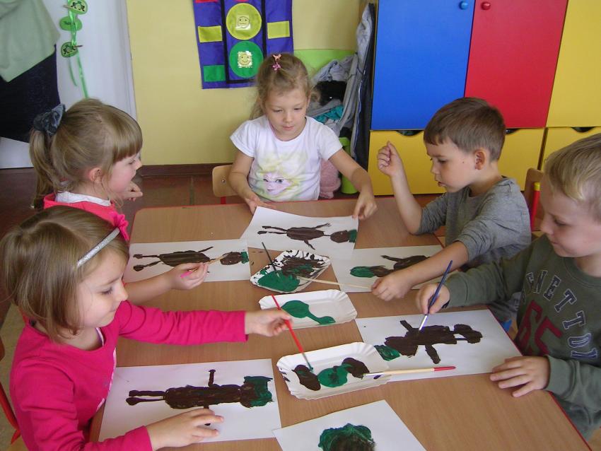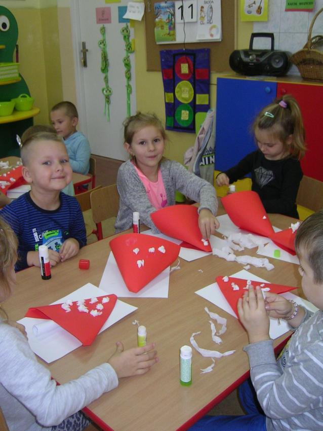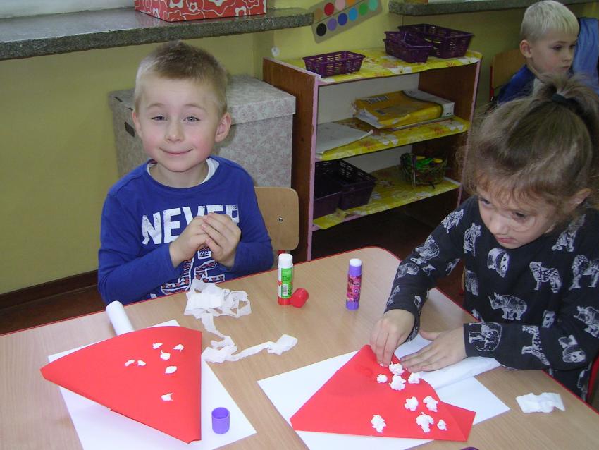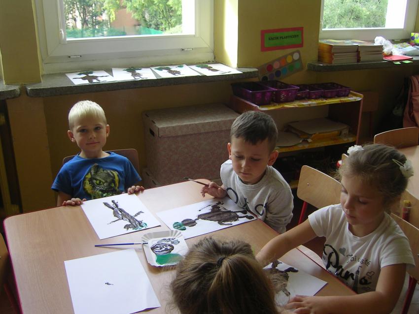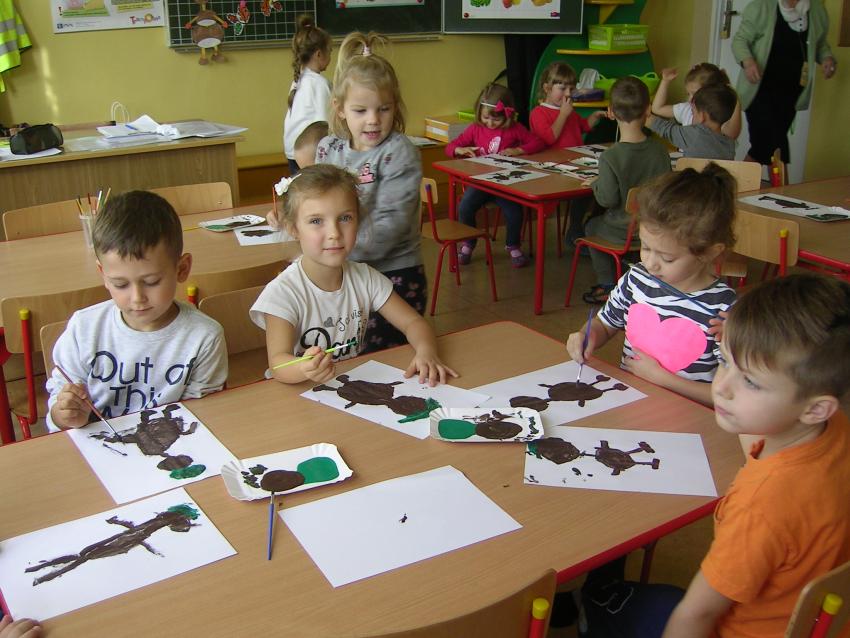 Bardzo lubimy wykonywać prace plastyczne. Wycinanie i wyklajanie "Budynku szkoły" było świetną zabawą. Malowanie "Kasztanowych ludzi" po spacerze w parku Leśniczówka przypomniało nam, jakie cuda można robić z kasztanów. Praca "Muchomor czerwony" była inspirowana wystawą grzybów, którą obejrzeliśmy w dniu 10 października 2017 roku. Dowiedzielismy się wtedy, że z grzybami nie ma żartów, chociaż są takie piękne i pachnące. Wkrótce kolejne prace!