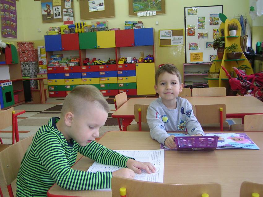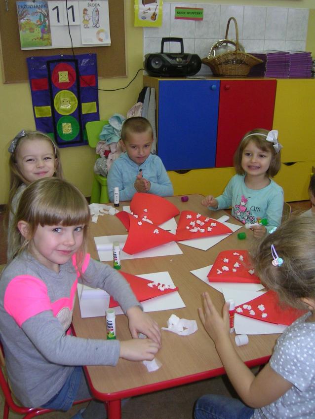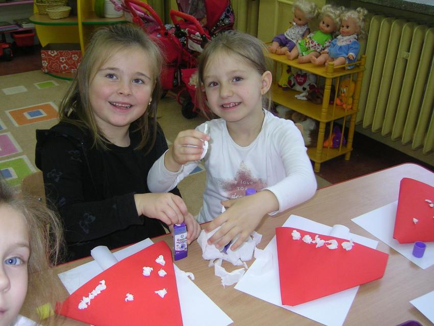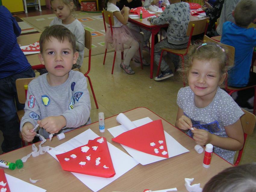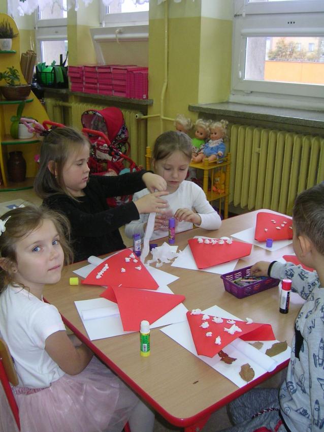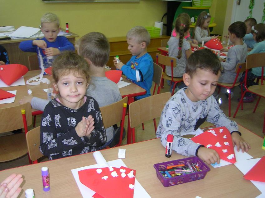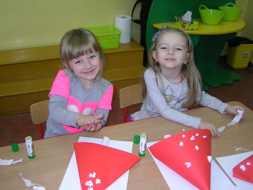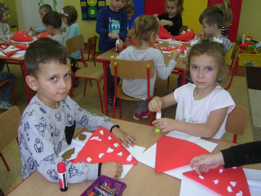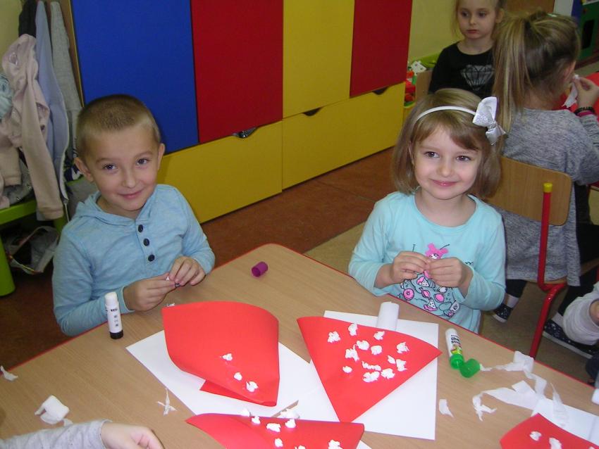 Bardzo lubimy wykonywać prace plastyczne. Wycinanie i wyklajanie "Budynku szkoły" było świetną zabawą. Malowanie "Kasztanowych ludzi" po spacerze w parku Leśniczówka przypomniało nam, jakie cuda można robić z kasztanów. Praca "Muchomor czerwony" była inspirowana wystawą grzybów, którą obejrzeliśmy w dniu 10 października 2017 roku. Dowiedzielismy się wtedy, że z grzybami nie ma żartów, chociaż są takie piękne i pachnące. Wkrótce kolejne prace!