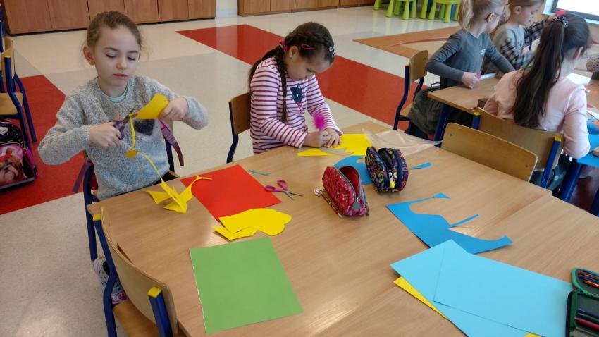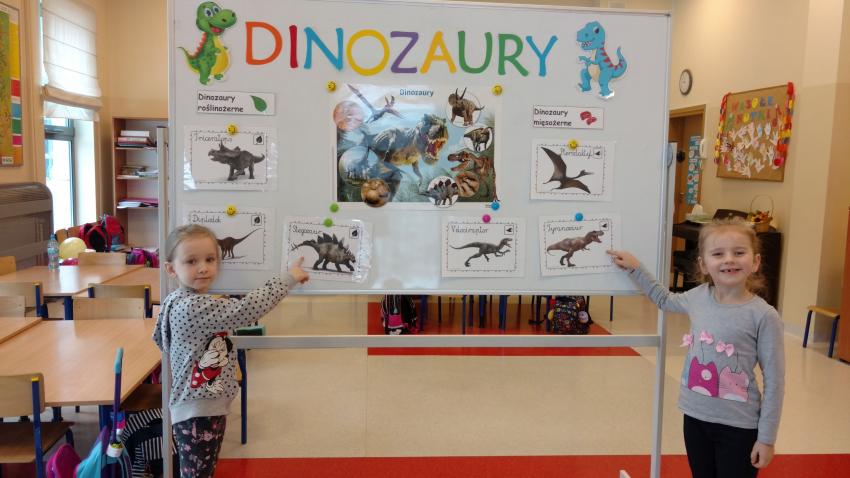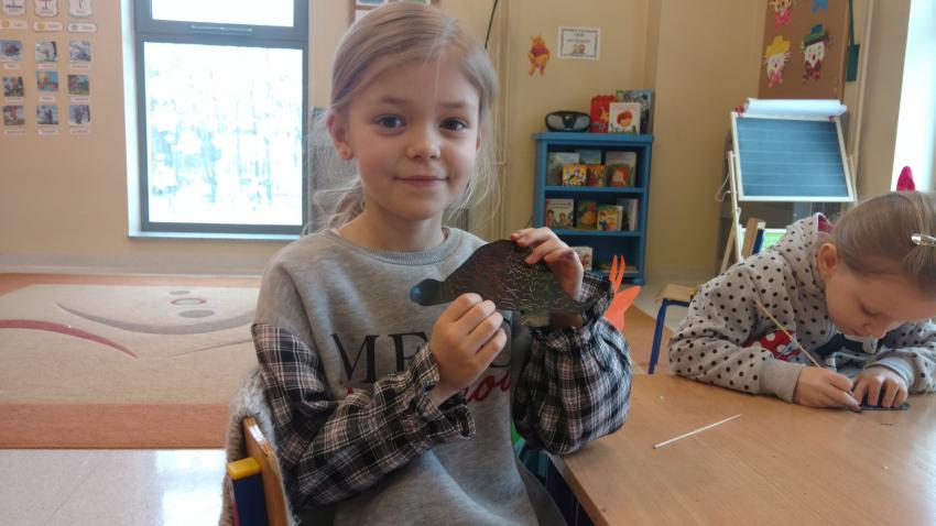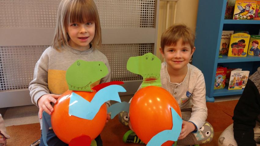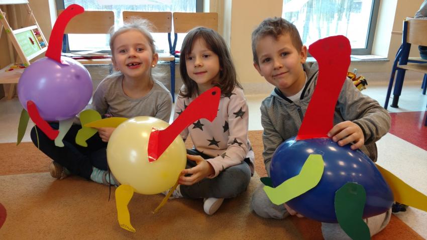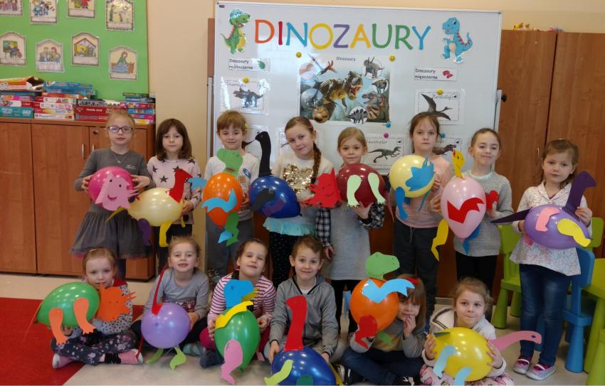Który dinozaur miał najdłuższą szyję? Czym się żywiły wielkie jaszczury? Dlaczego wyginęły dinozaury? Na te i jeszcze wiele innych pytań szukały odpowiedzi przedszkolaki z grupy IX. Szybko okazało się, że dzieci wiele wiedzą na ten temat i mają wśród dinozaurów swoich ulubieńców. Podczas wspólnych zabaw dzieci wykonały dinozaury z balonów. Poznały również nową technikę plastyczną „wydrapywanki”. Podążając zaś śladami prehistorycznych gadów doskonaliły umiejętność analizy i syntezy głoskowej. Wszyscy świetnie się bawili, chętnie wykonując powierzone im zadania.