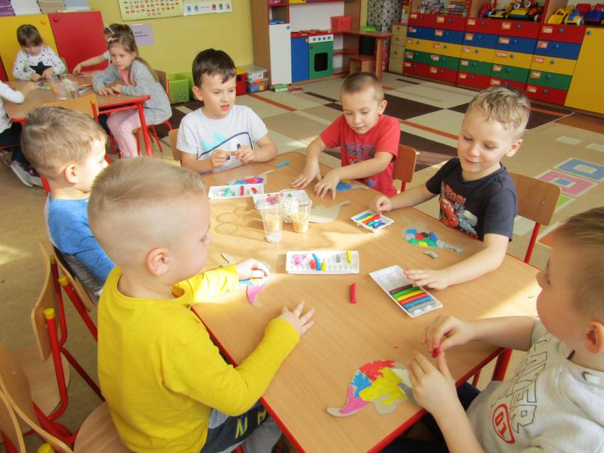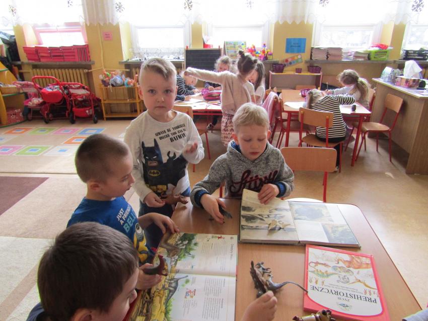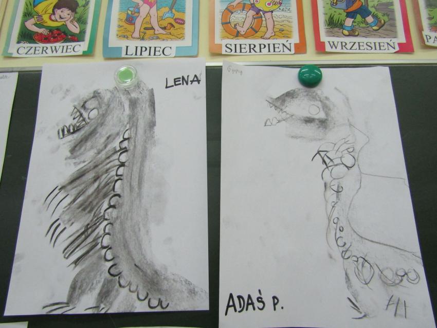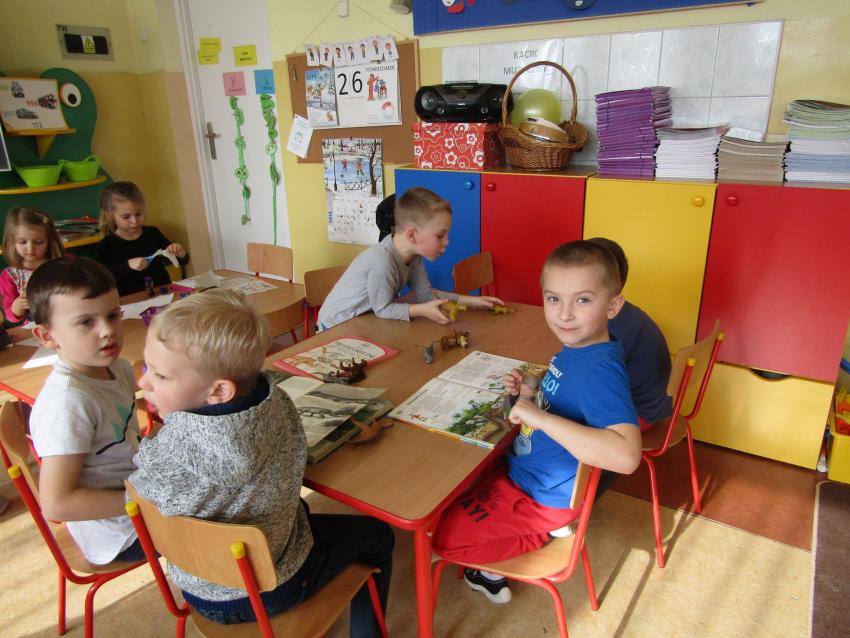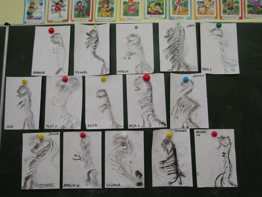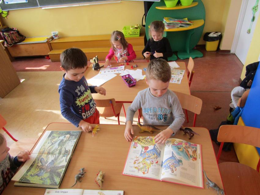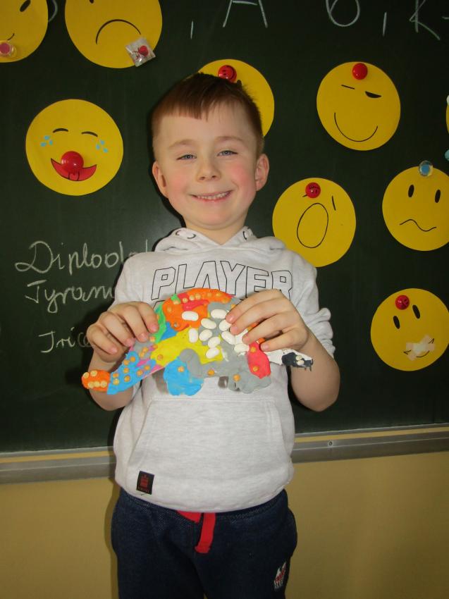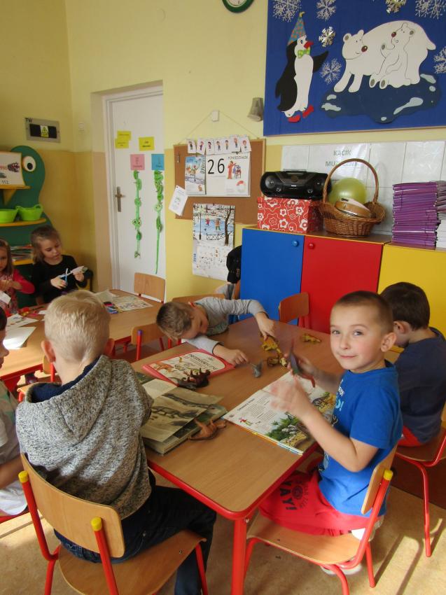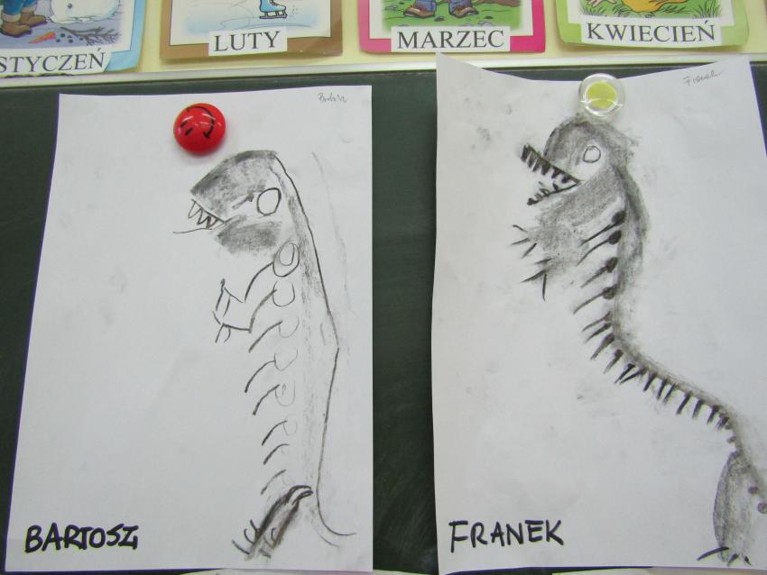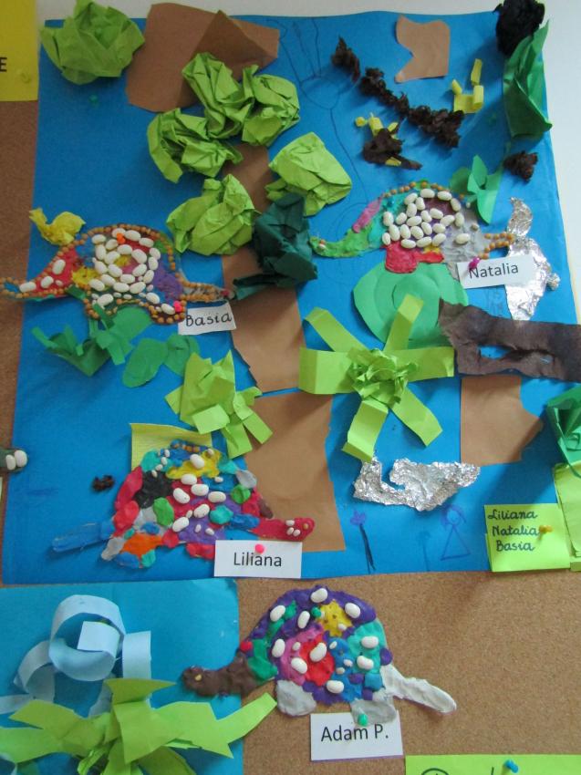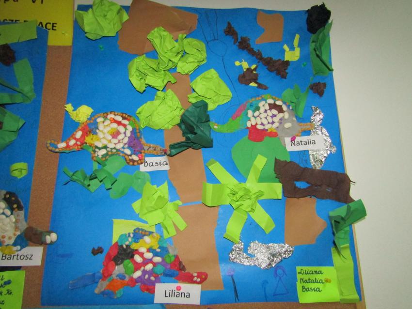 W dniach 26 luty - 2 marca uczyliśmy się o życiu dinozaurów. Dzieci przyniosły książki, figurki, które wykorzystaliśmy w trakcie zajęć. Stworzyliśmy  zbiorowe prace plastyczne "Park dinozaurów" przy użyciu kolorowych papierów, folii, tektury i lepliliśmy sylwetki dinozaurów, ozdabiając je ciekawymi materaiałami (ryżem, grichem, fasolą, kaszą). Bardzo podobały nam sie bajki o dinozaurach, które przyniosła Lilianka. Naśladowaliśmy ich zachowanie, wyobrażaliśmy sobie ich życie dawno temu. Zastanawialiśmy się nad teoriami naukowców na temat powodów ich wyginięcia, cóż to była za dyskusja. Czy zamarzły? Czy nastąpił wybuch olbrzymiej gwiazdy? Dzieci z wielkim zaangażowaniem i dużym zainteresowaniem wypowiadały się na temat  prehistorycznego życia. Rysowaliśmy węglem szkielety dinozaurów, które przypominały nam jak wiele można dowiedzieć się z wykopalisk na temat życia na Ziemi.