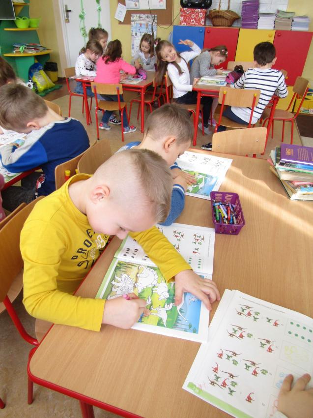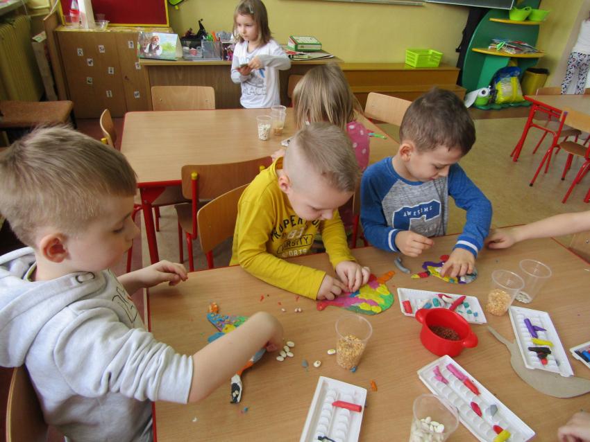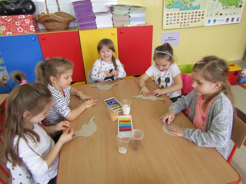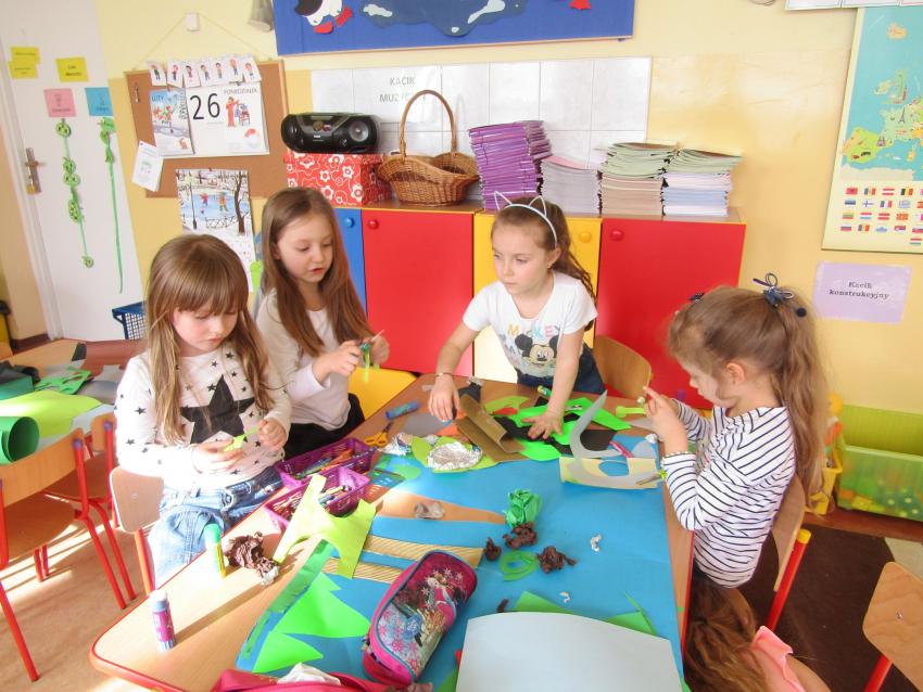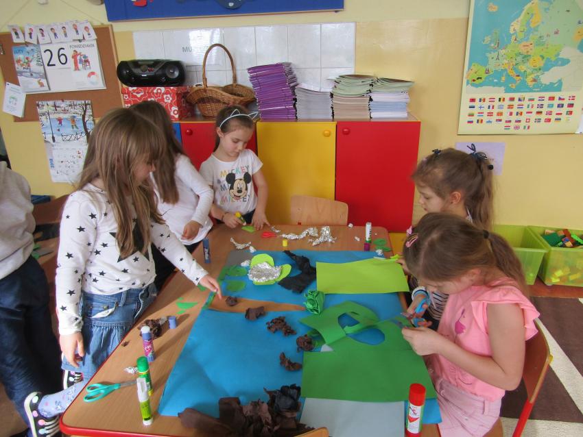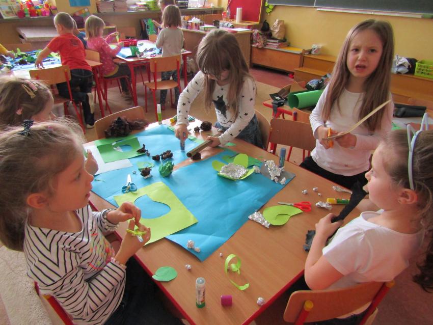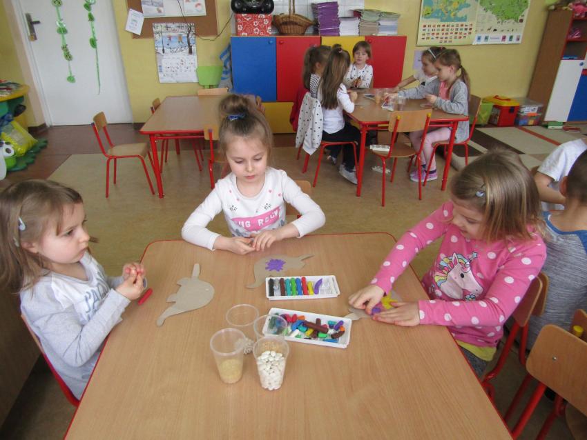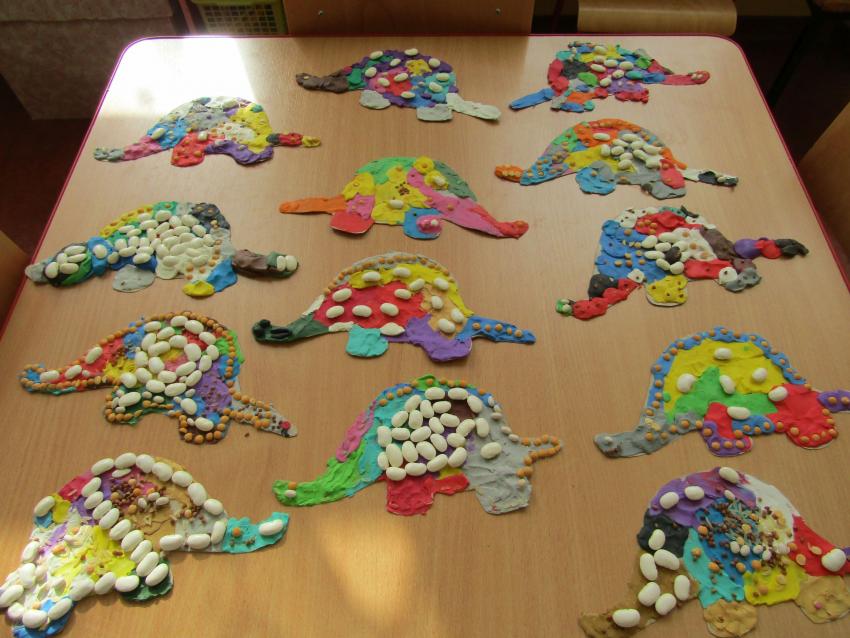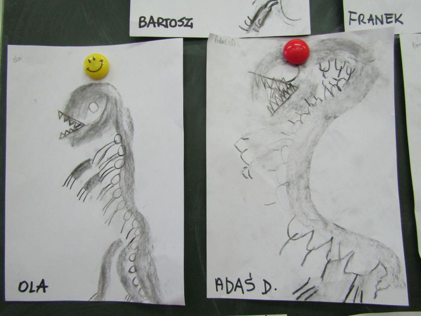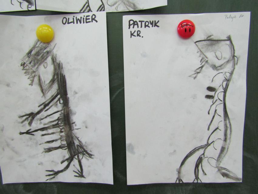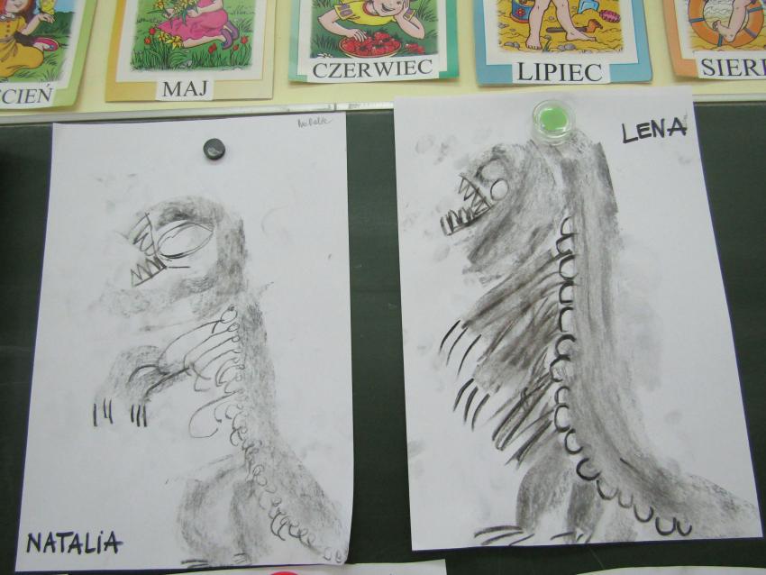 W dniach 26 luty - 2 marca uczyliśmy się o życiu dinozaurów. Dzieci przyniosły książki, figurki, które wykorzystaliśmy w trakcie zajęć. Stworzyliśmy  zbiorowe prace plastyczne "Park dinozaurów" przy użyciu kolorowych papierów, folii, tektury i lepliliśmy sylwetki dinozaurów, ozdabiając je ciekawymi materaiałami (ryżem, grichem, fasolą, kaszą). Bardzo podobały nam sie bajki o dinozaurach, które przyniosła Lilianka. Naśladowaliśmy ich zachowanie, wyobrażaliśmy sobie ich życie dawno temu. Zastanawialiśmy się nad teoriami naukowców na temat powodów ich wyginięcia, cóż to była za dyskusja. Czy zamarzły? Czy nastąpił wybuch olbrzymiej gwiazdy? Dzieci z wielkim zaangażowaniem i dużym zainteresowaniem wypowiadały się na temat  prehistorycznego życia. Rysowaliśmy węglem szkielety dinozaurów, które przypominały nam jak wiele można dowiedzieć się z wykopalisk na temat życia na Ziemi.