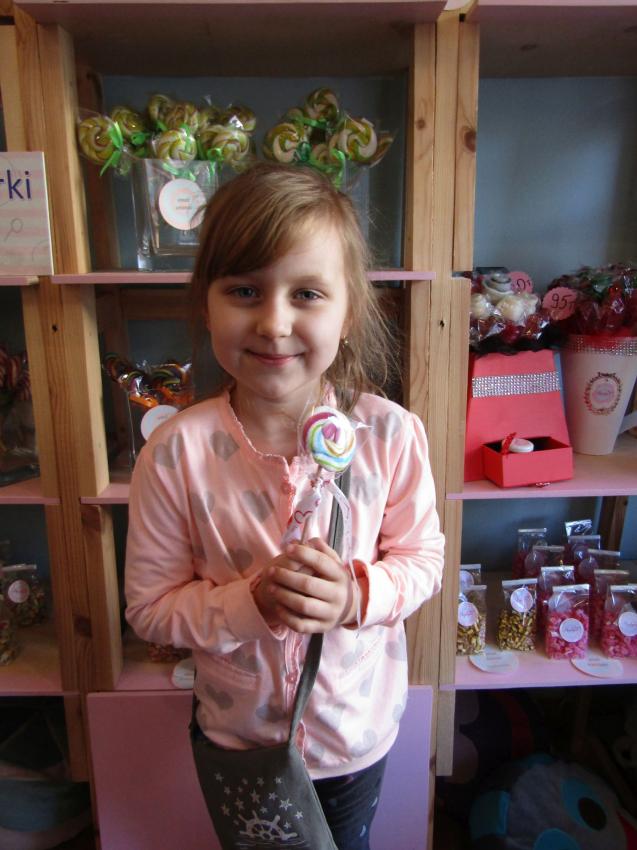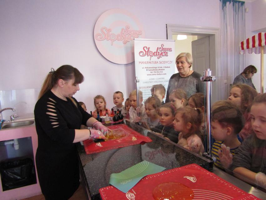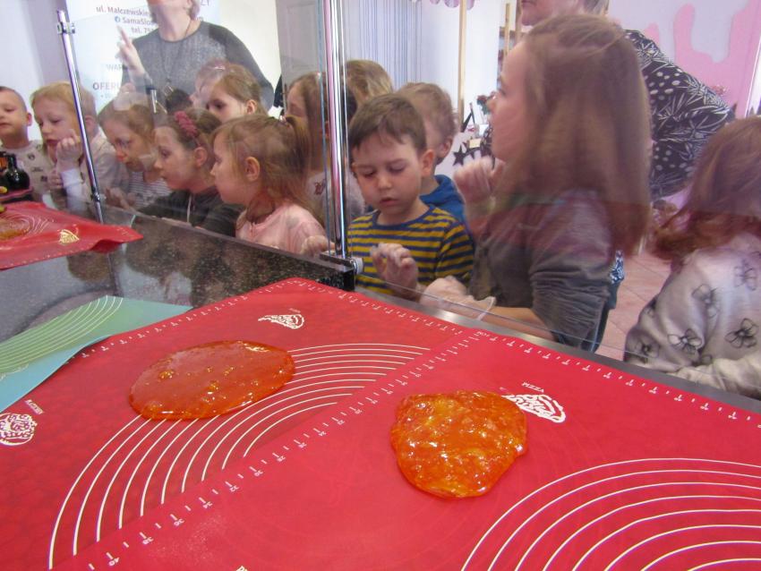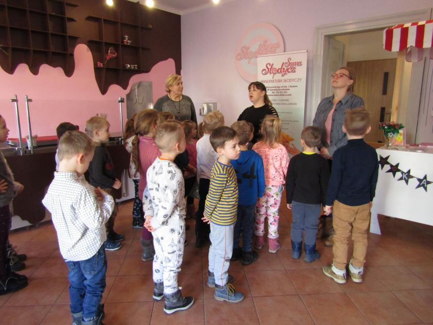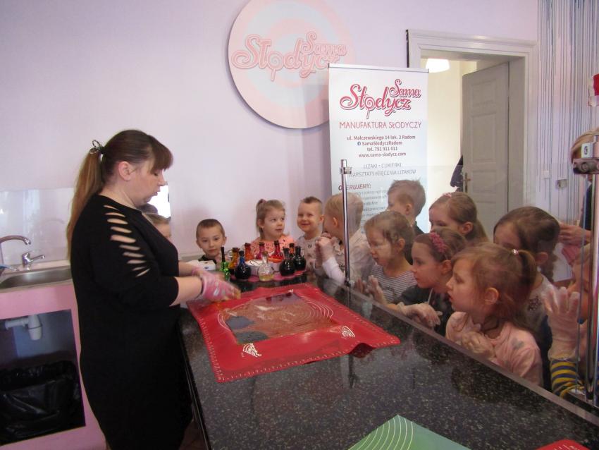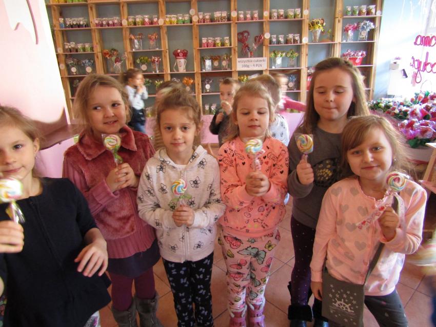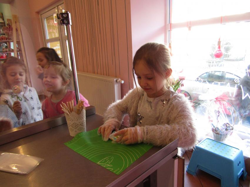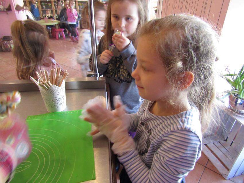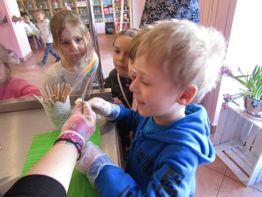 Z okazji Dnia Kobiet dzieci z grupy VI - Żabki, wybrały sie do manufaktury słodyczy "Sama słodycz" na warsztay z robienia lizaków. W kolorowej scenerii, półek pełnych słodkości, cukierków, lizaków uczyliśmy się o sposobie wytwarzania słodyczy. Dowiedzieliśmy się, jakie składniki są potrzebne do ich wytworzenia, które barwniki są naturalne i z czego pochodzą. Przygladaliśmy się także masie karmelowej, która z żółtej pod wpływem wyrabiania w powietrzu zamieniła się w białą. Razem z panią prowadzącą warsztaty wykonaliśmy samodzielnie lizaki, które pięknie zapakowaliśmy i z dumą prezentowaliśmy kolegom i koleżankom. Na koniec każde z dzieci otrzymało słodkie upominki i mogło dokonać samodzielnie zakupu wybranych słodkości. Po powrocie utrwaliliśmy sobie wiedzę na temat wytwarzania cukierków oraz rysowaliśmy według własnego pomysłu lizaki. To był słodki dzień. Chlopcy życzyli swoim koleżankom spełnienia marzeń i pięknych prezentów. Dziękujemy naszym chłopcom za odśpiewanie "Sto lat".