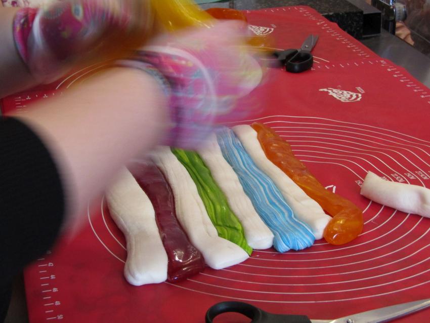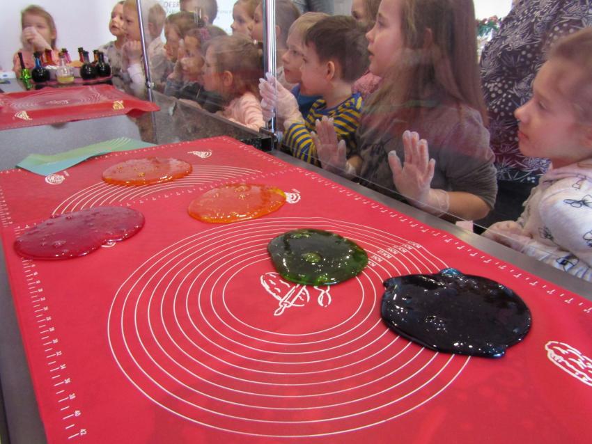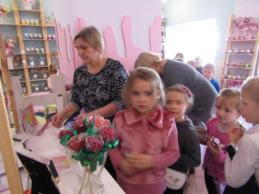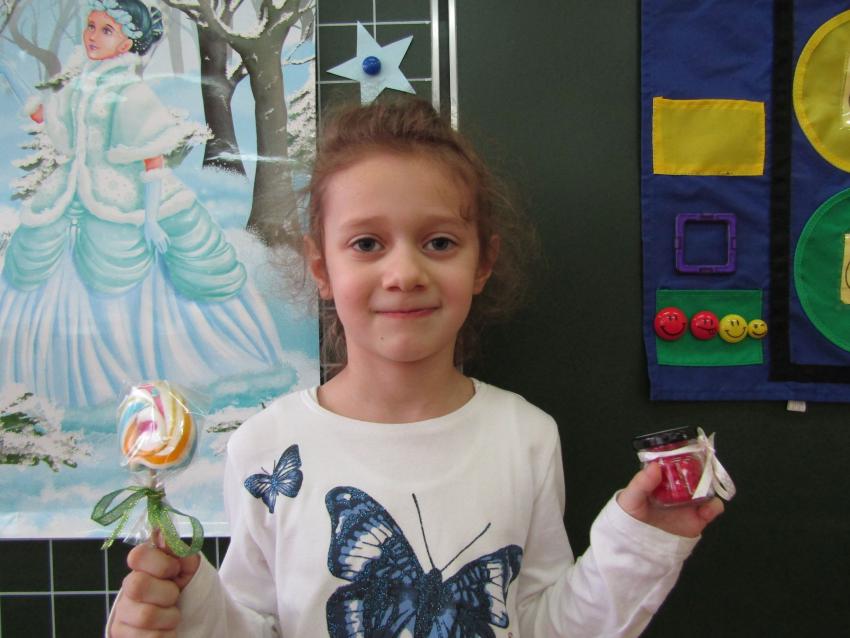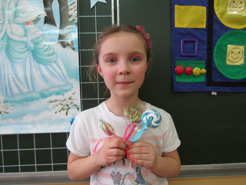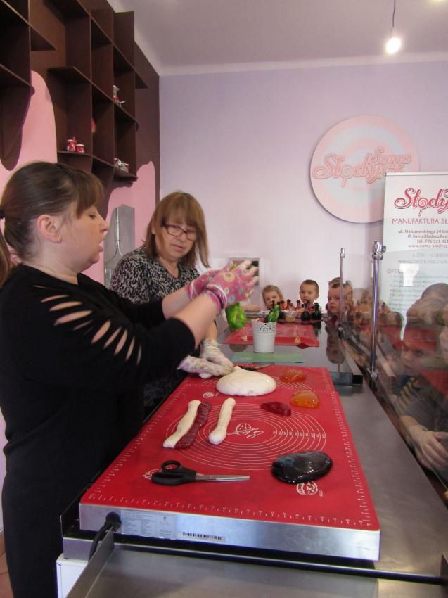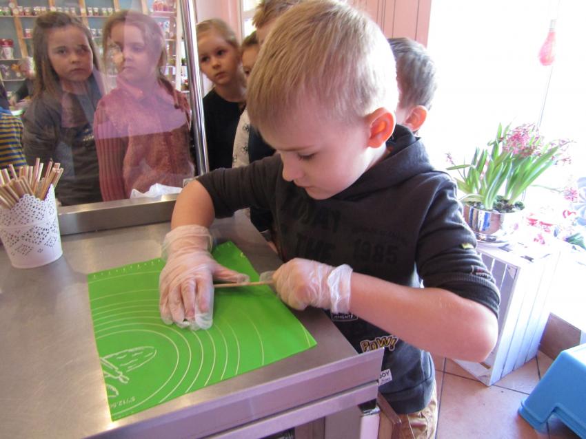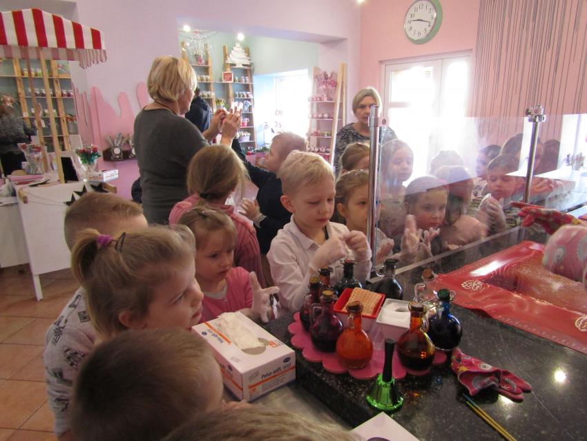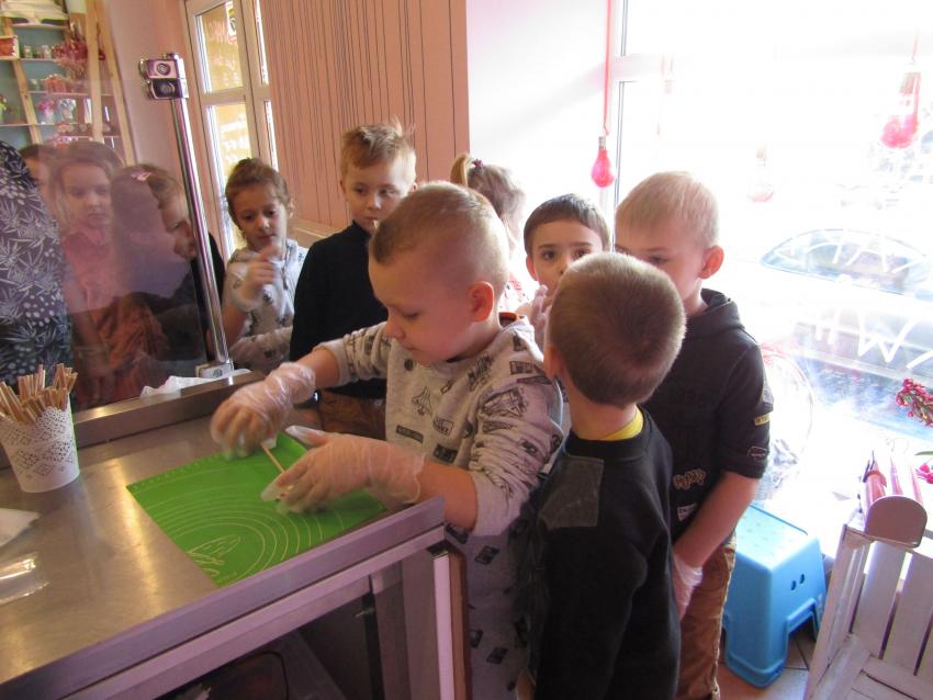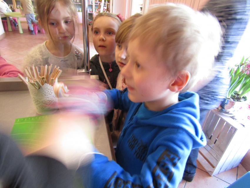 Z okazji Dnia Kobiet dzieci z grupy VI - Żabki, wybrały sie do manufaktury słodyczy "Sama słodycz" na warsztay z robienia lizaków. W kolorowej scenerii, półek pełnych słodkości, cukierków, lizaków uczyliśmy się o sposobie wytwarzania słodyczy. Dowiedzieliśmy się, jakie składniki są potrzebne do ich wytworzenia, które barwniki są naturalne i z czego pochodzą. Przygladaliśmy się także masie karmelowej, która z żółtej pod wpływem wyrabiania w powietrzu zamieniła się w białą. Razem z panią prowadzącą warsztaty wykonaliśmy samodzielnie lizaki, które pięknie zapakowaliśmy i z dumą prezentowaliśmy kolegom i koleżankom. Na koniec każde z dzieci otrzymało słodkie upominki i mogło dokonać samodzielnie zakupu wybranych słodkości. Po powrocie utrwaliliśmy sobie wiedzę na temat wytwarzania cukierków oraz rysowaliśmy według własnego pomysłu lizaki. To był słodki dzień. Chlopcy życzyli swoim koleżankom spełnienia marzeń i pięknych prezentów. Dziękujemy naszym chłopcom za odśpiewanie "Sto lat".