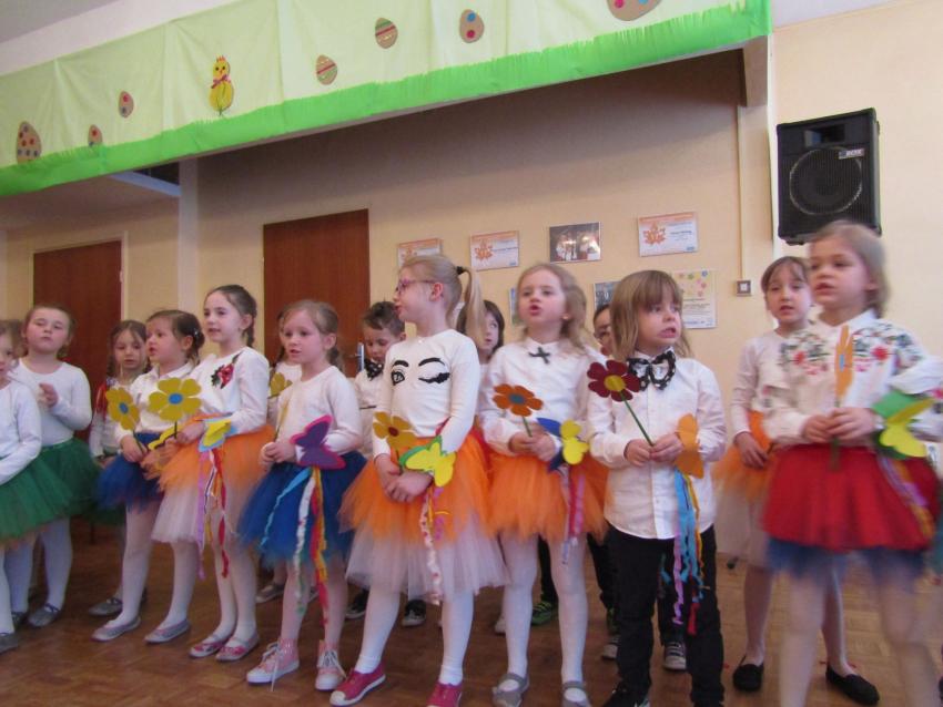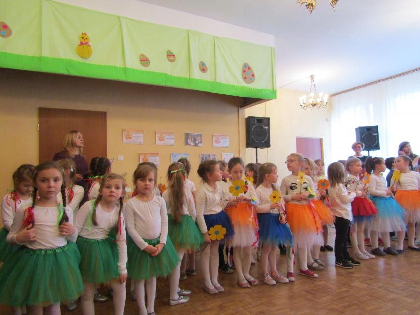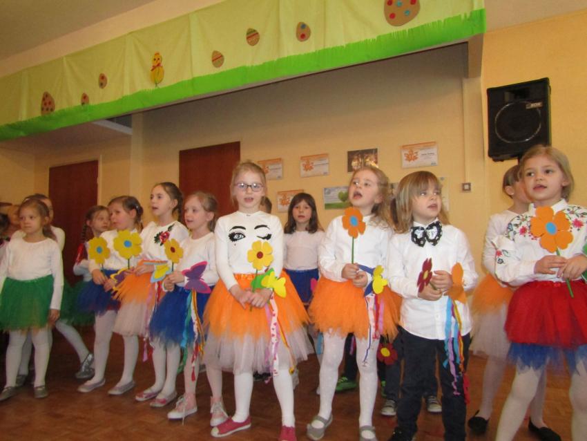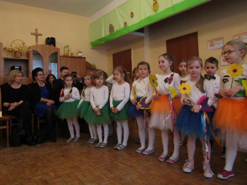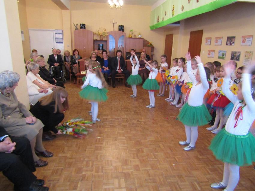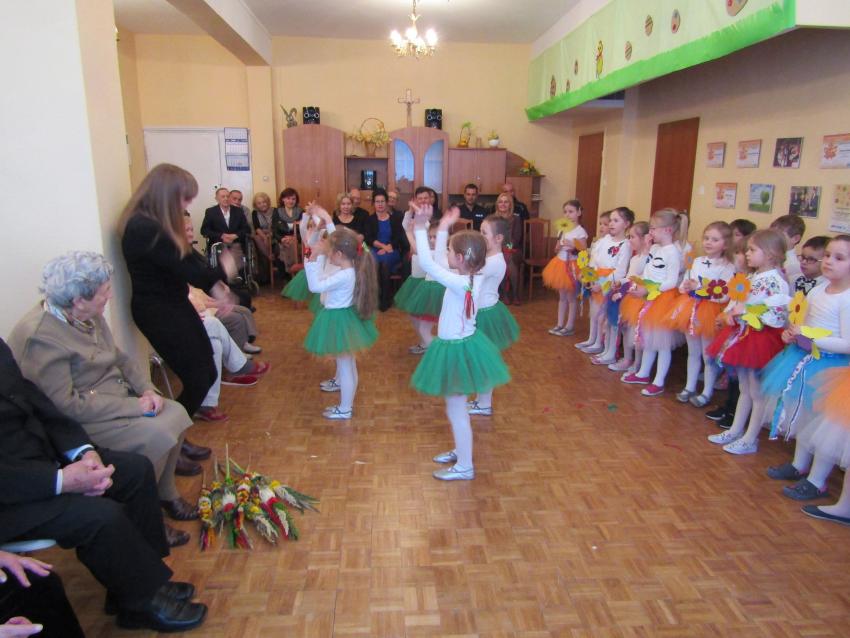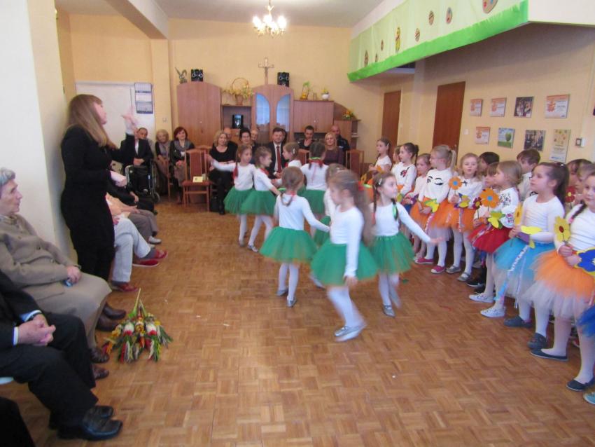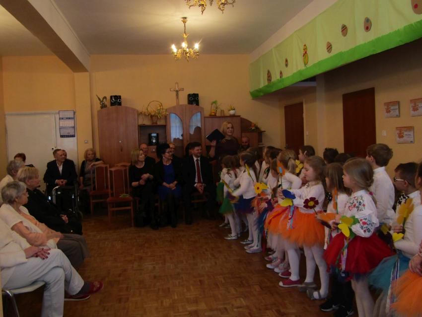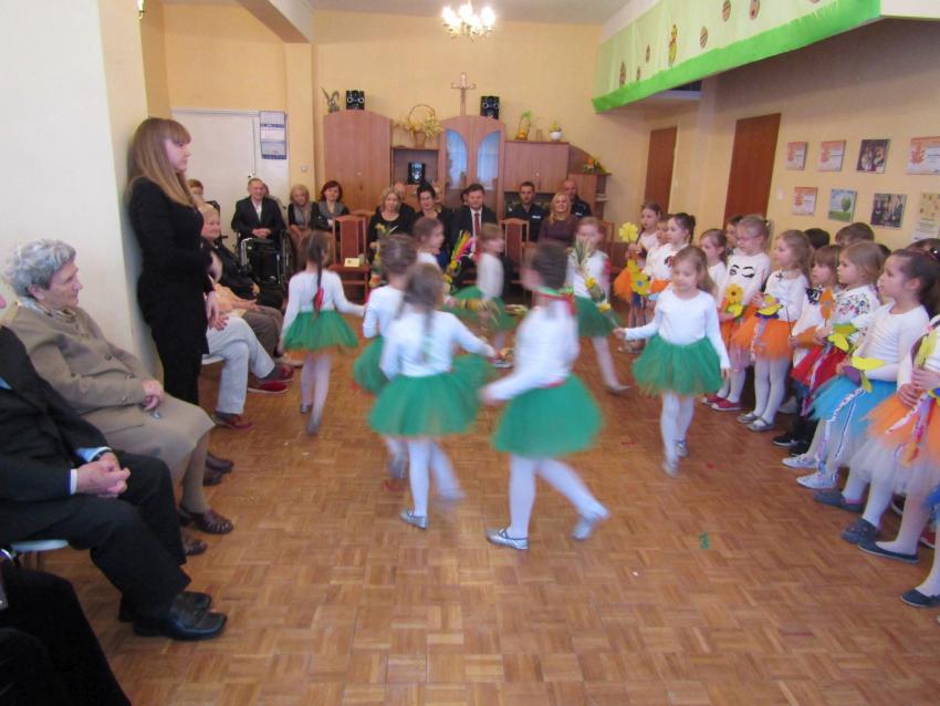 W dniu 28 marca 2018 roku dzieci z grupy IX i VI wystąpiły dla pensjonariuszy Domu Opieki Społecznej „Weterana Walki i Pracy” w Radomiu (ul. Wyścigowa 16) podczas uroczystego spotkania z okazji zbliżających się Świąt Wielkanocnych. W spotkaniu tym uczestniczyli m.in. przedstawiciele władz Miasta – Pan Jerzy Zawodnik – Zastępca Prezydenta Miasta Radomia oraz Pani Magdalena Lasota – Radna Rady Miejskiej w Radomiu, ksiądz z Parafii Świętego Brata Alberta oraz przedstawiciele Komendy Miejskiej Policji w Radomiu. Dzieci przedstawiły zwyczaje i tradycje związane z Wielkanocą, recytując wiersze, śpiewając piosenki i tańcząc. Wszyscy oglądający występ byli zachwyceni pięknymi strojami, w które dzieci były ubrane i wysokim poziomem występu. Występ naszych dzieci przyniósł pensjonariuszom i zaproszonym gościom wiele niezapomnianych chwil wzruszeń, wywołał uśmiechy na ich twarzach.